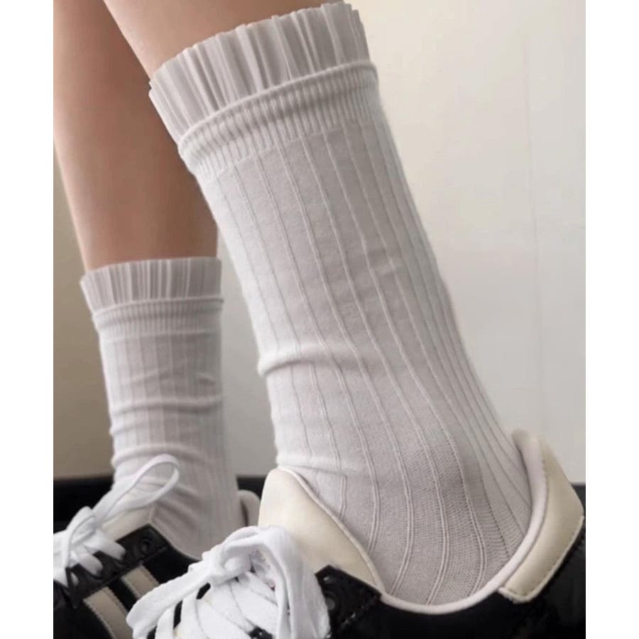 プリーツフリルが目を惹くリブ編みのミドル丈ソックス。