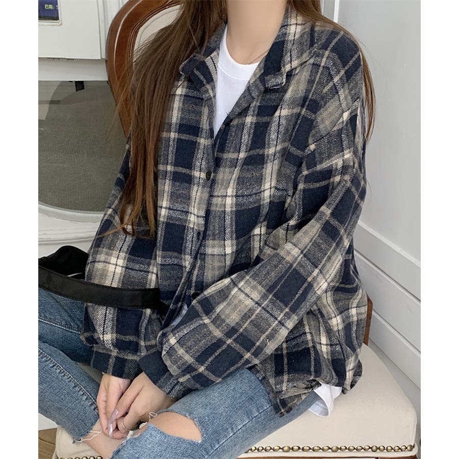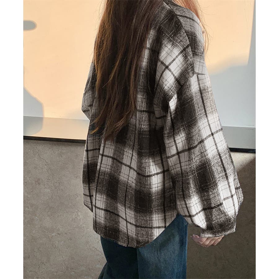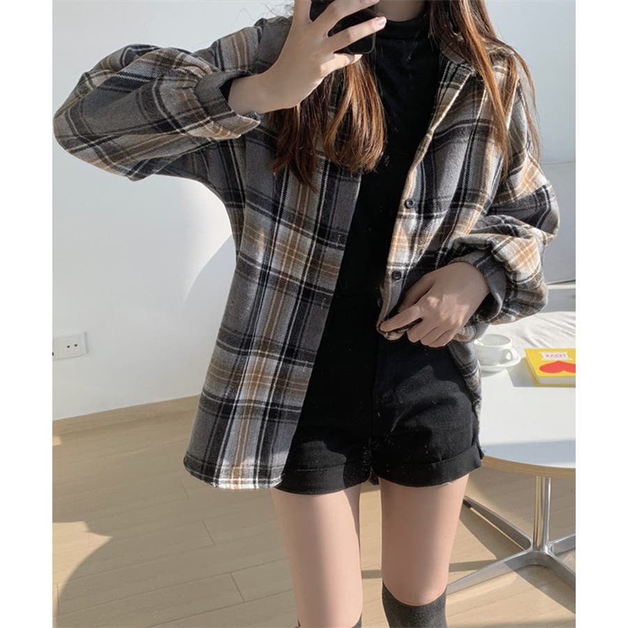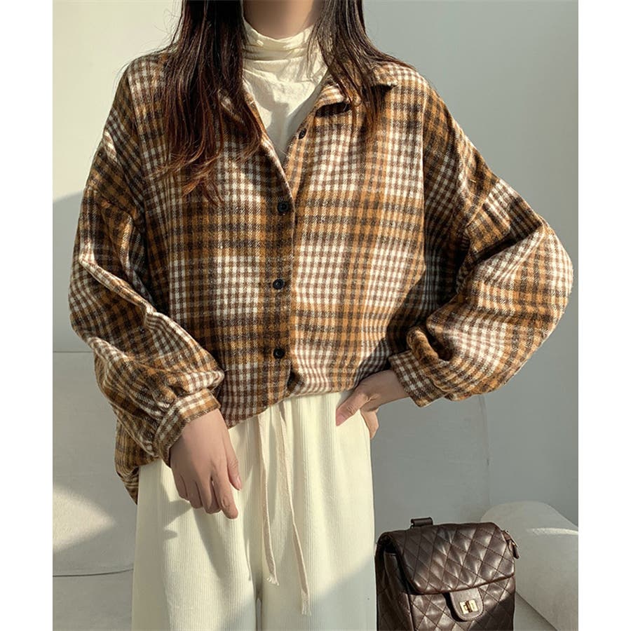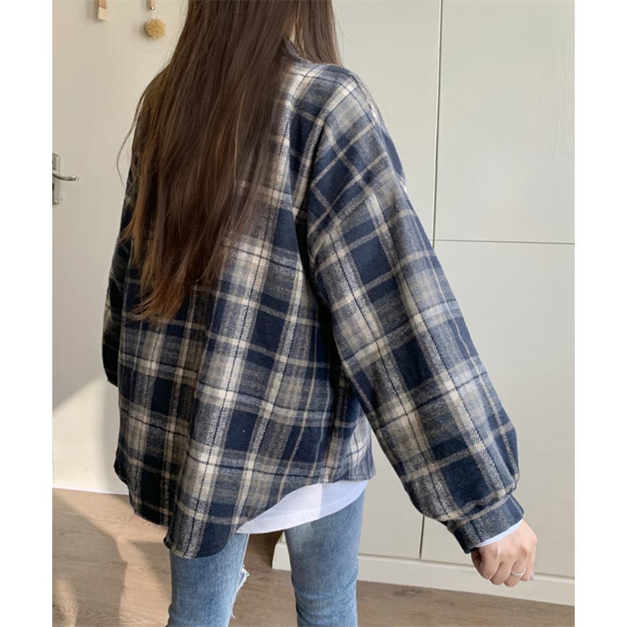 チェック柄羽織り秋 着やせシャツ韓国風 起毛シャツブラウス