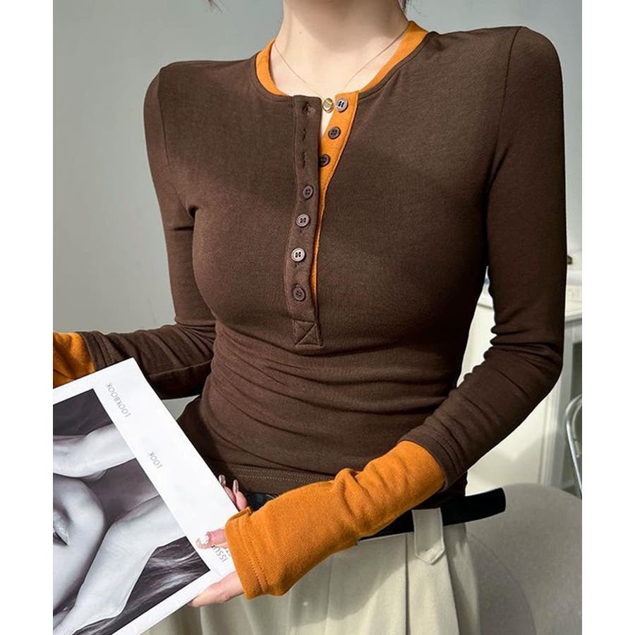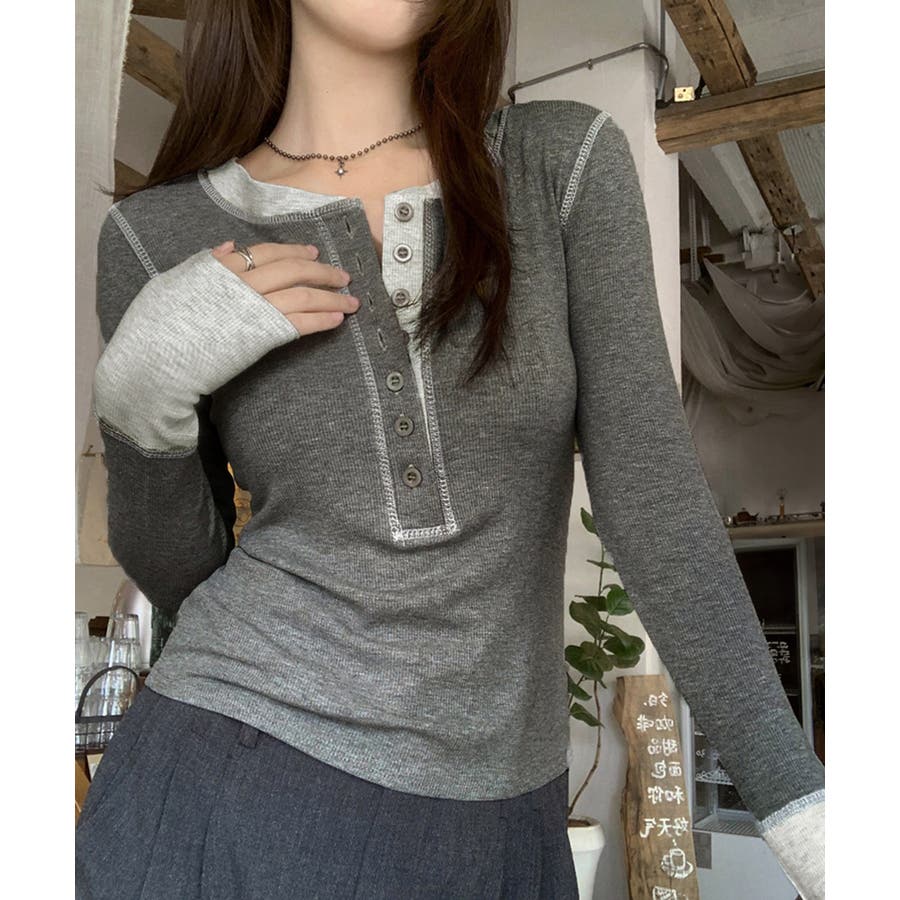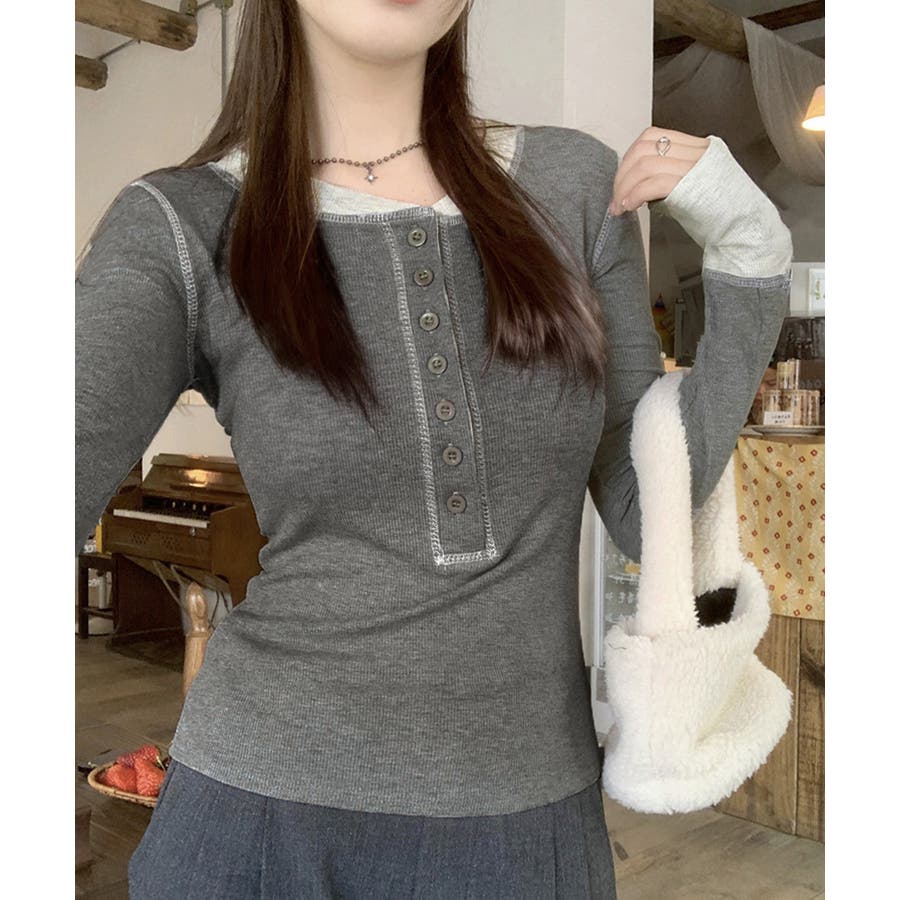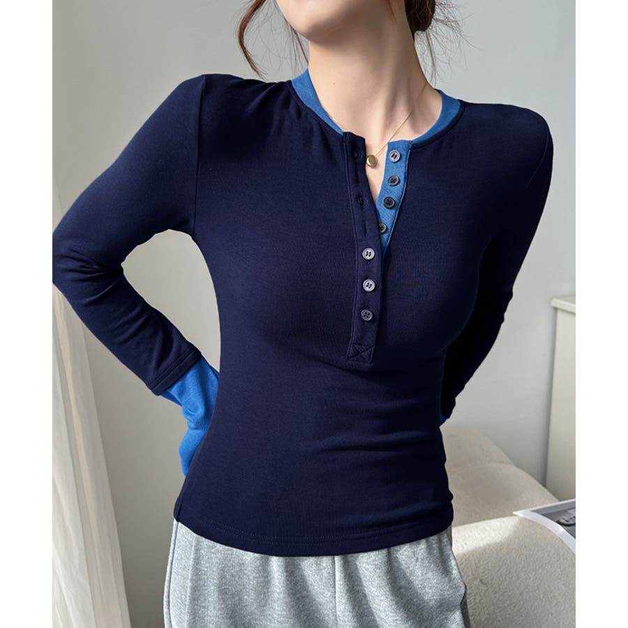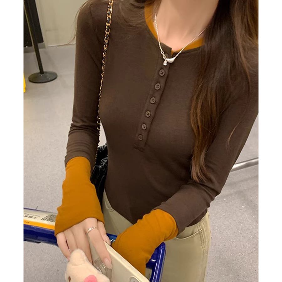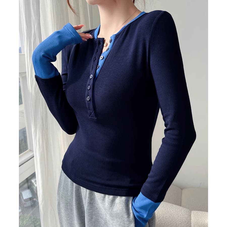 レディース バイカラーヘンリーネックTシャツ レイヤード風リブトップス 長袖タイトtシャツ シンプル細見え着回しトップス