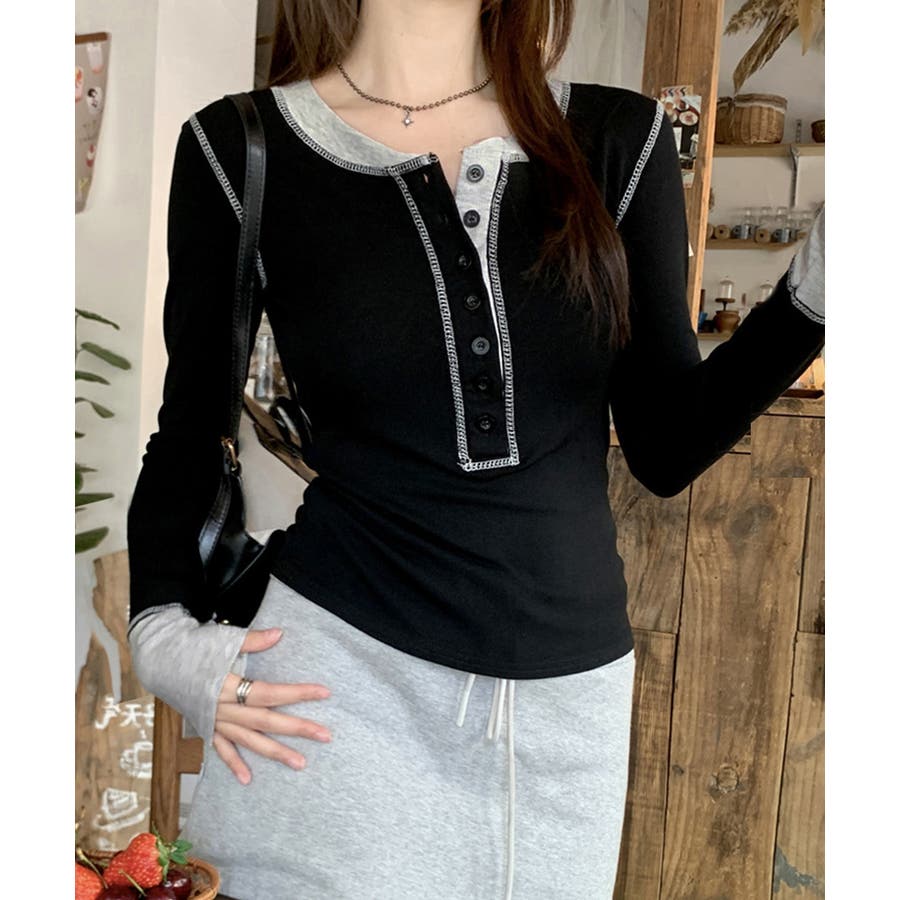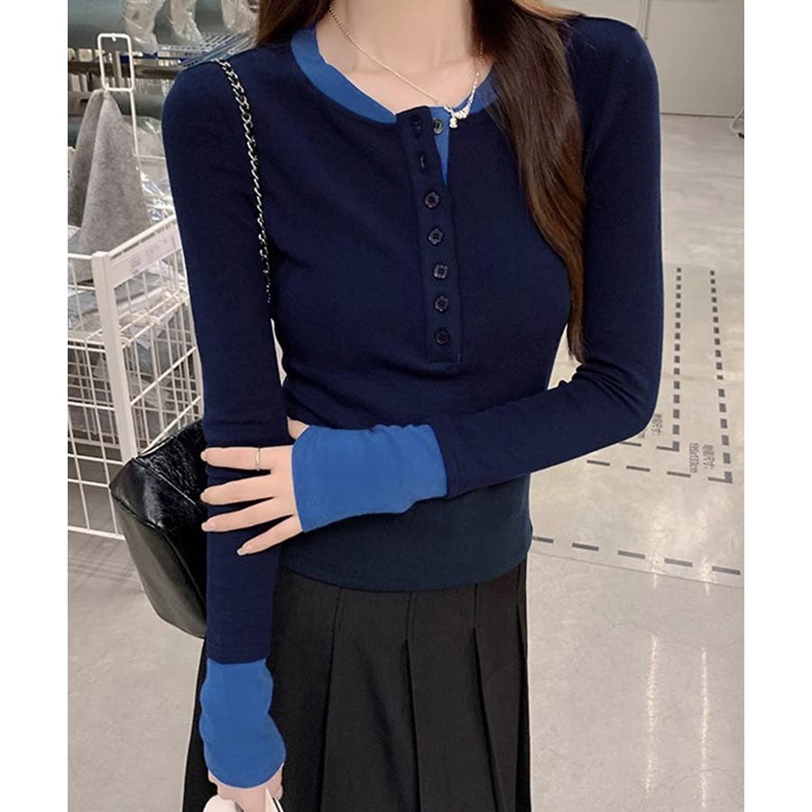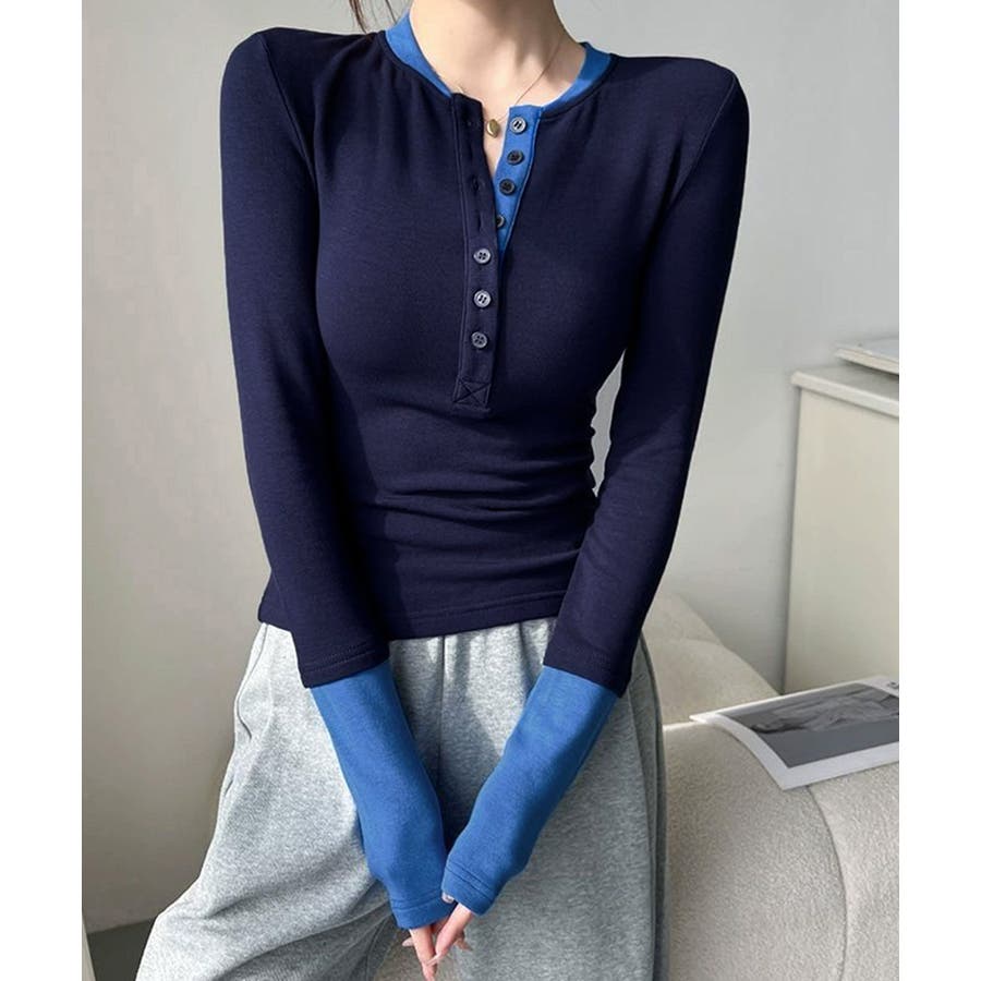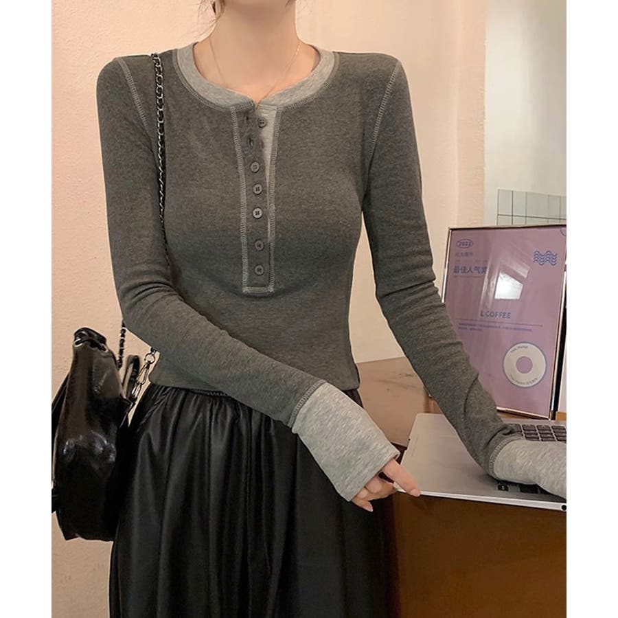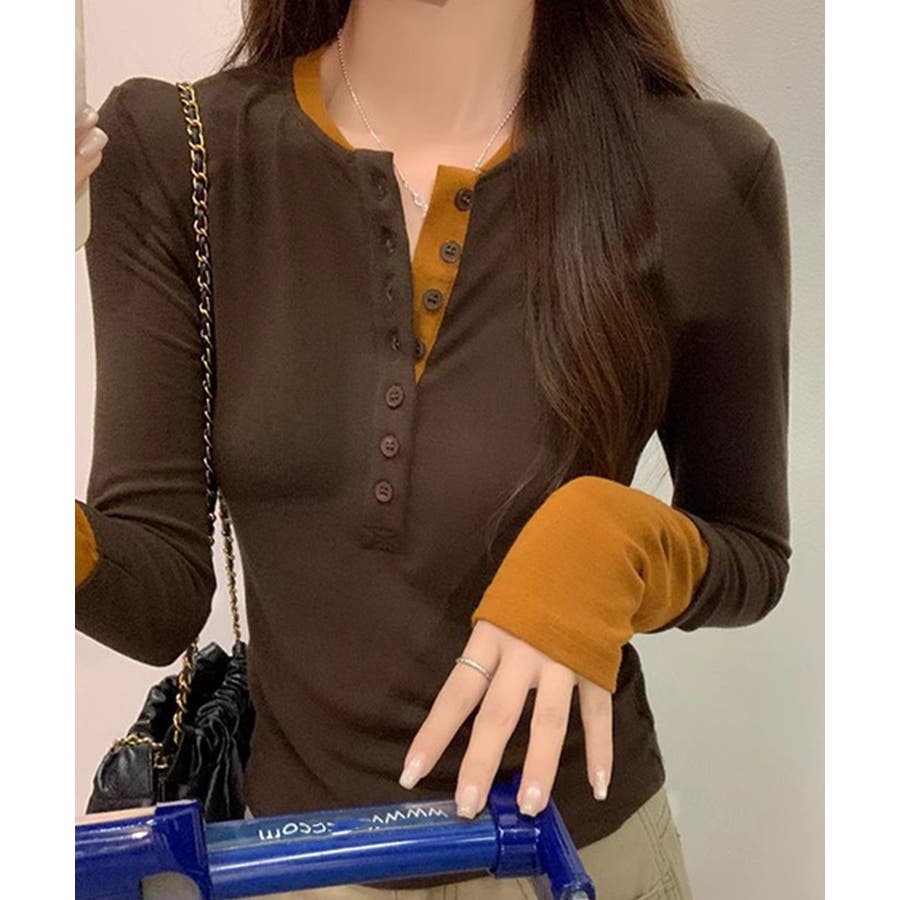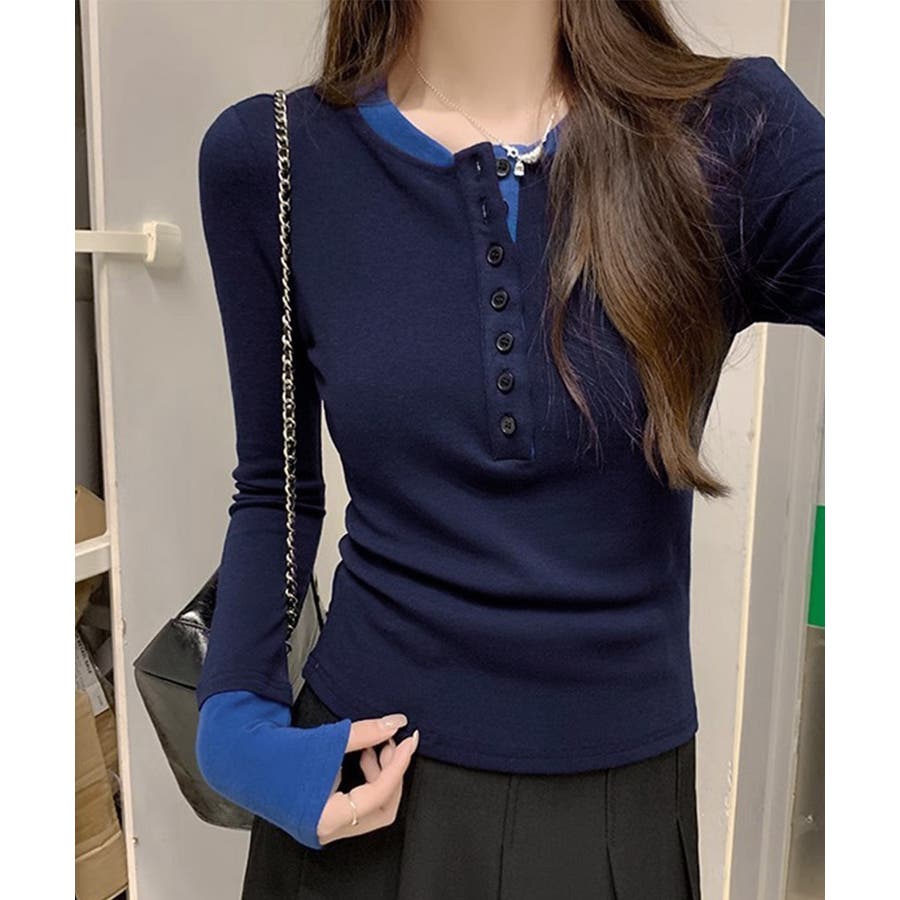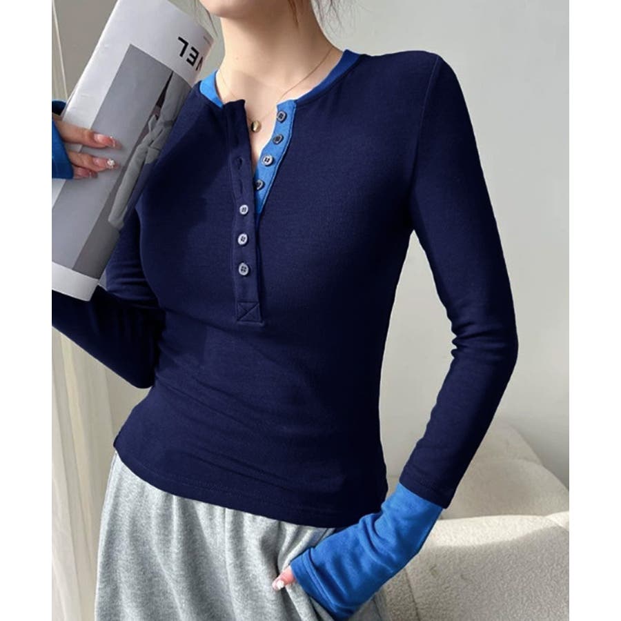 レディース バイカラーヘンリーネックTシャツ レイヤード風リブトップス 長袖タイトtシャツ シンプル細見え着回しトップス