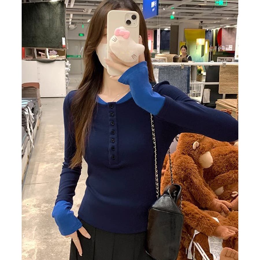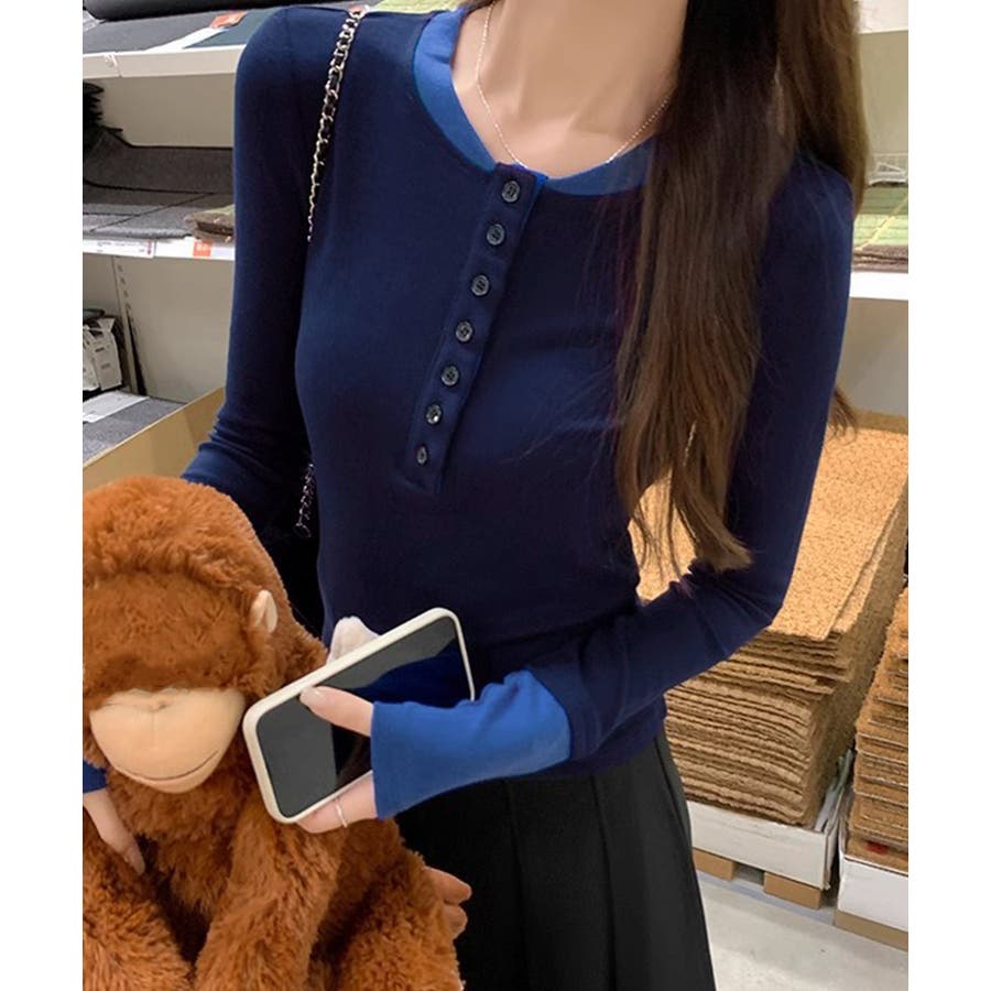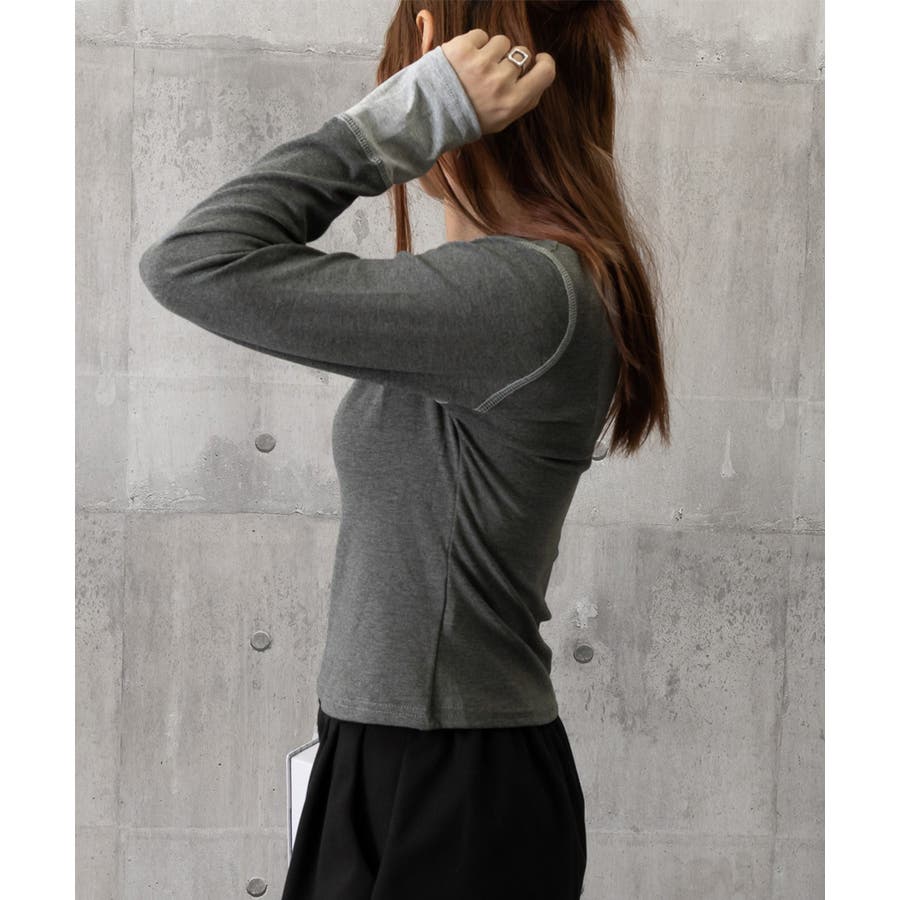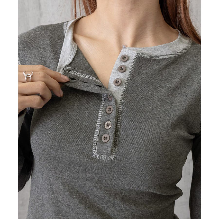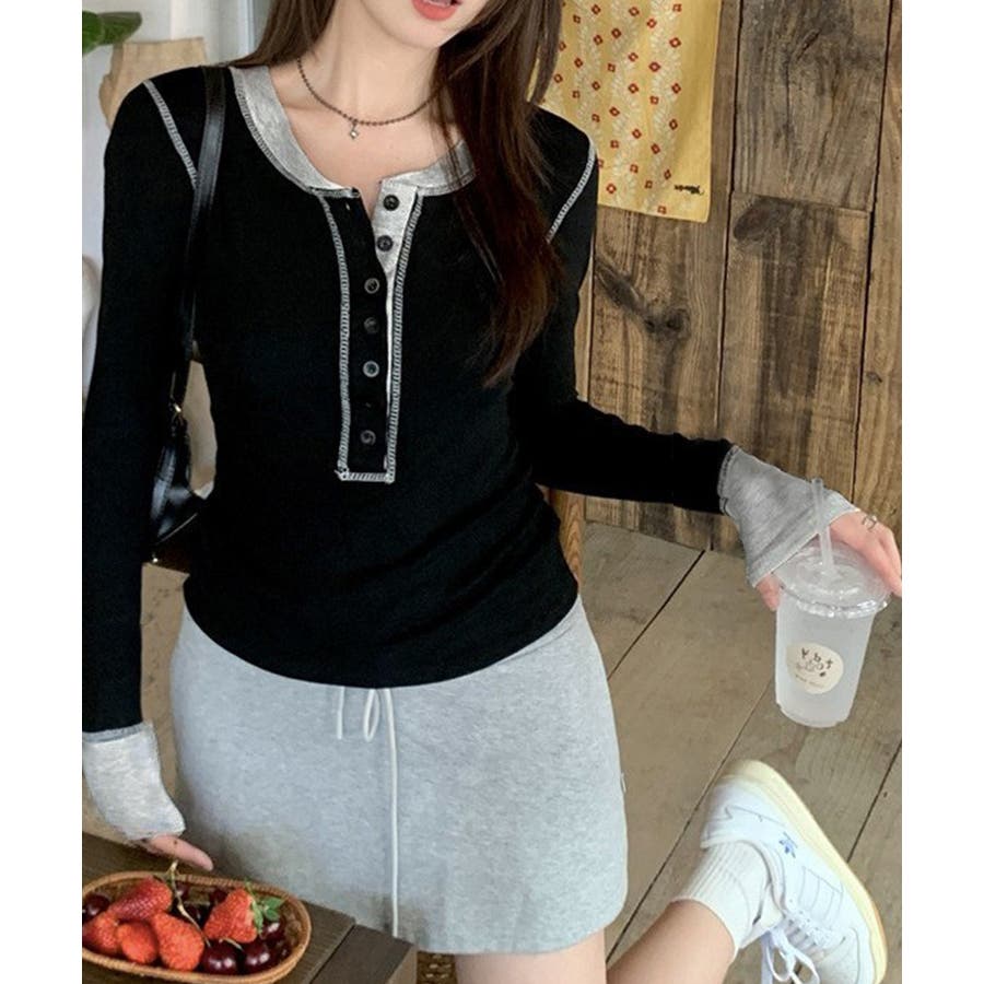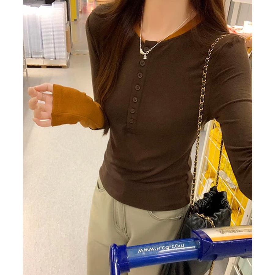 レディース バイカラーヘンリーネックTシャツ レイヤード風リブトップス 長袖タイトtシャツ シンプル細見え着回しトップス