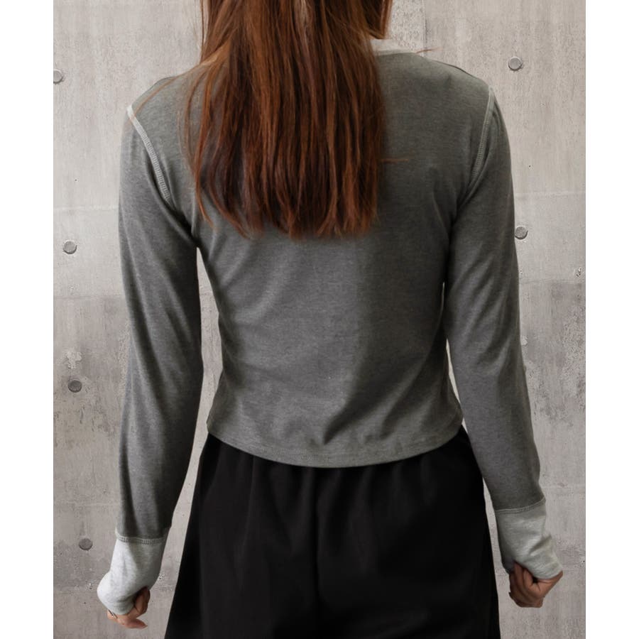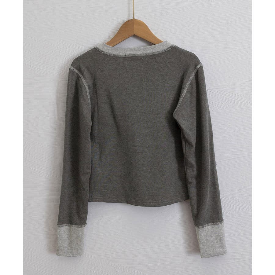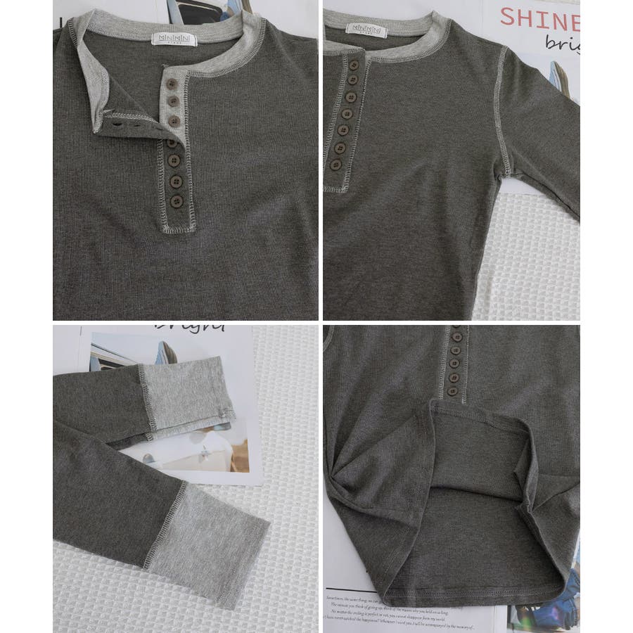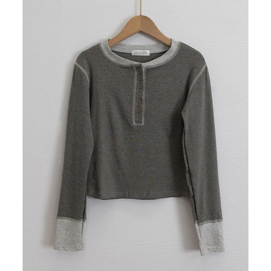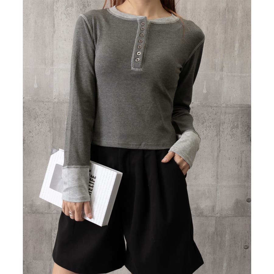 配色のコントラストが映えるリブ編みのヘンリーネックカットソー。