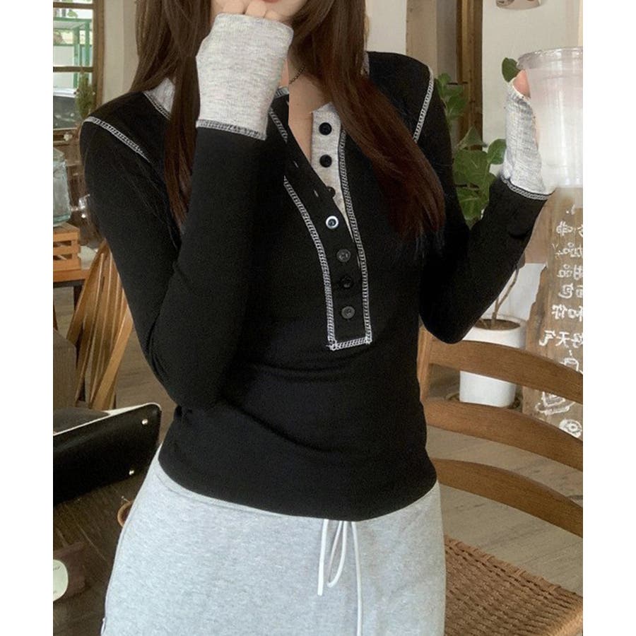 細身カットソー無地 フロントボタン秋服 着やせtシャツ 黒
