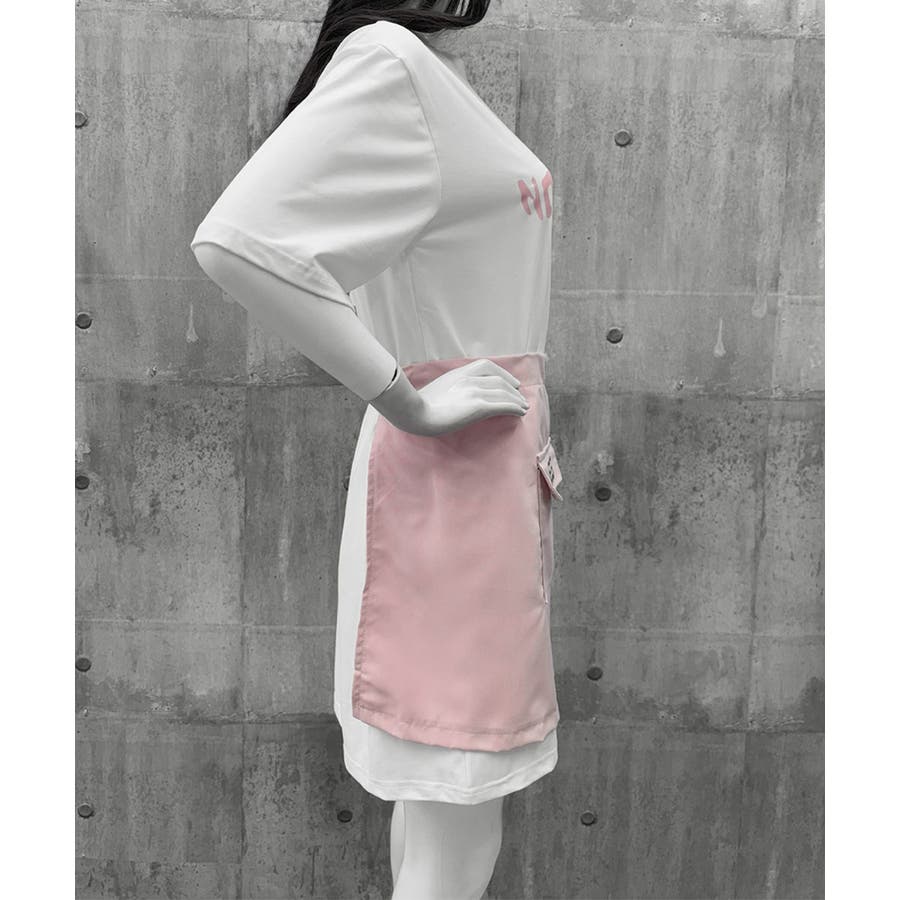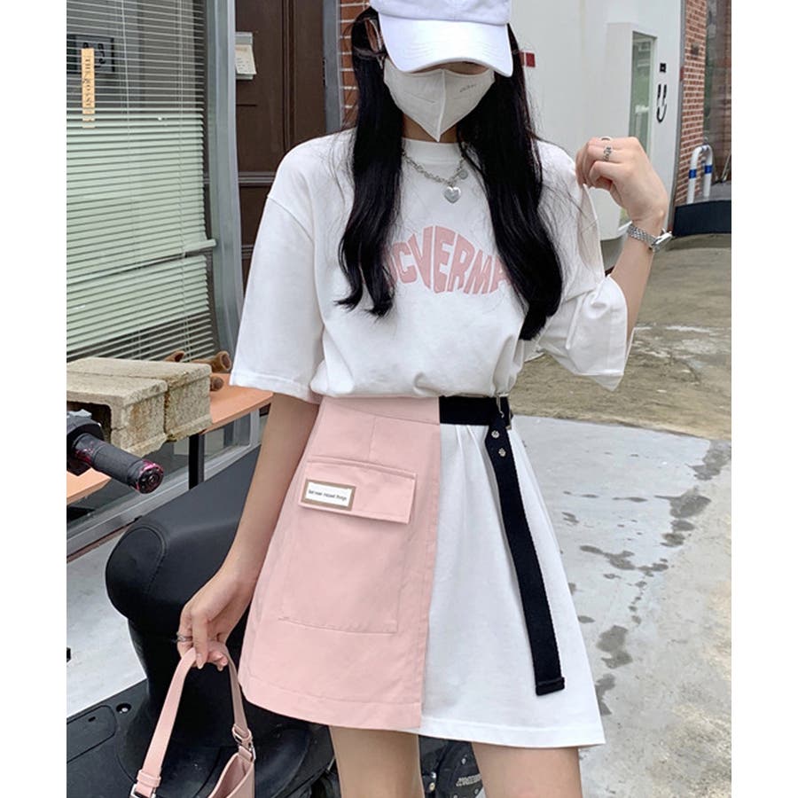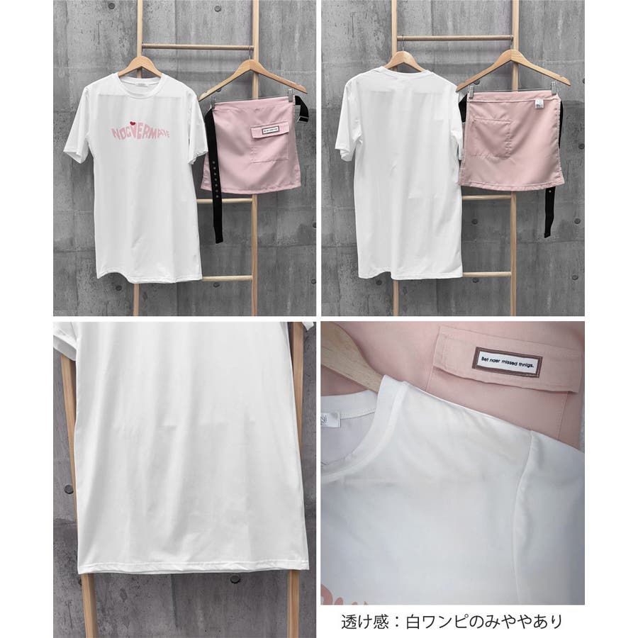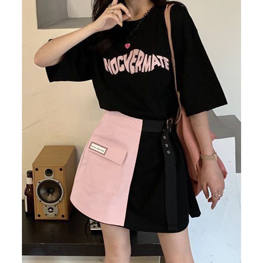 半袖ロング丈のロゴTシャツワンピースとラップ巻き風ミニスカートがセットになった、個性的でおしゃれな2点セットアップ。