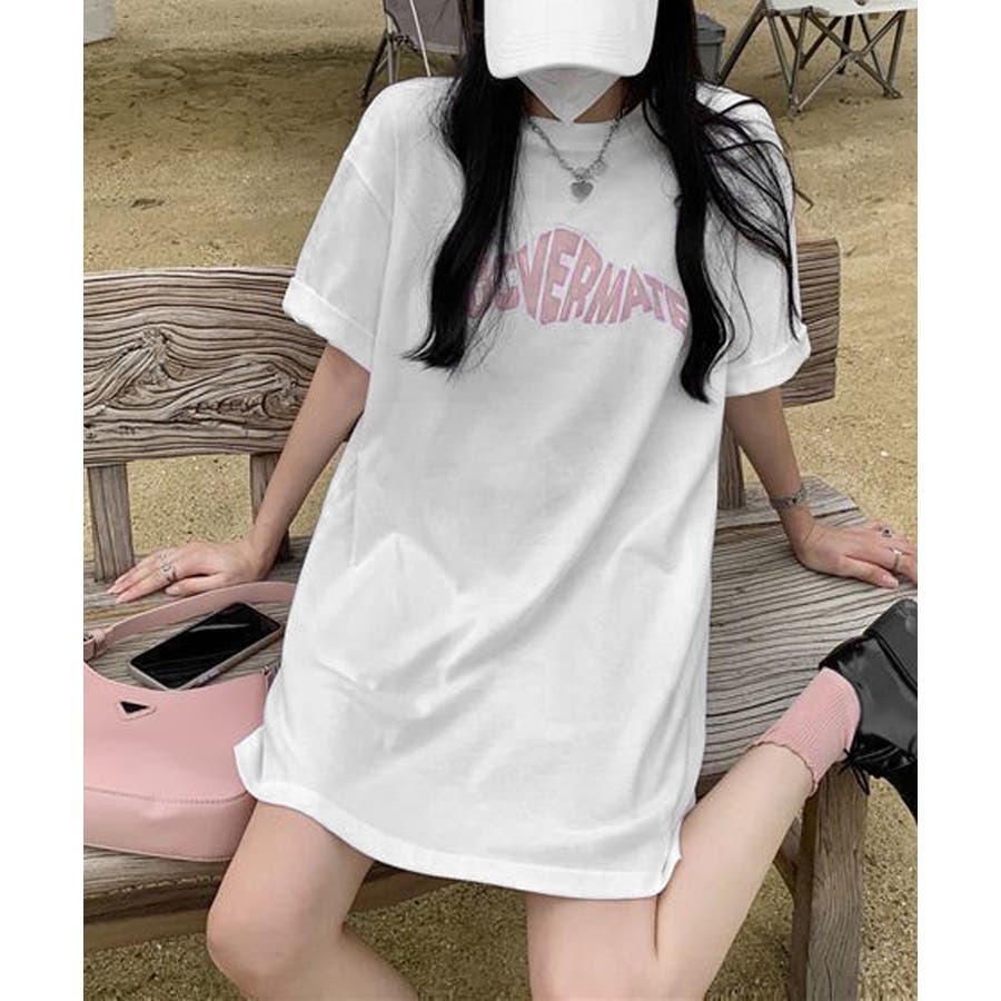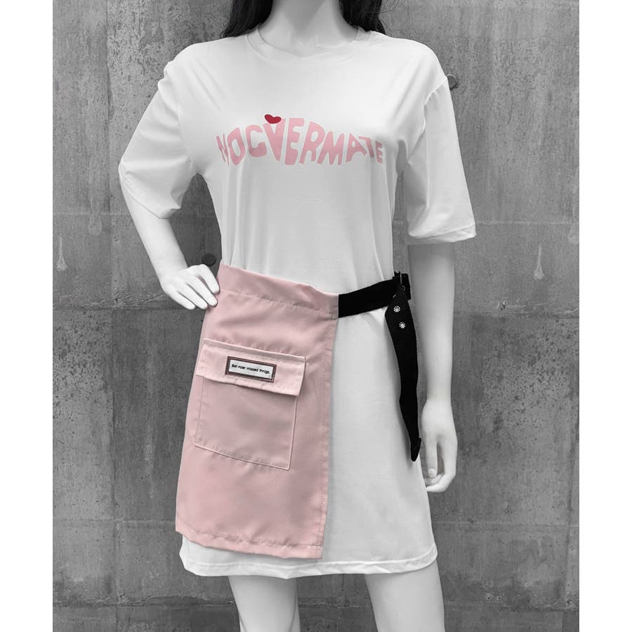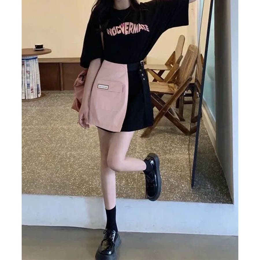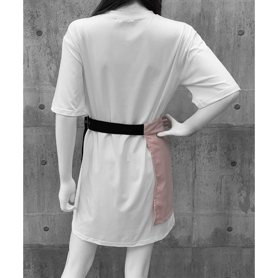半袖ロング丈のロゴTシャツワンピースとラップ巻き風ミニスカートがセットになった、個性的でおしゃれな2点セットアップ。