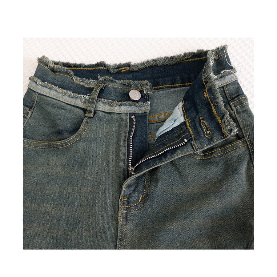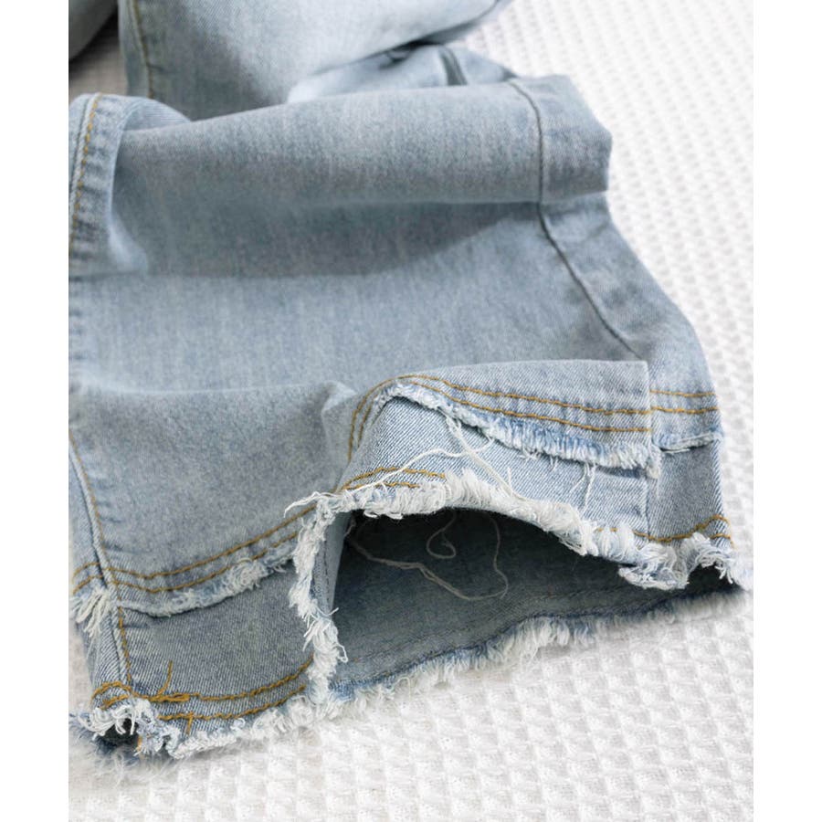 カットオフの裾や履き込んだようなシェービング加工が、スタイリングのアクセントに