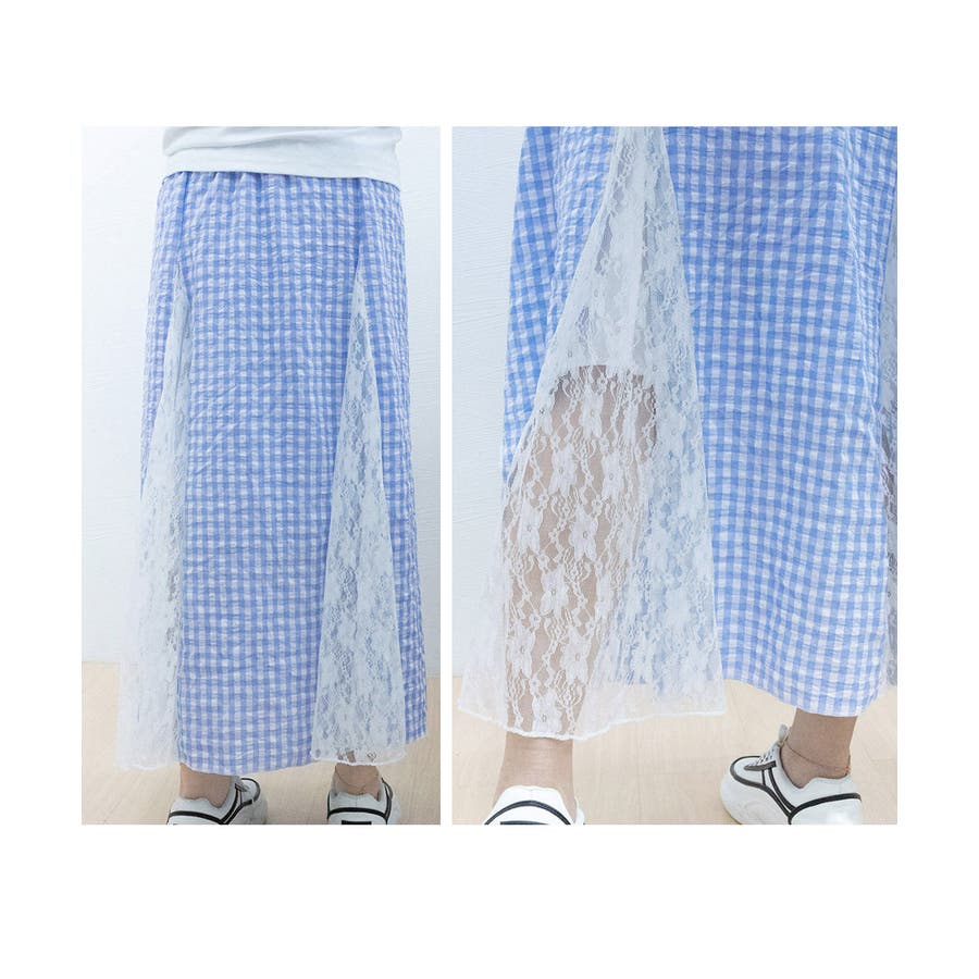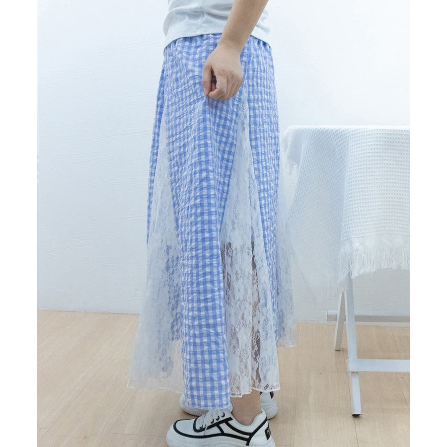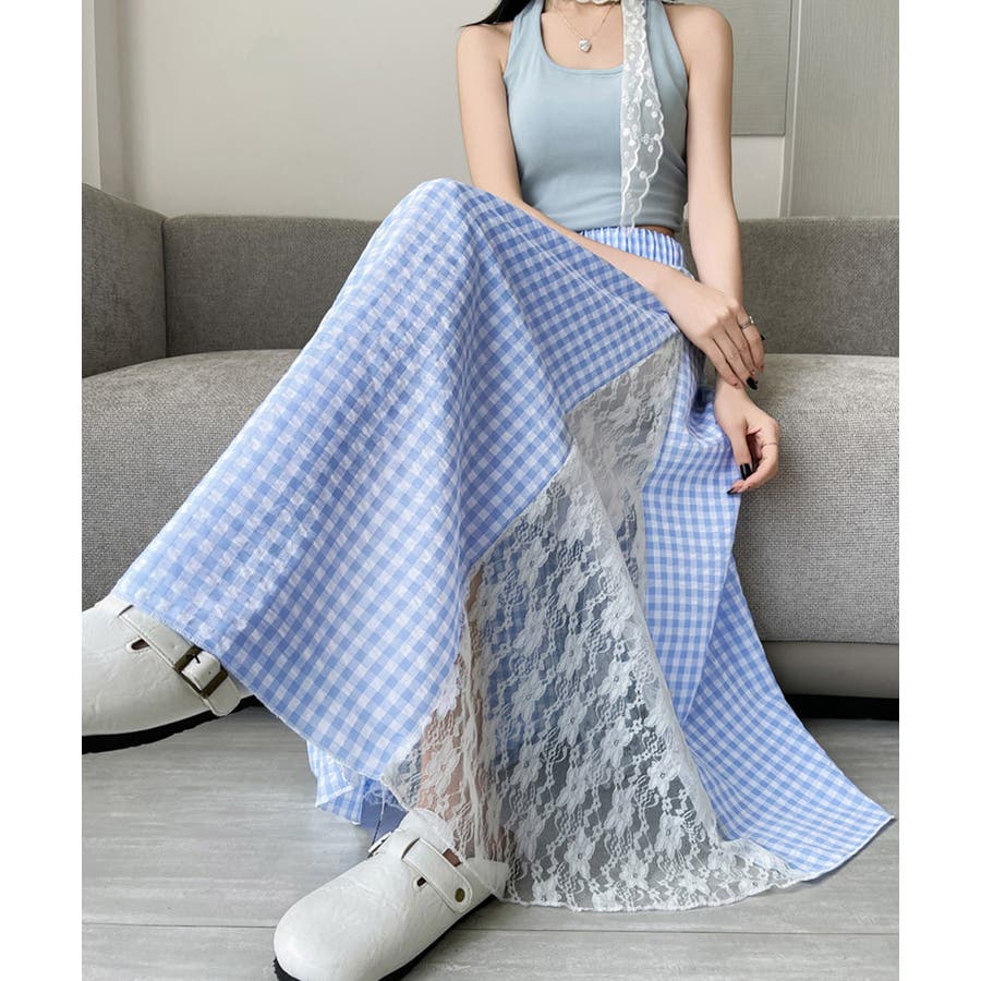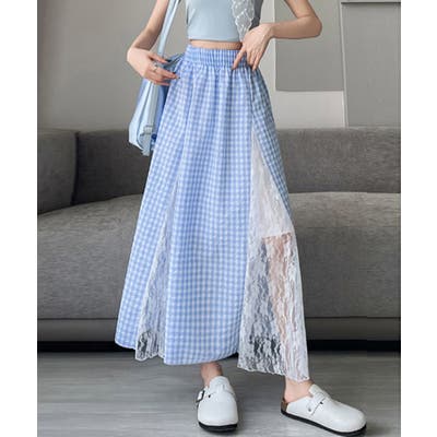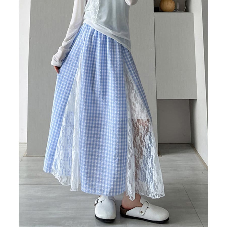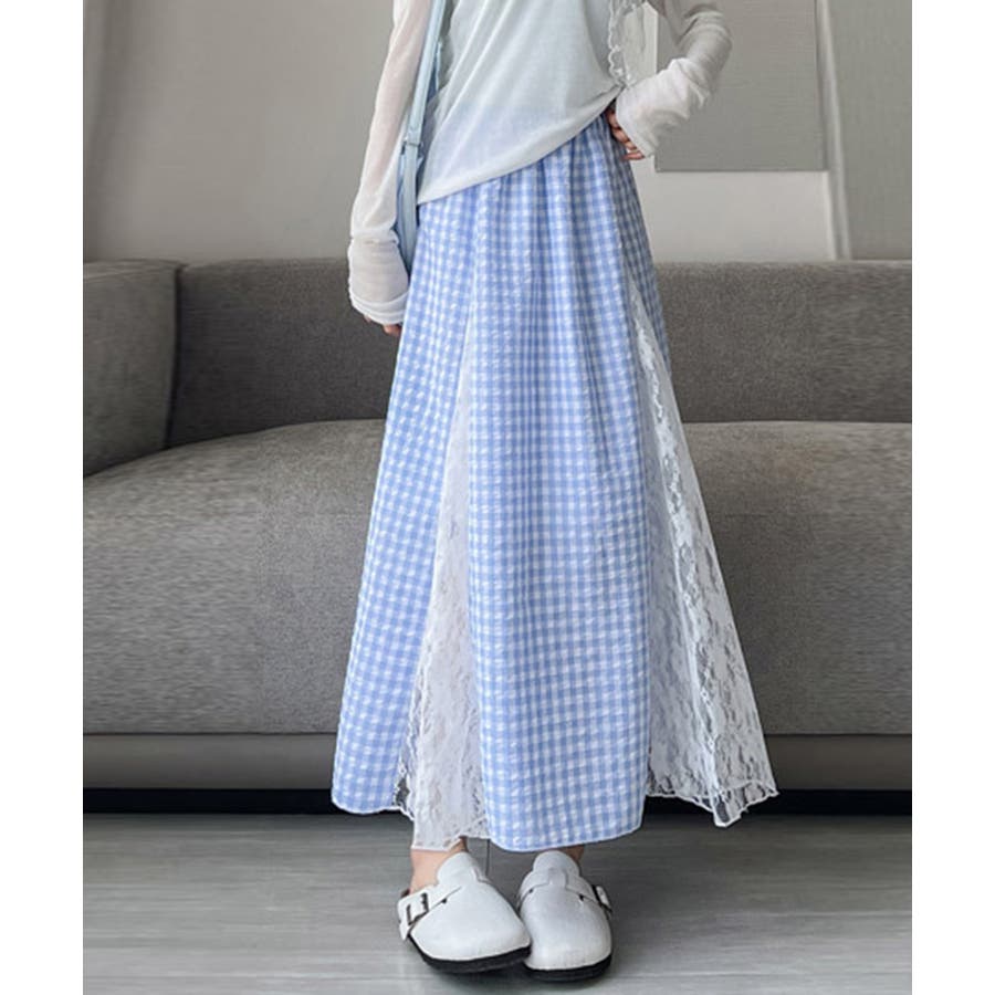 花柄レース&チェック生地の切替が目を惹くロングスカート。