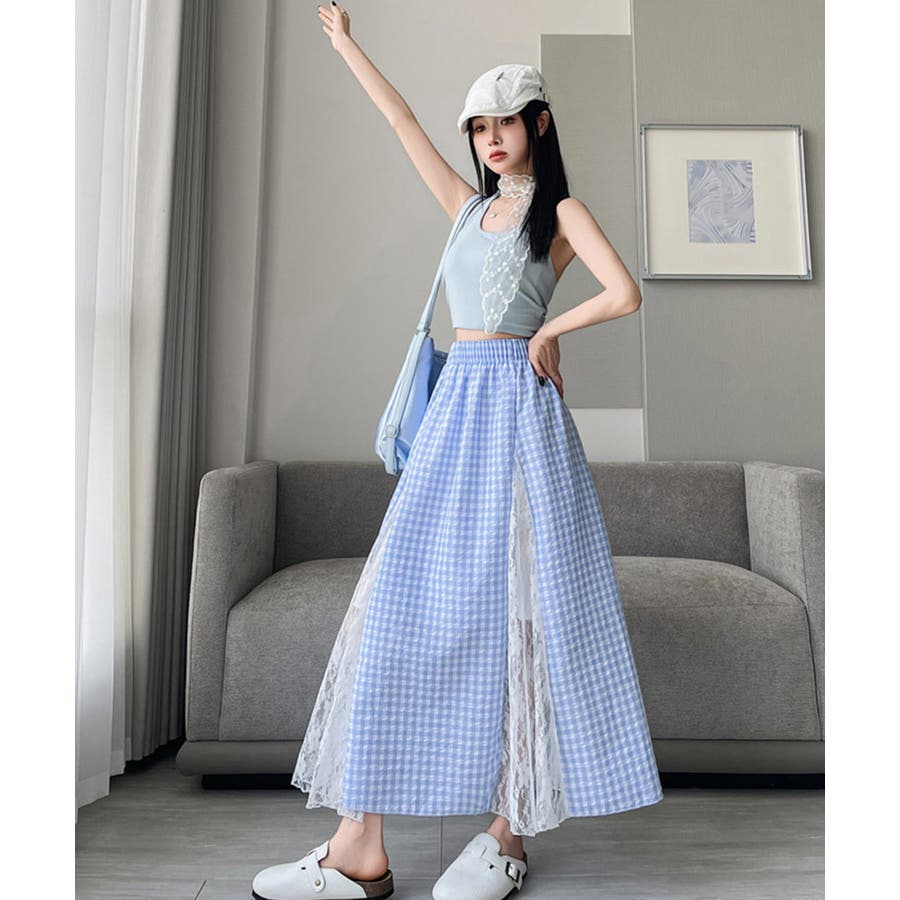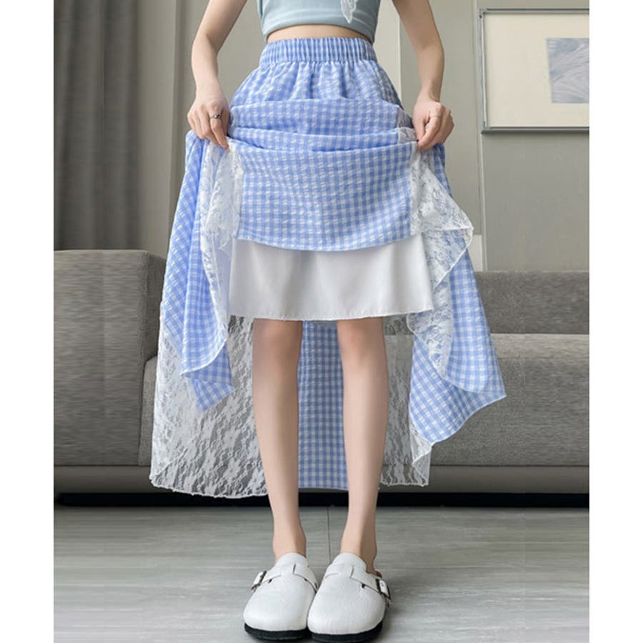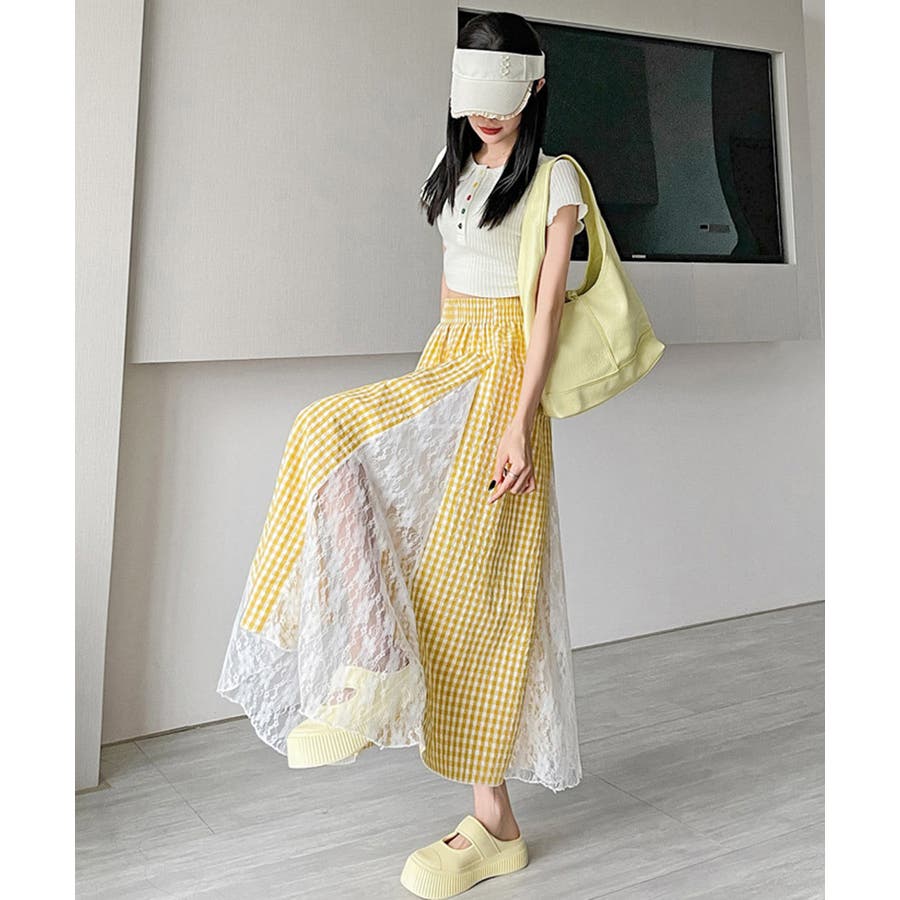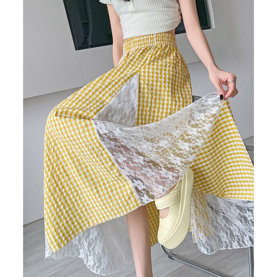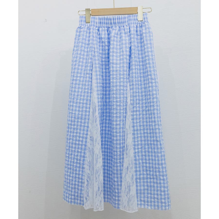 花柄レース&チェック生地の切替が目を惹くロングスカート。