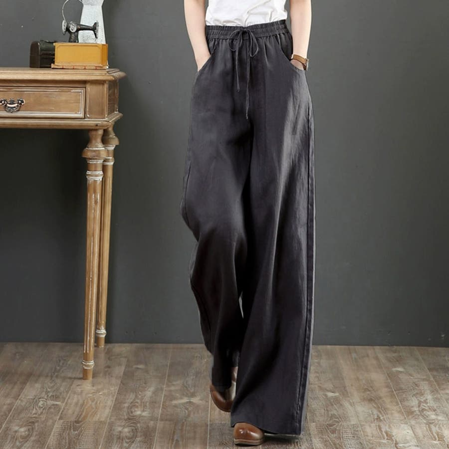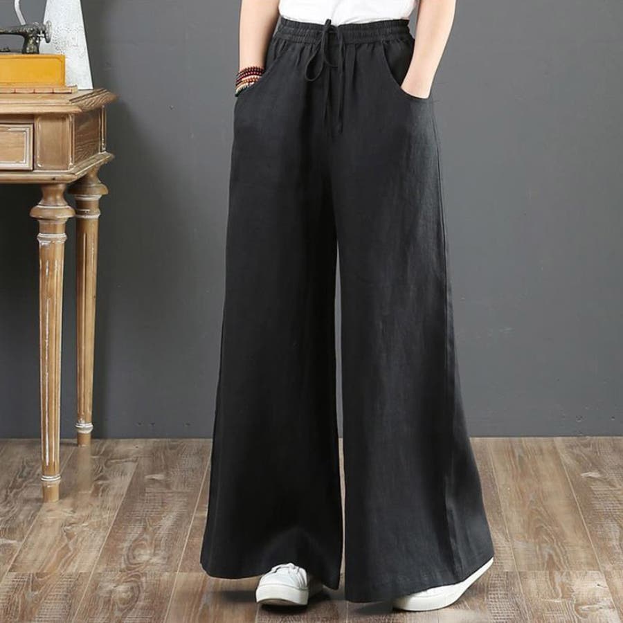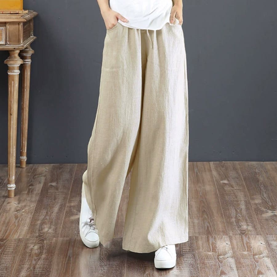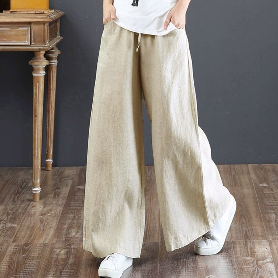 綿麻ワイドパンツ ロングパンツ春秋