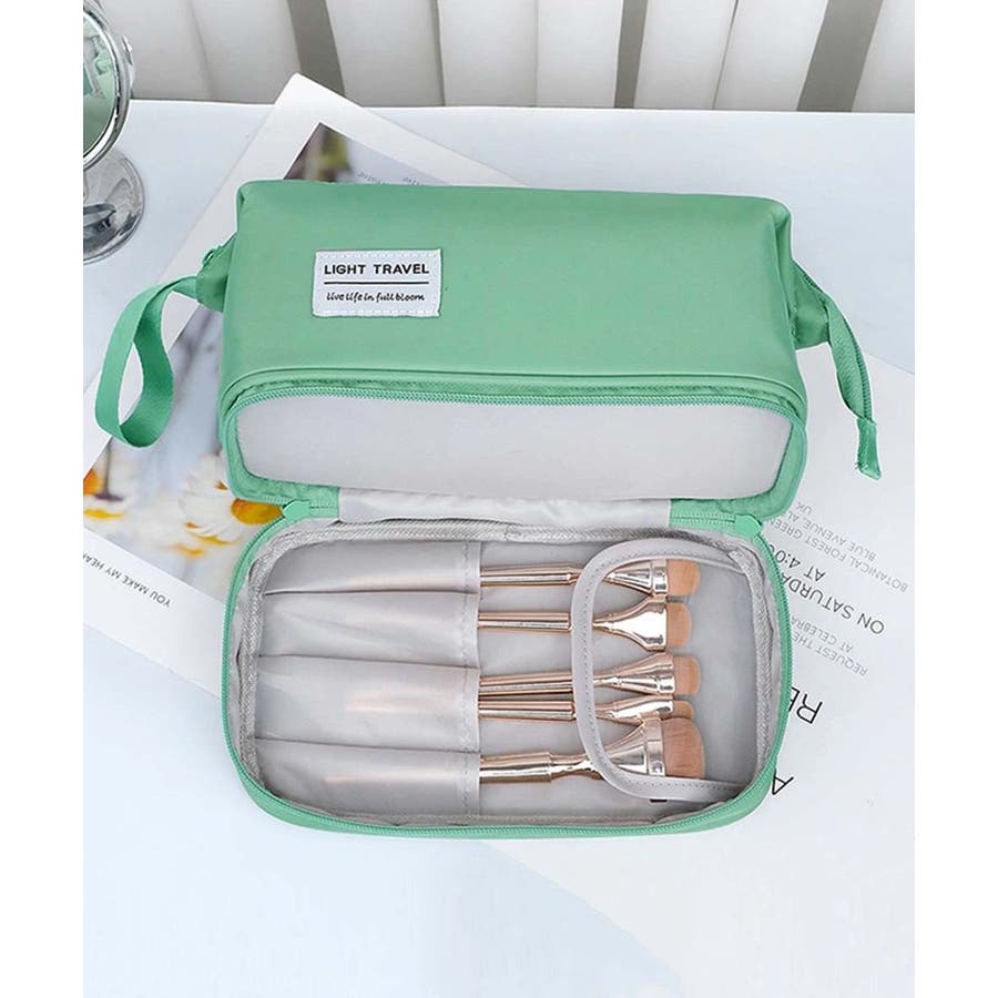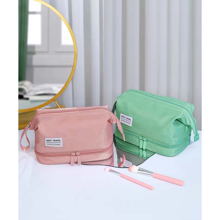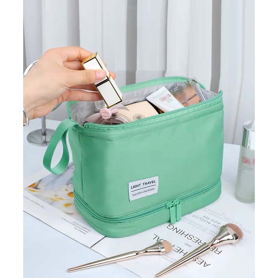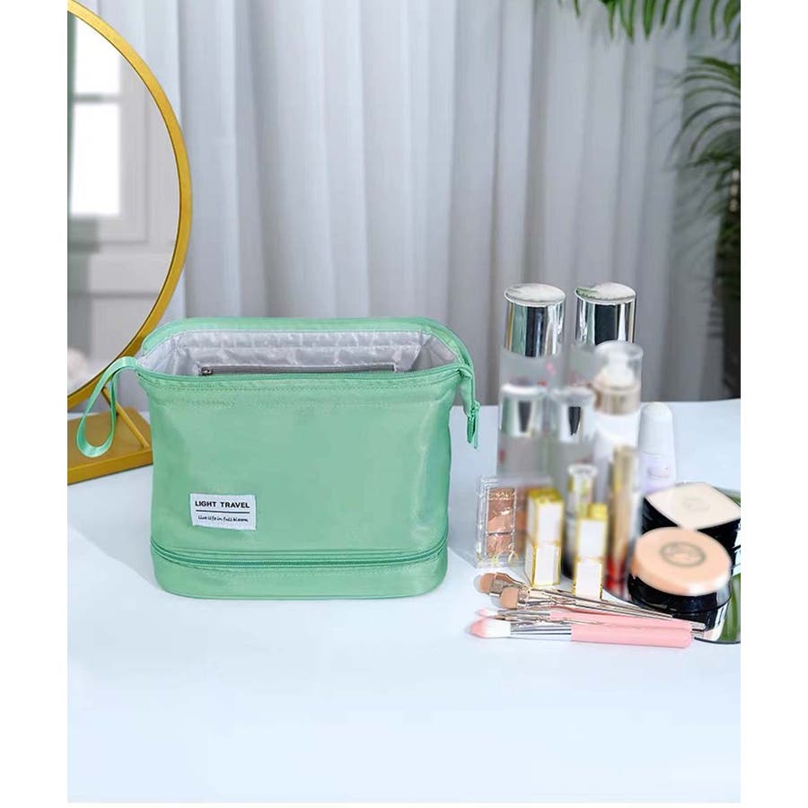 上下二段に分かれ、化粧品と化粧道具を別々に収納できる便利な大容量コスメポーチ
