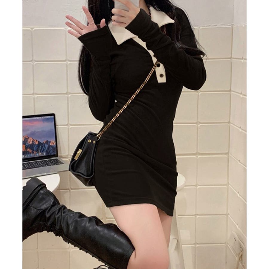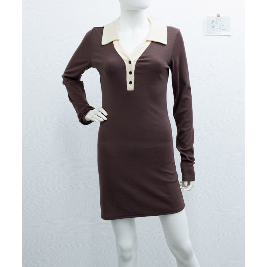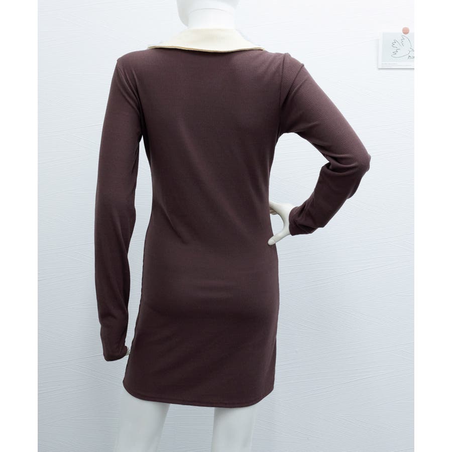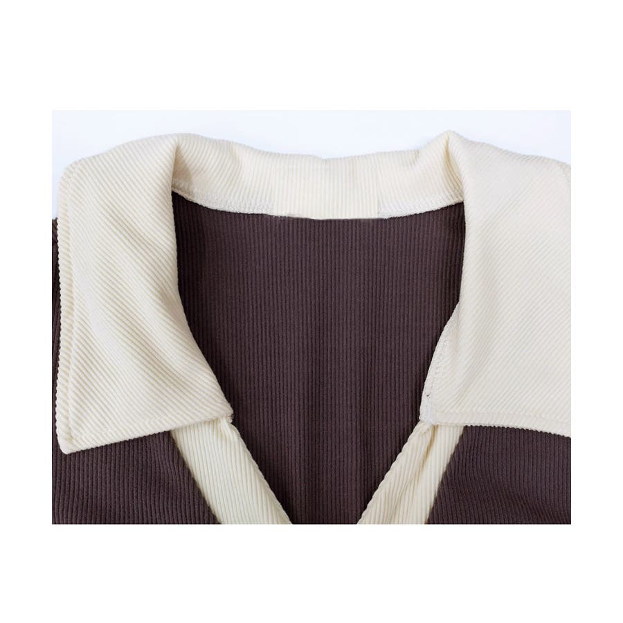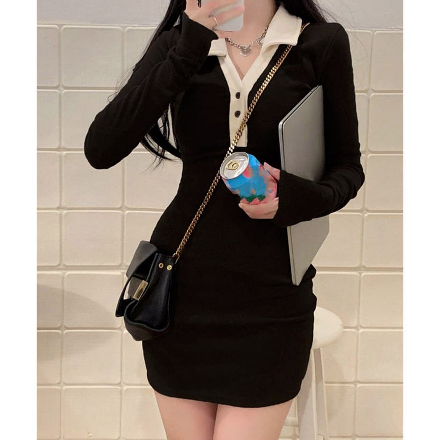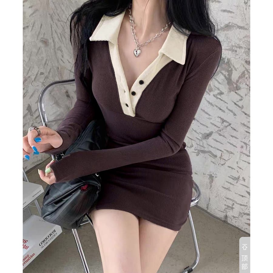 ポロネックミニワンピ 女性らしい Vネック レトロっぽ 柔らか 長袖 ポロ襟 セクシー おしゃれ ショート丈 ワンピース