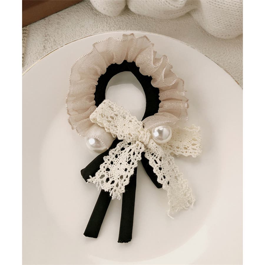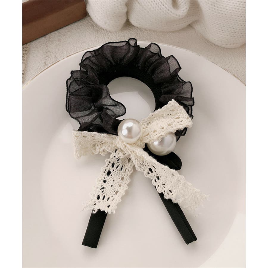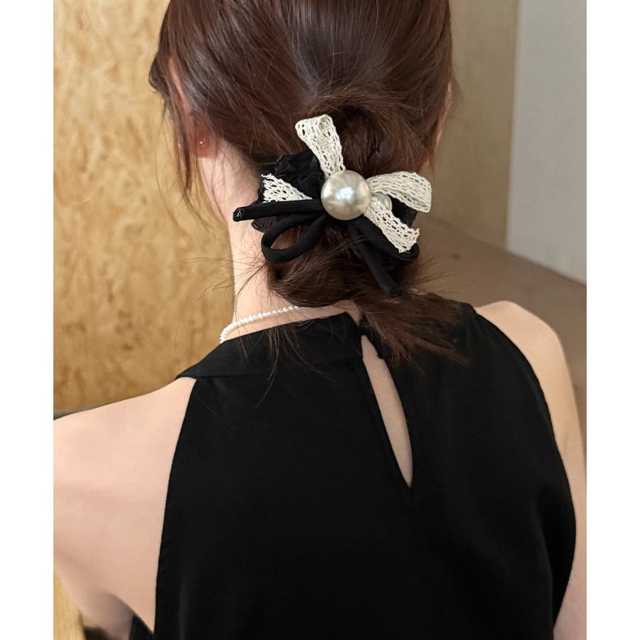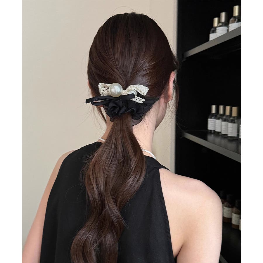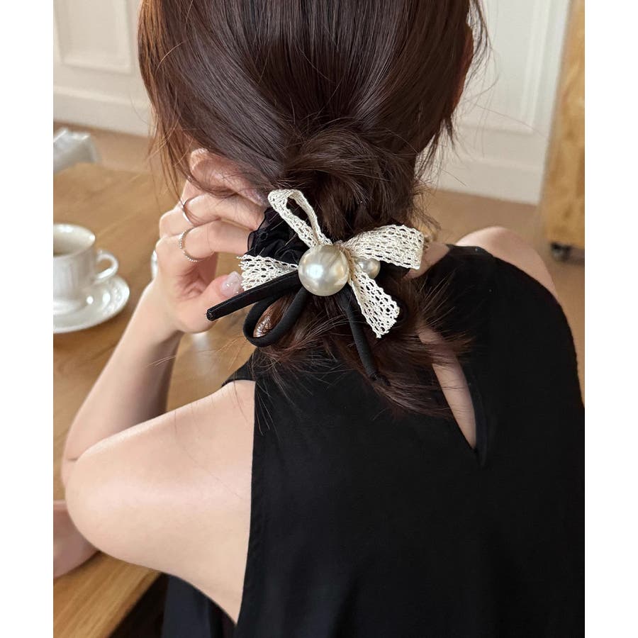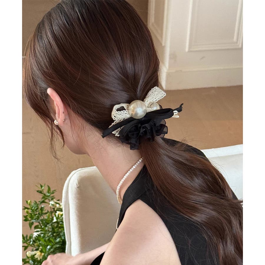パールとレースリボンが華やかなヘアゴム。