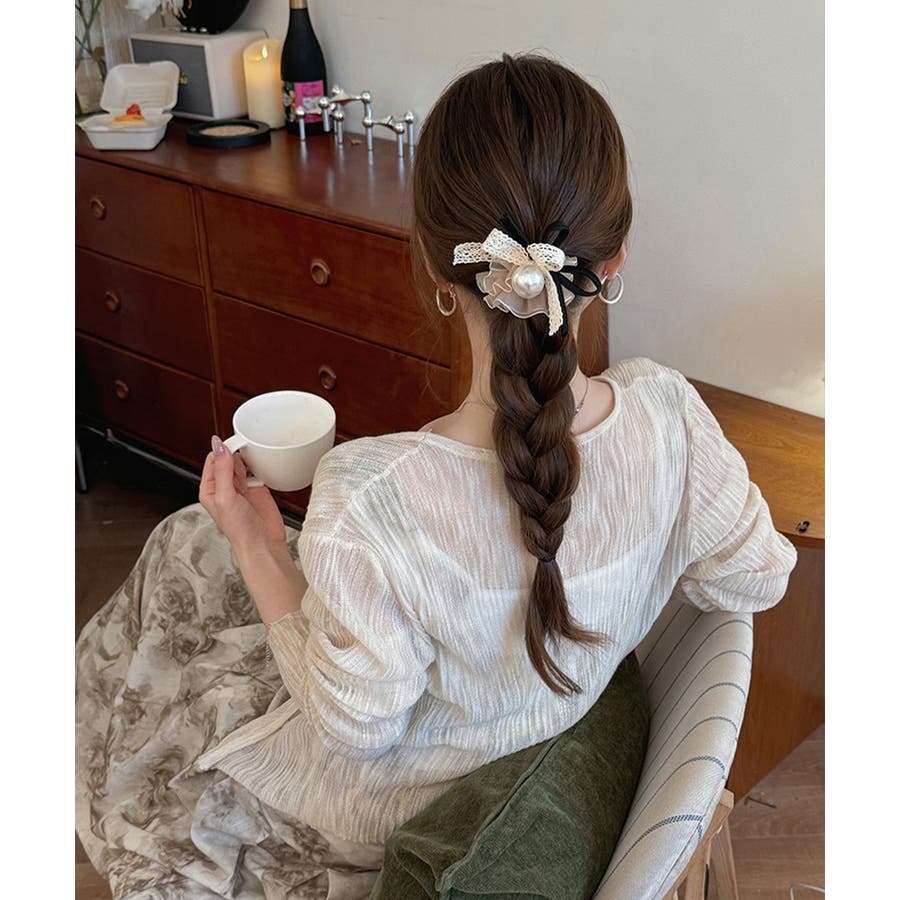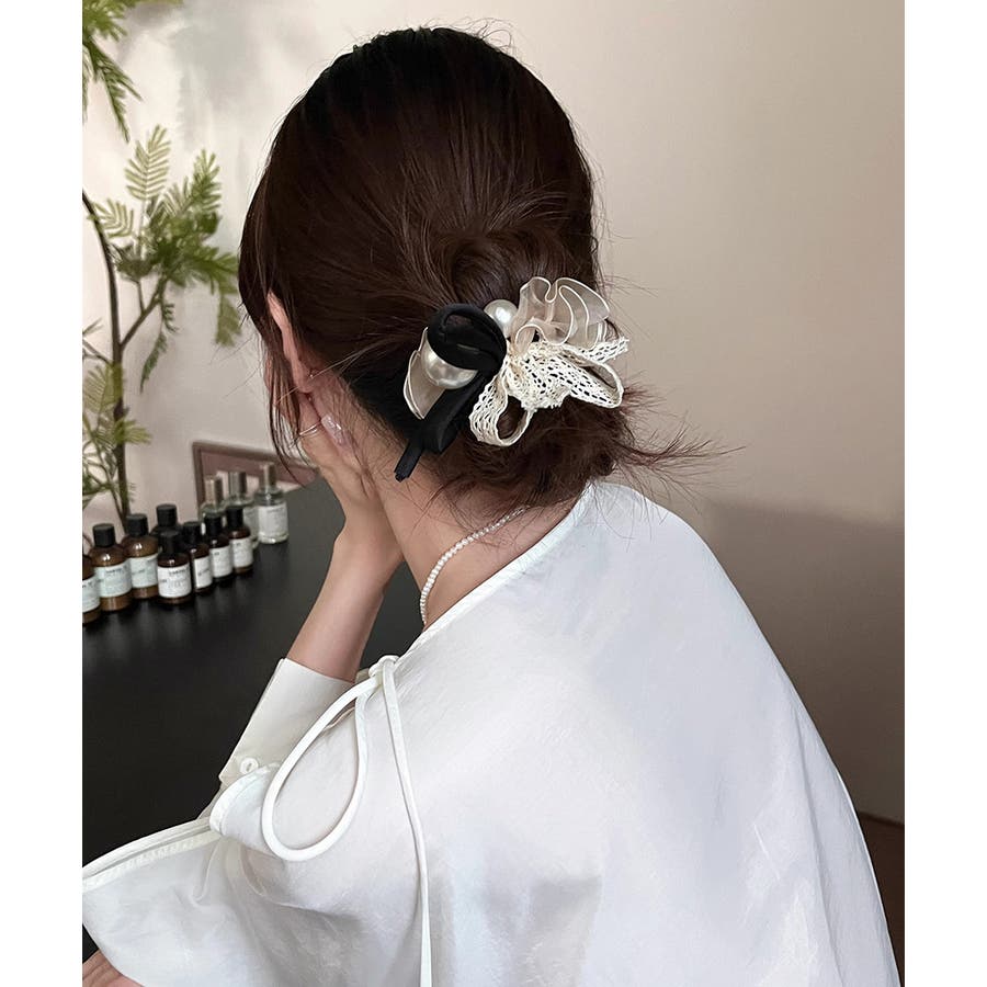 ひとつ結びやお団子にさっとつけるだけで、上品でフェミニンな印象に。