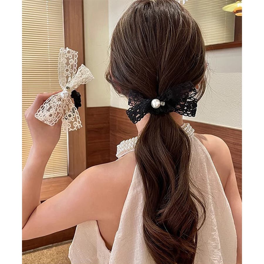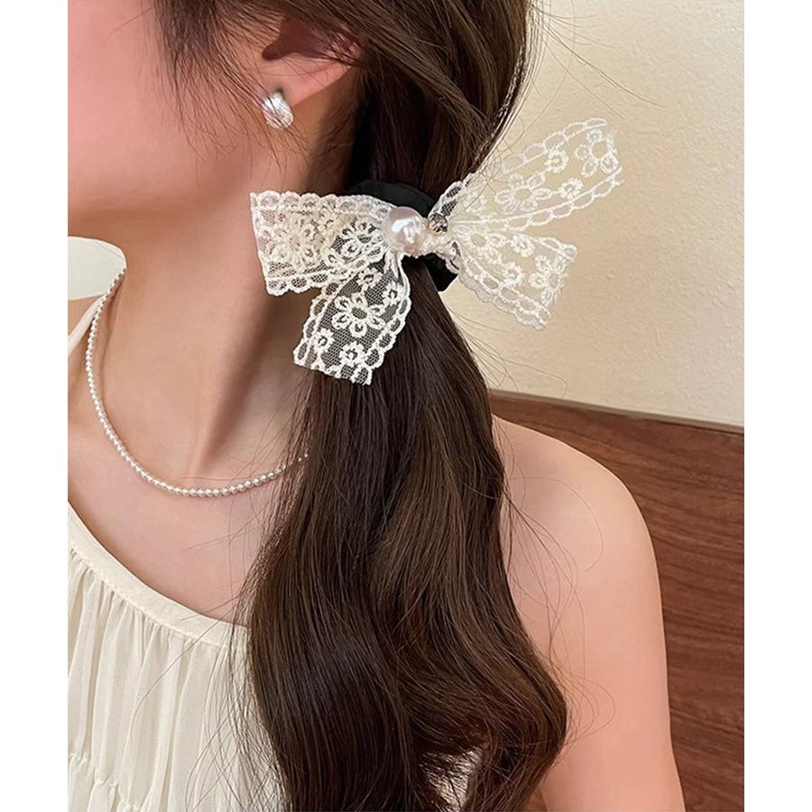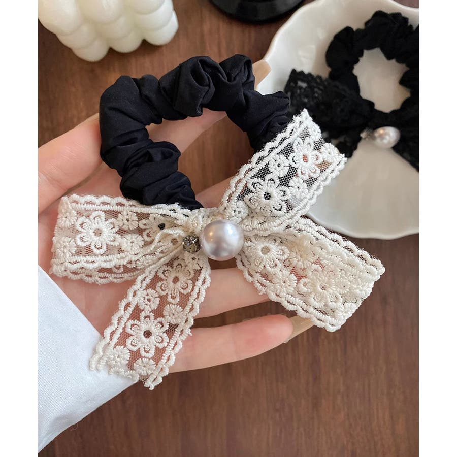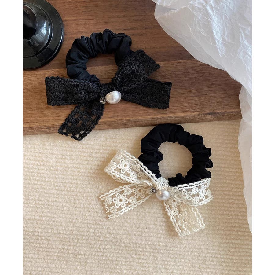 レースリボンがポイントのヘアシュシュ。