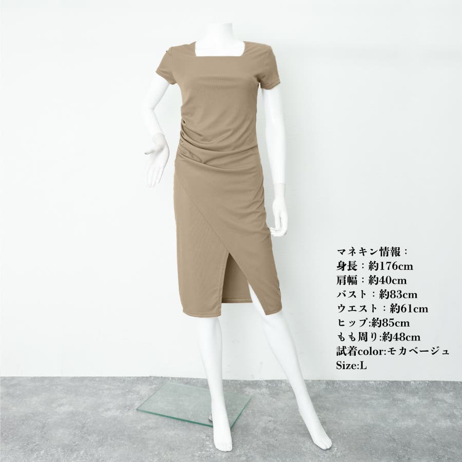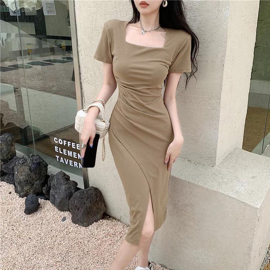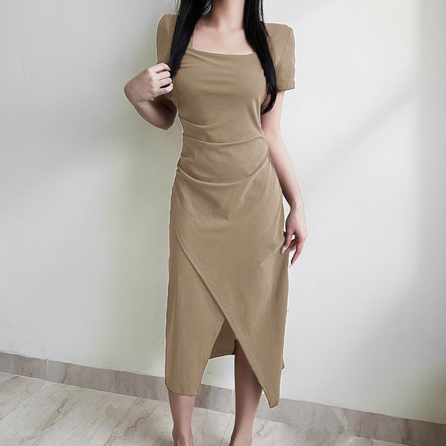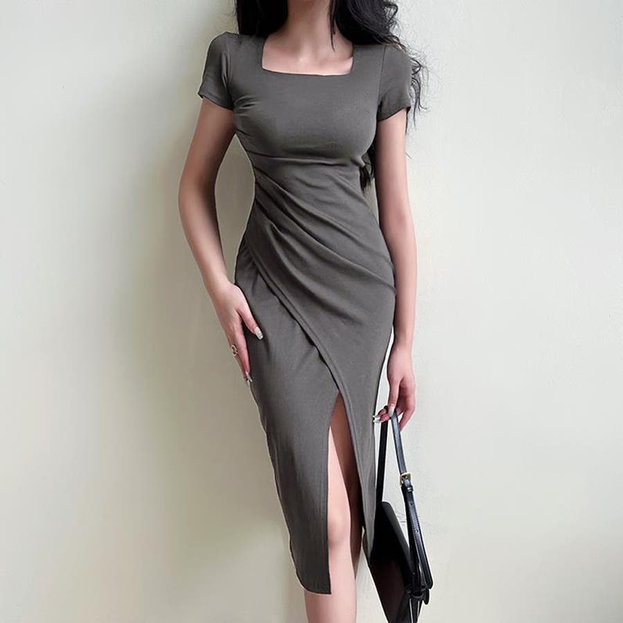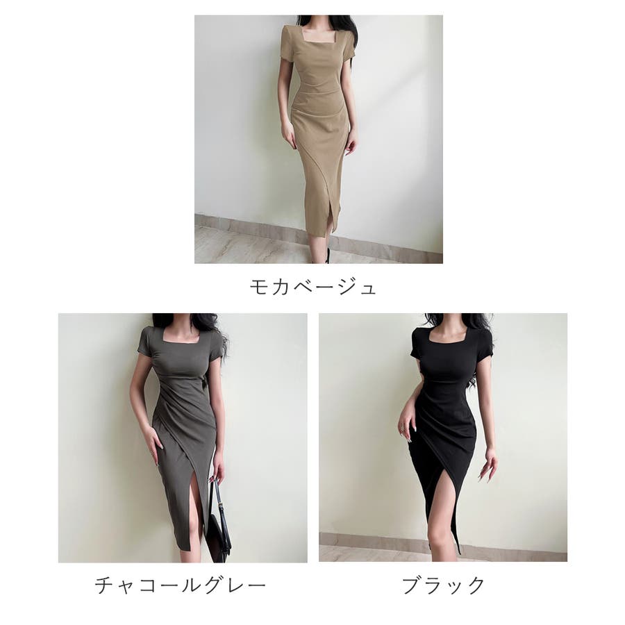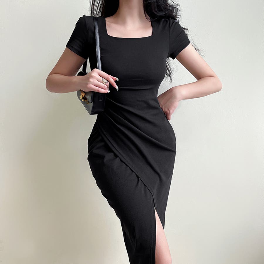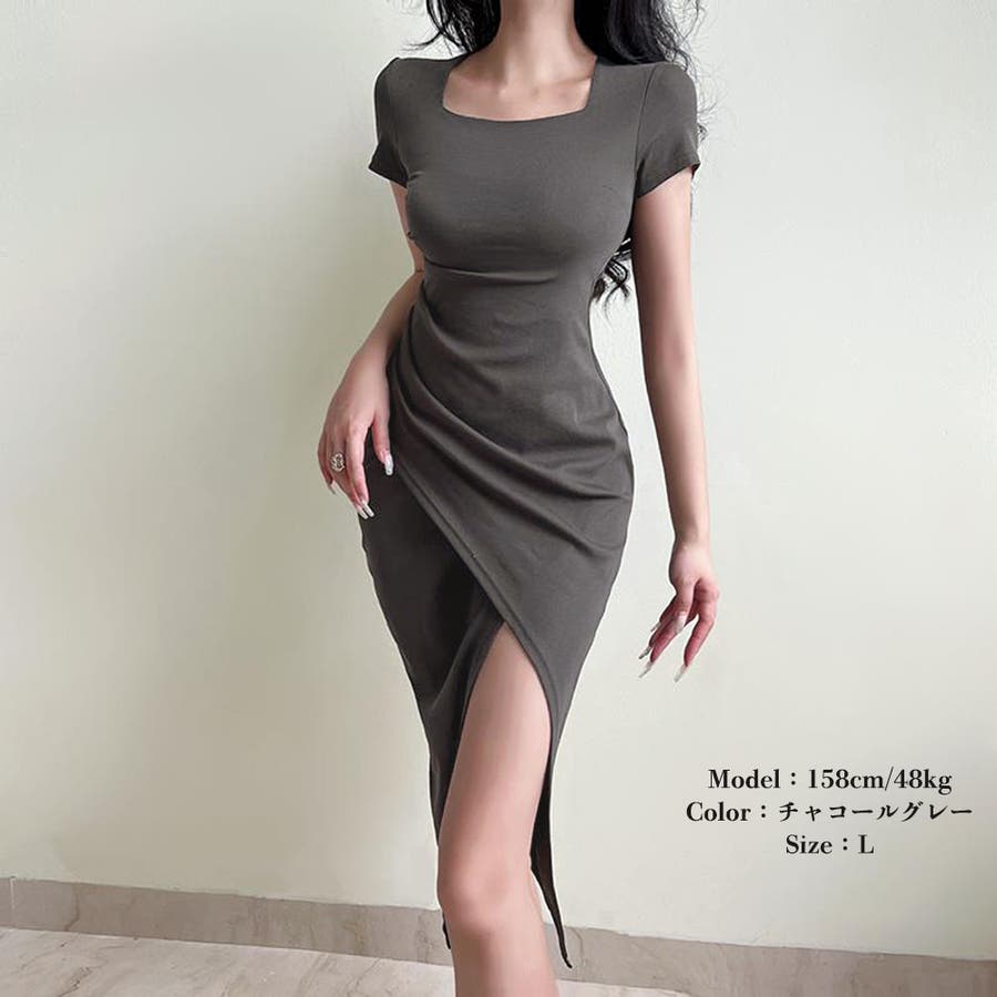 レディース 韓国 スリット スクエアネック スリムフィット ギャザー 夏 薄手ワンピース セクシー大人 細見えワンピ