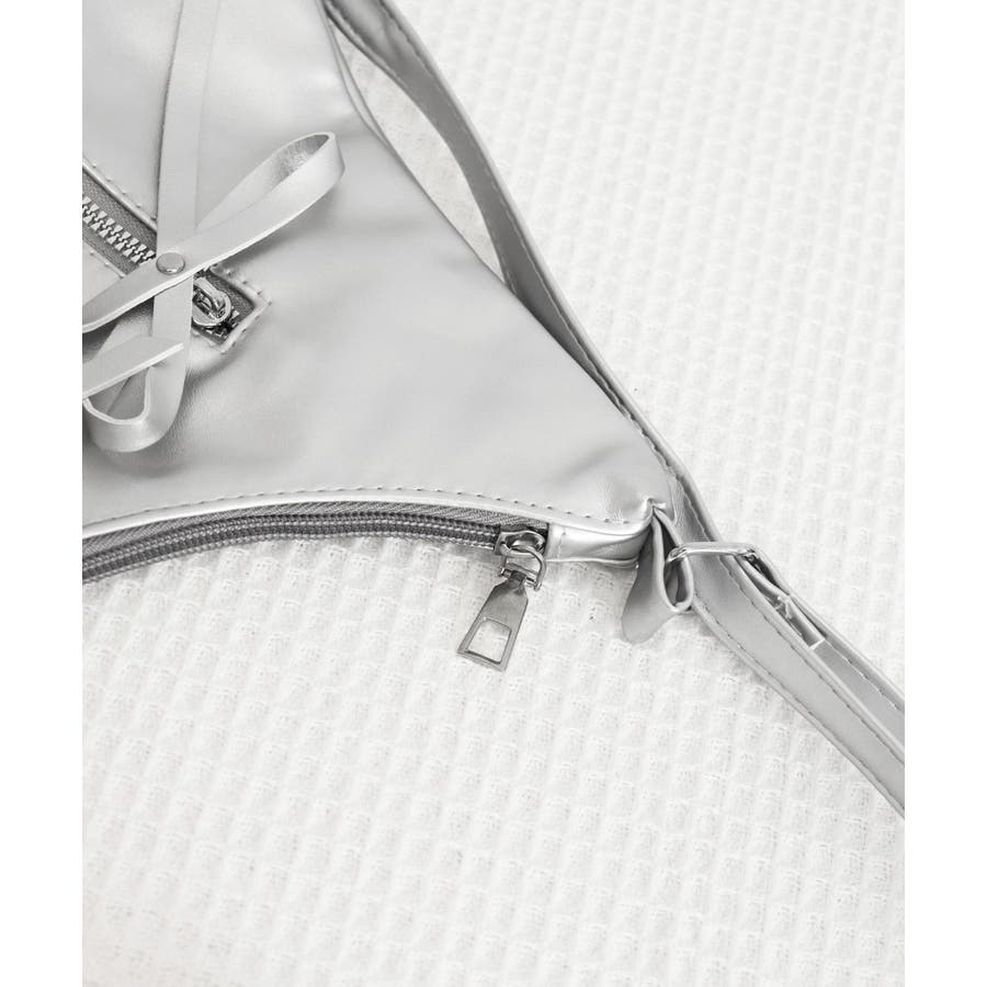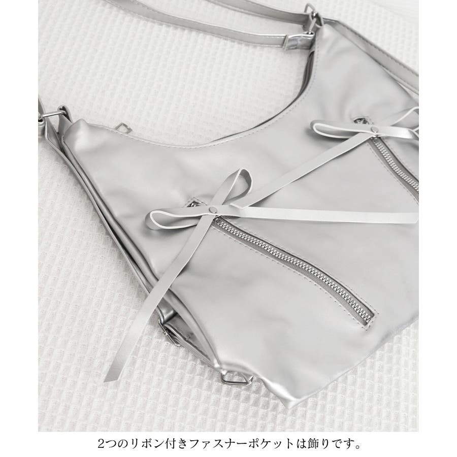 フロントには飾り用のリボン付きファスナーポケットがあり、フェミニンなアクセントをプラス。