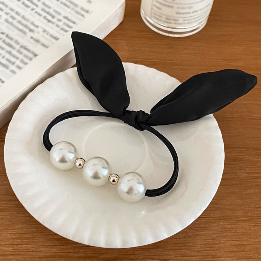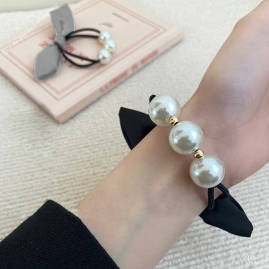 フェイクパールとリボンがアクセントになるヘアゴム。