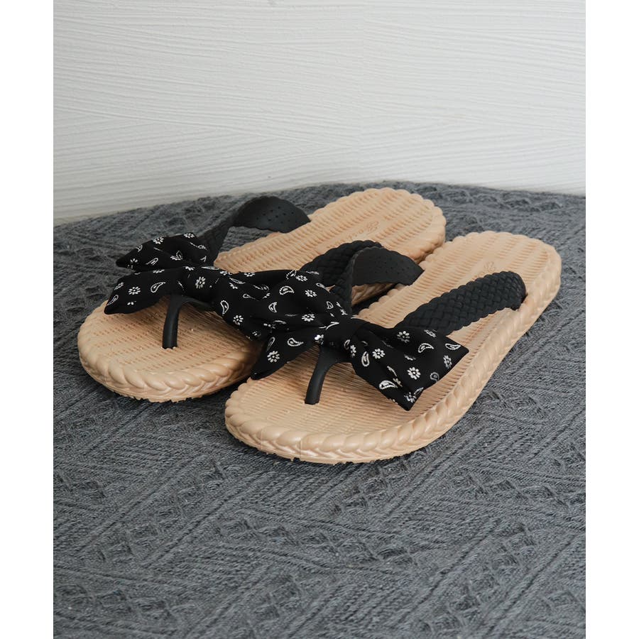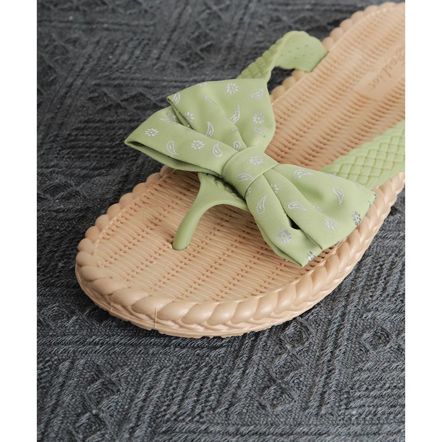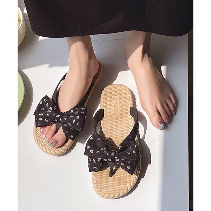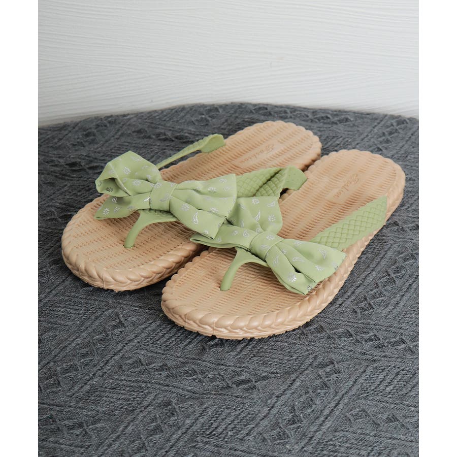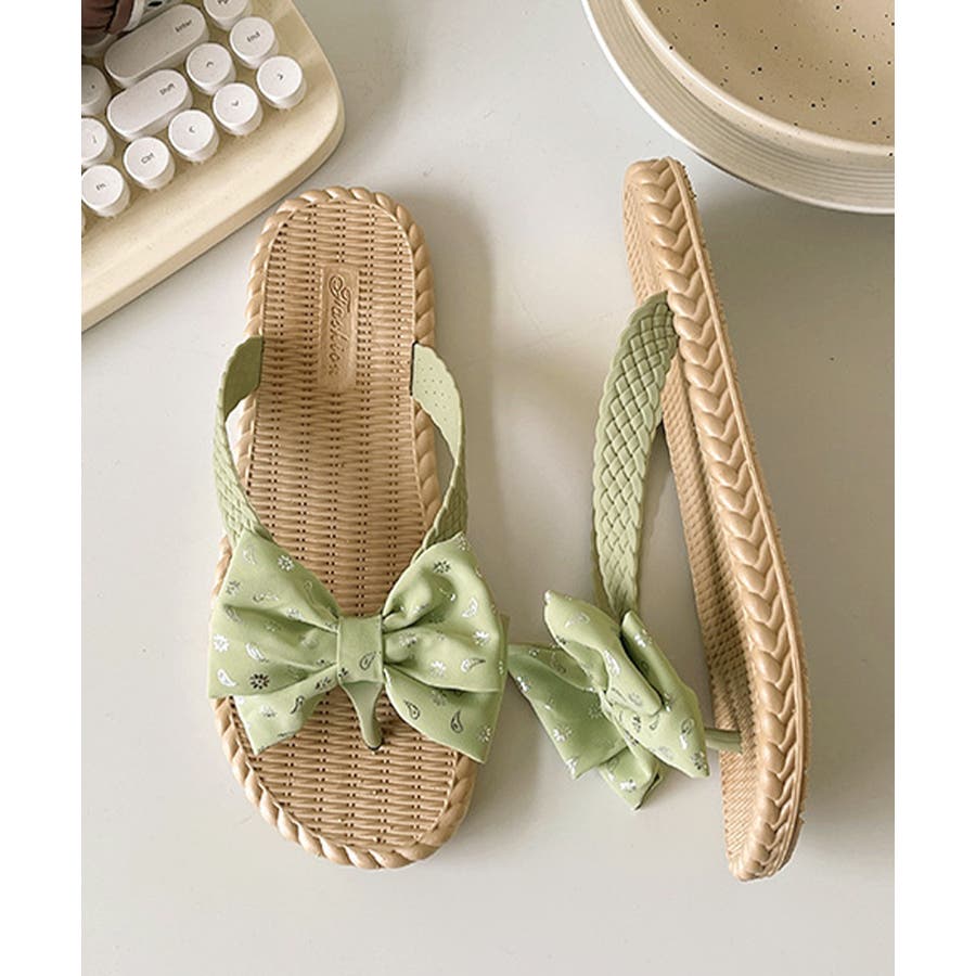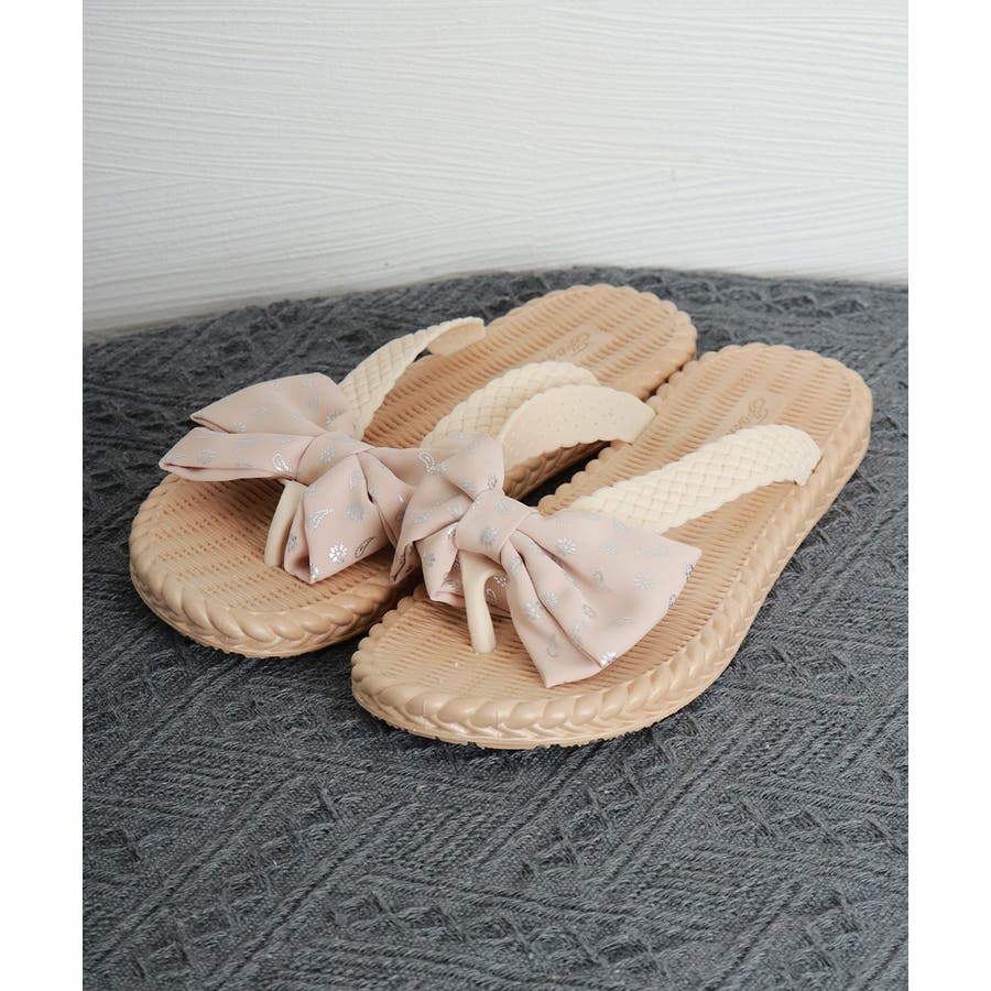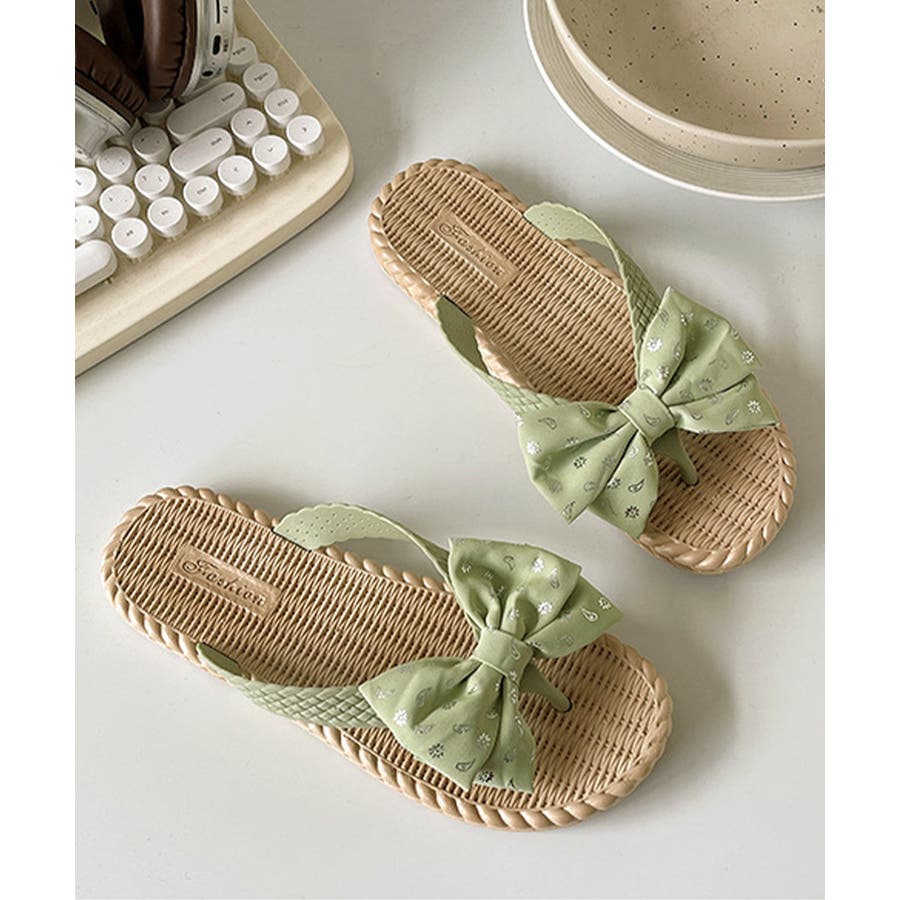 ナチュラルな風合いのソールに、リボンデザインが目を引くフラットサンダル。
