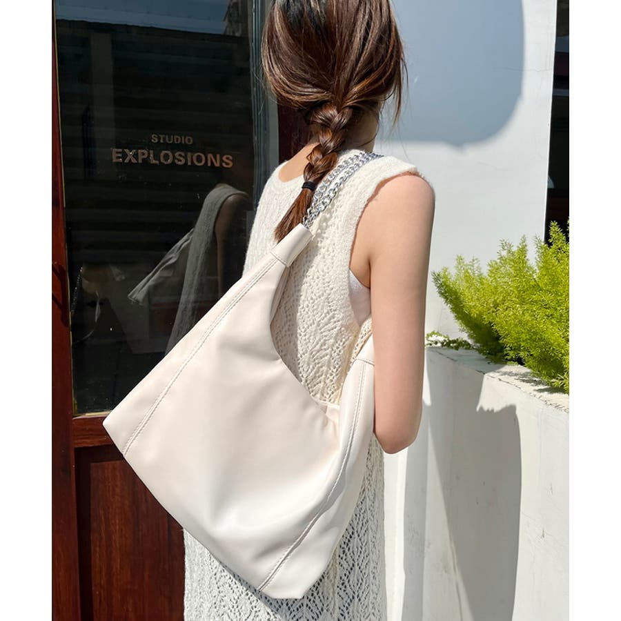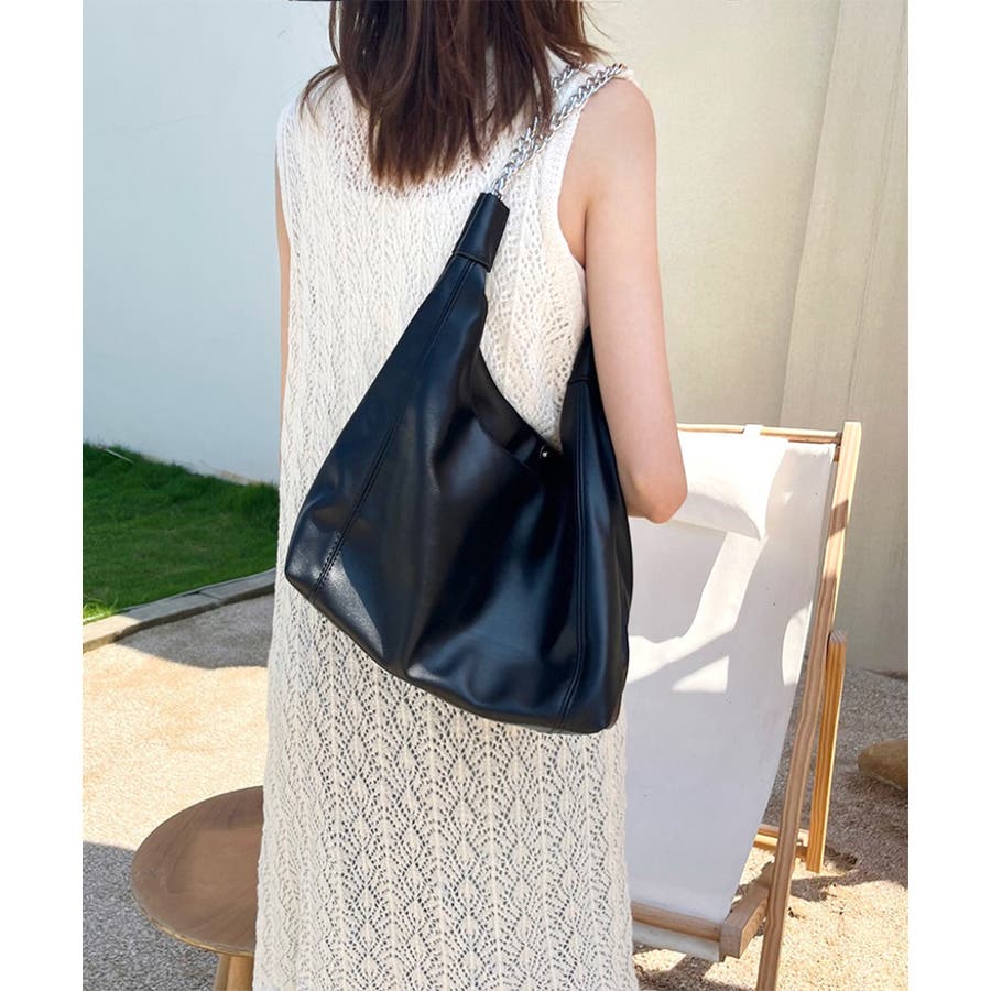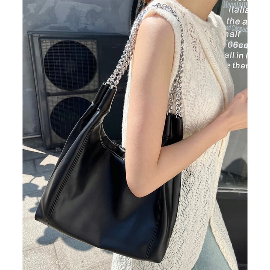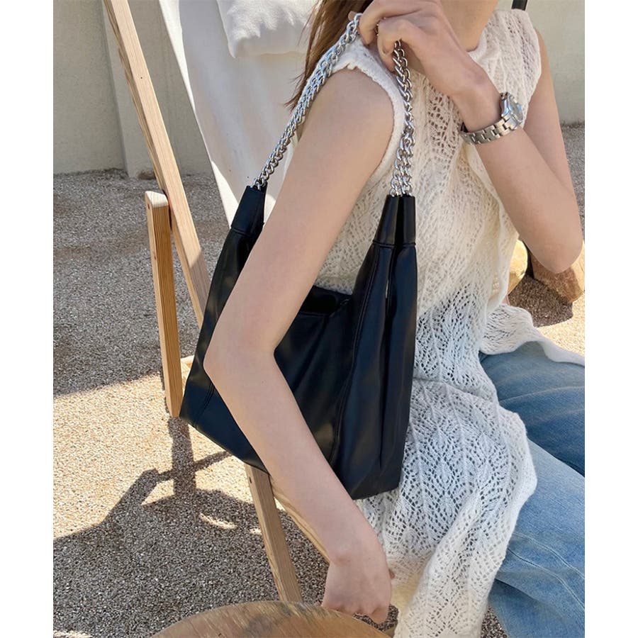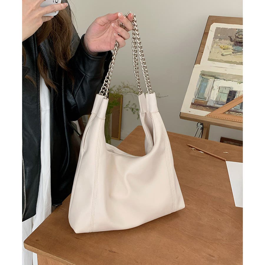 柔らかい生地を使用し、ハンドル部分にデザイン性のあるチェーンをあしらったトートバッグ