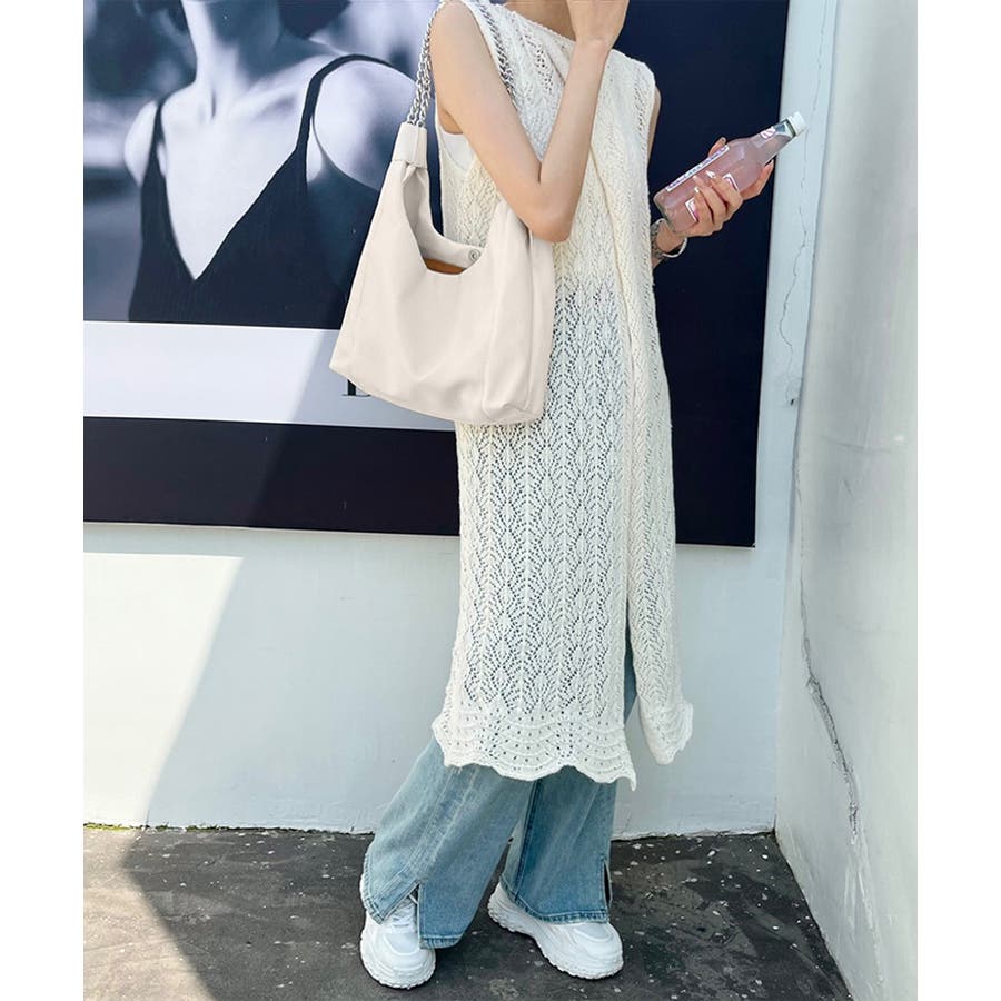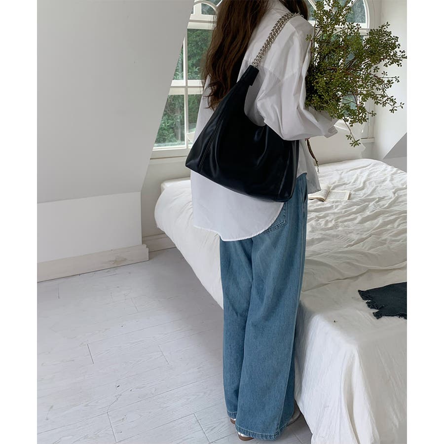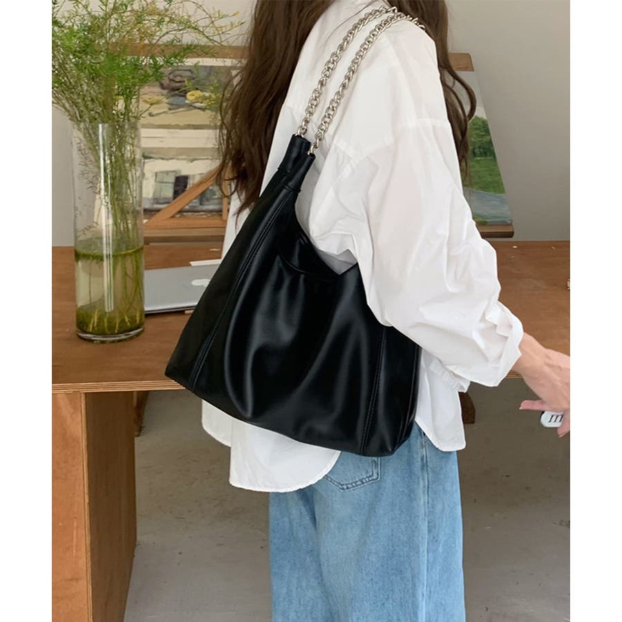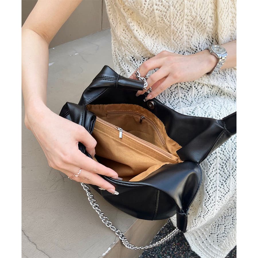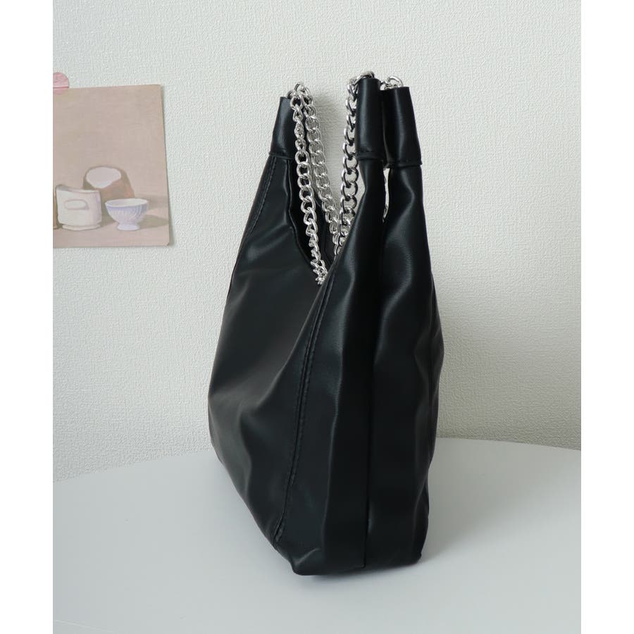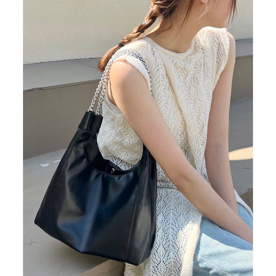 柔らかい生地を使用し、ハンドル部分にデザイン性のあるチェーンをあしらったトートバッグ