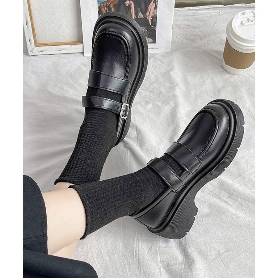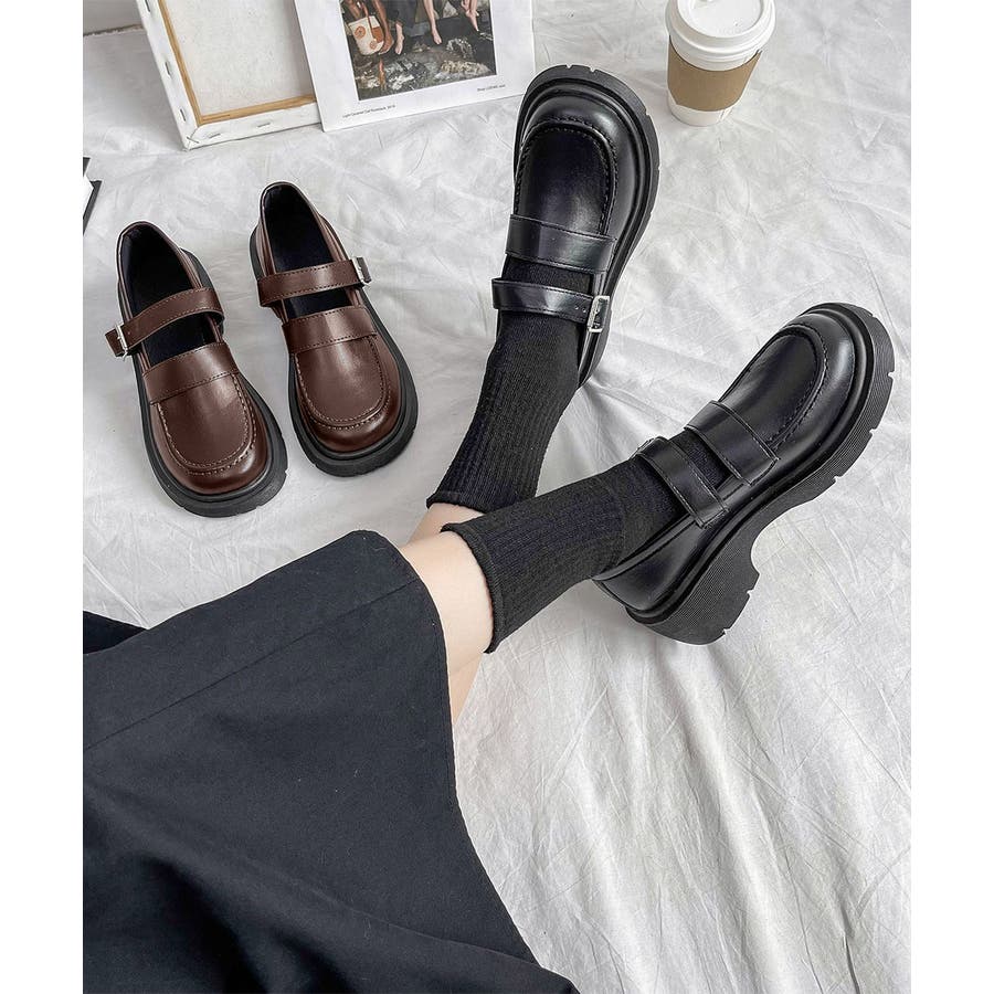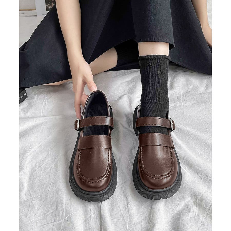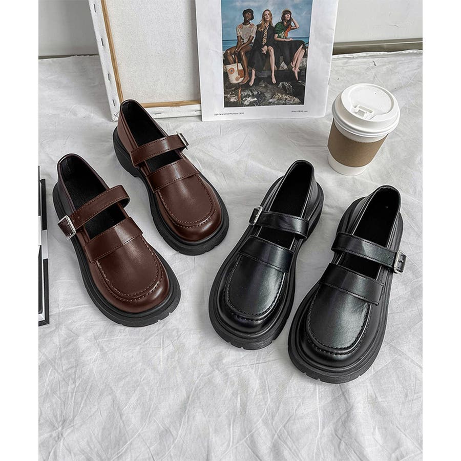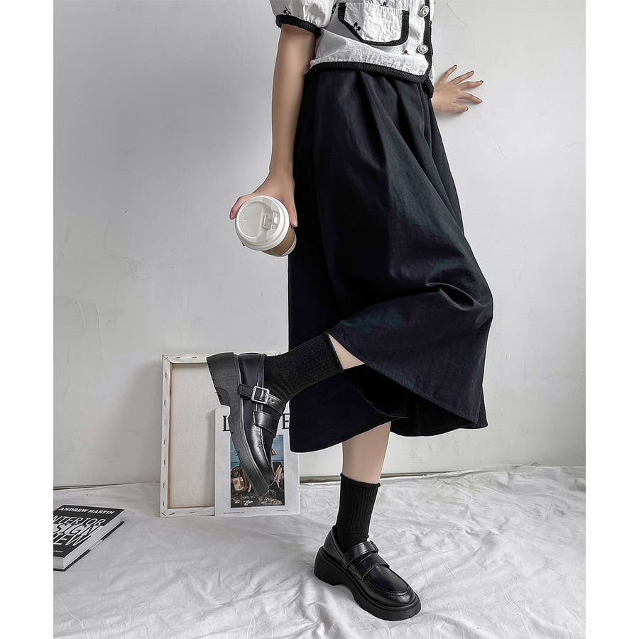 ころんとしたフォルムが可愛い、ストラップ付きローファー。