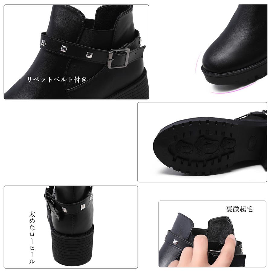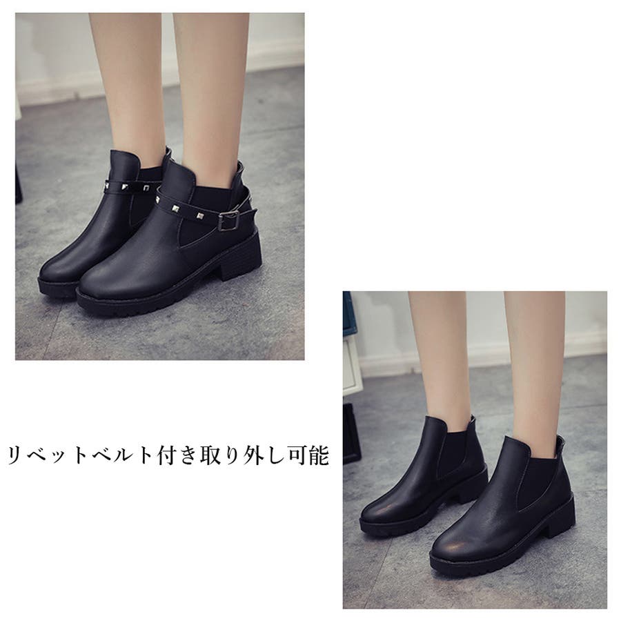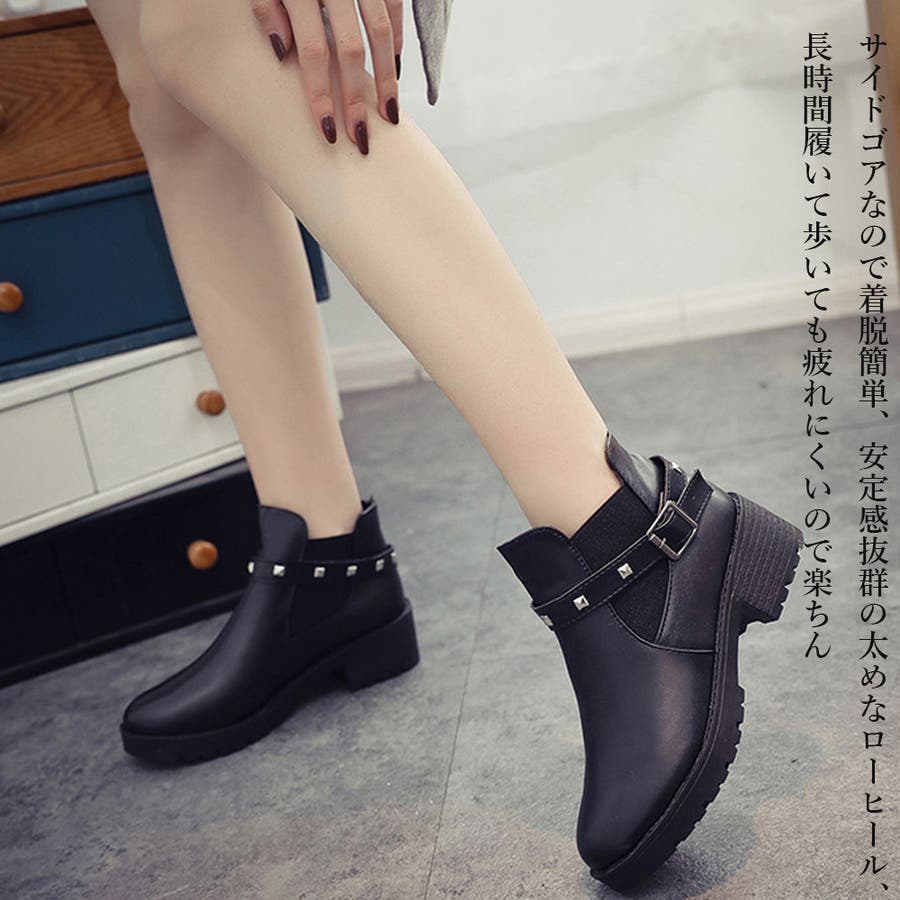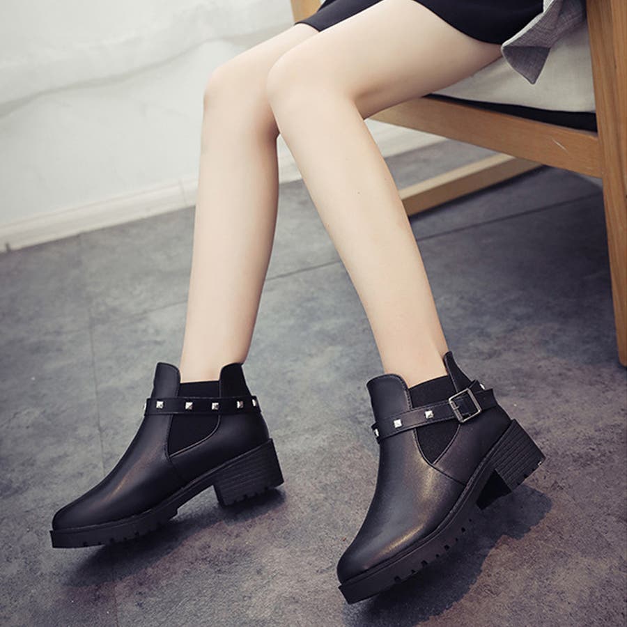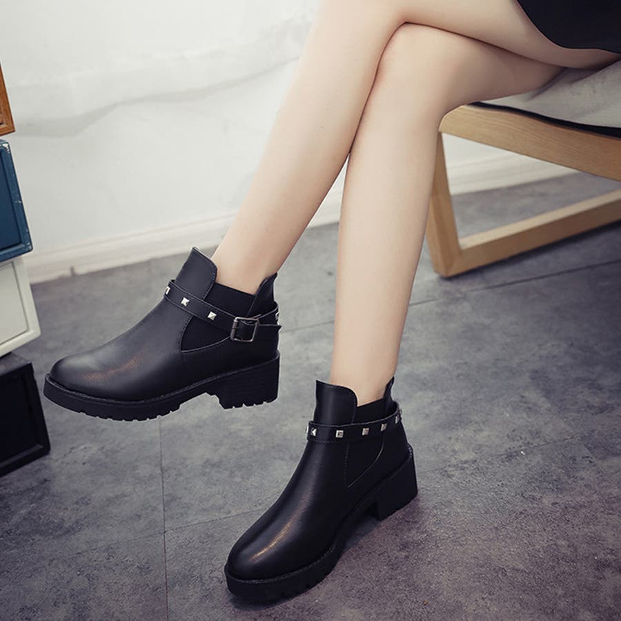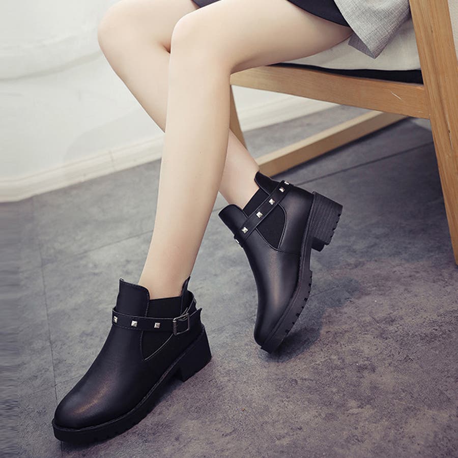 足首見せで女性らしいサイドゴアとリベットベルト付きのショートブーツ