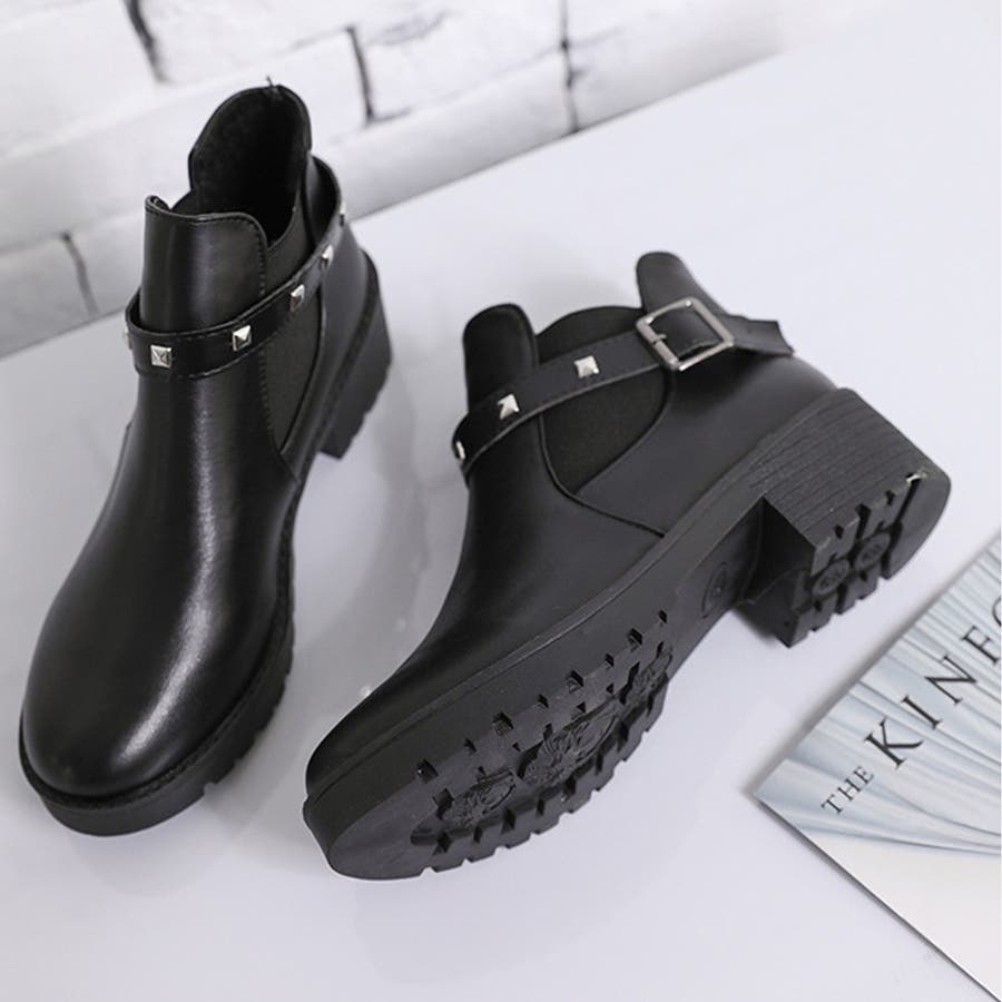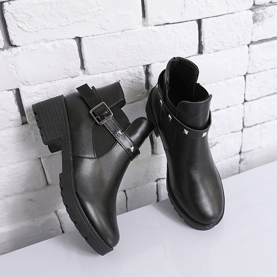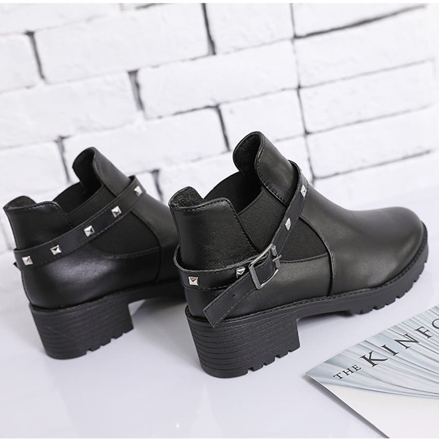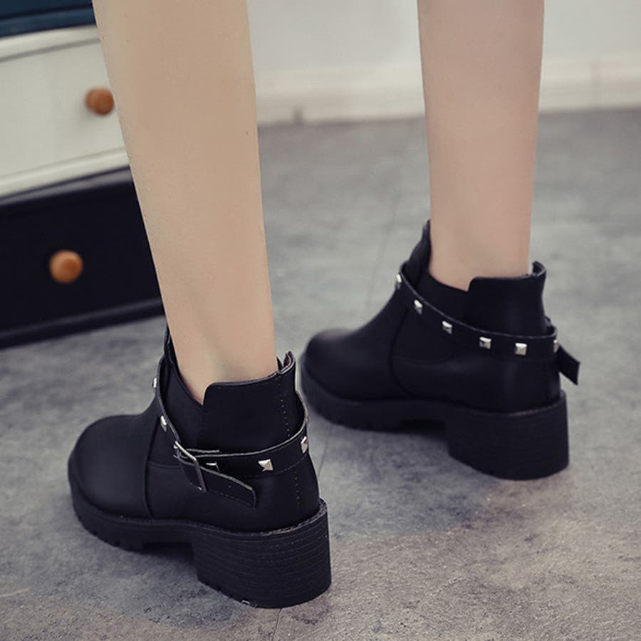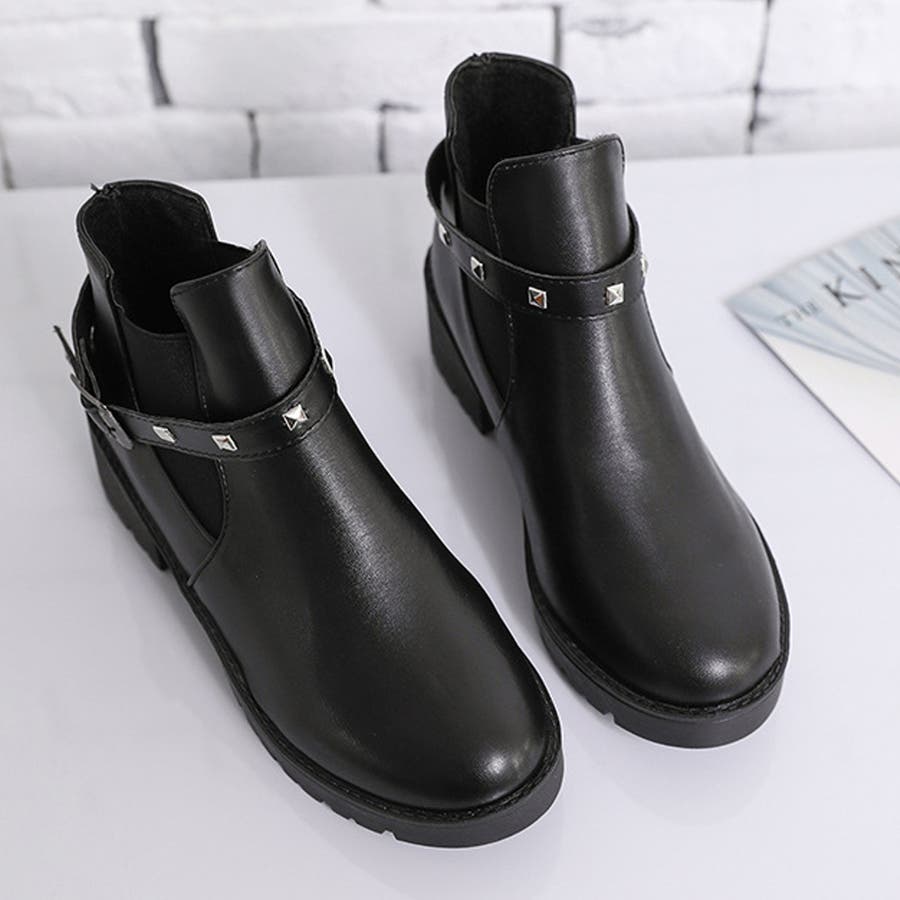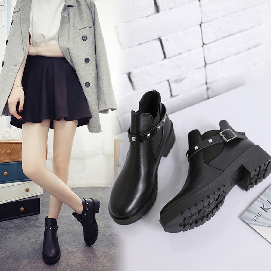 足首見せで女性らしいサイドゴアとリベットベルト付きのショートブーツ