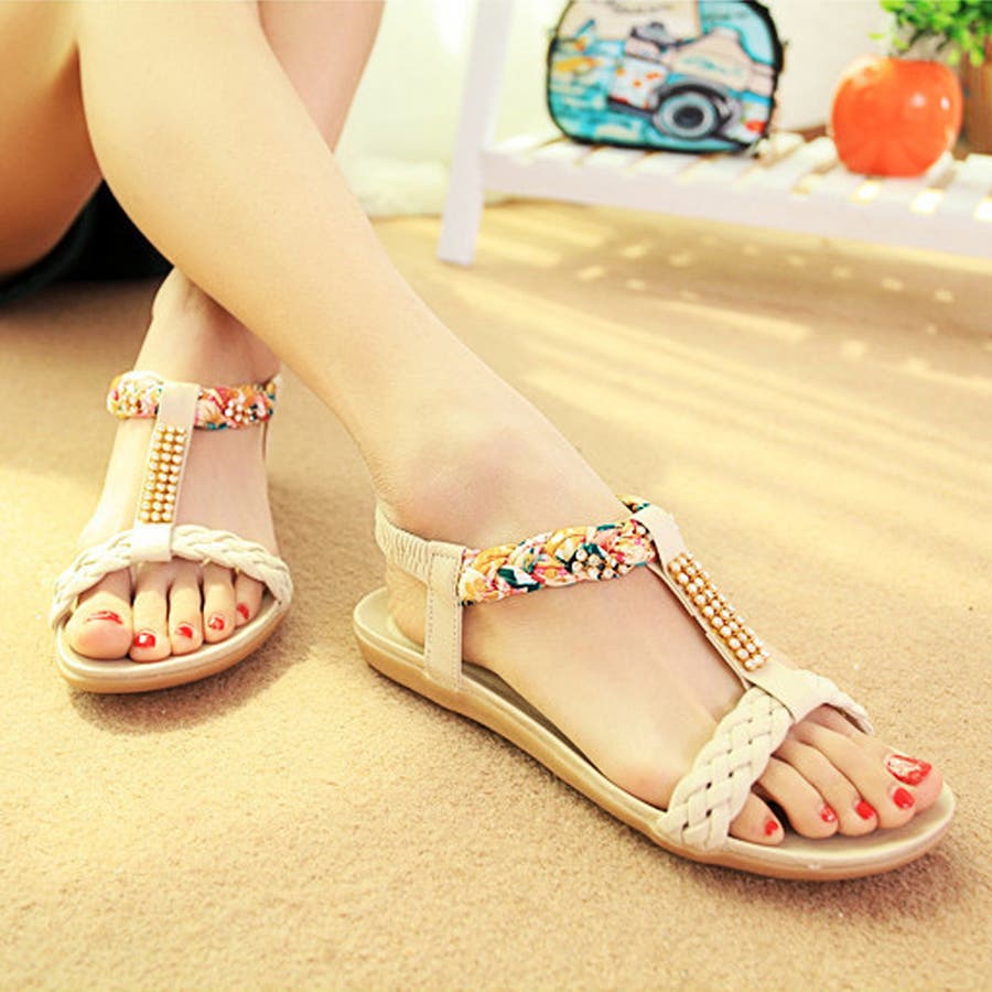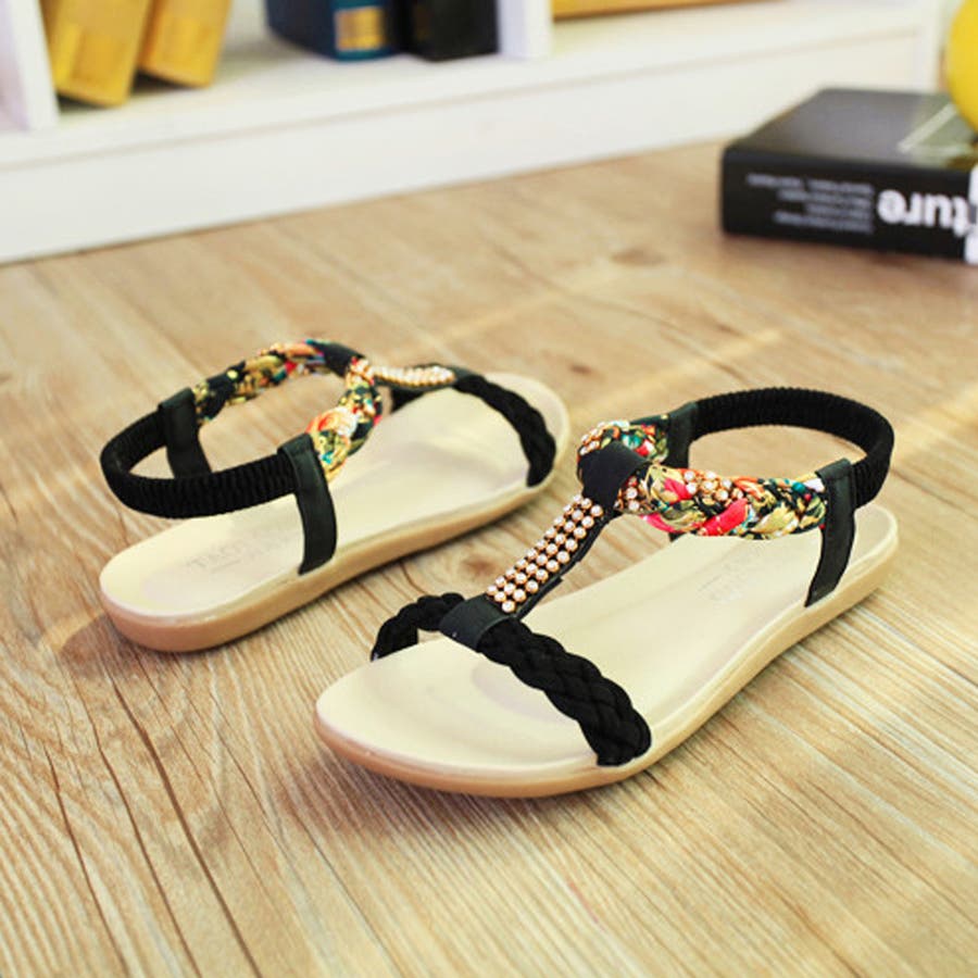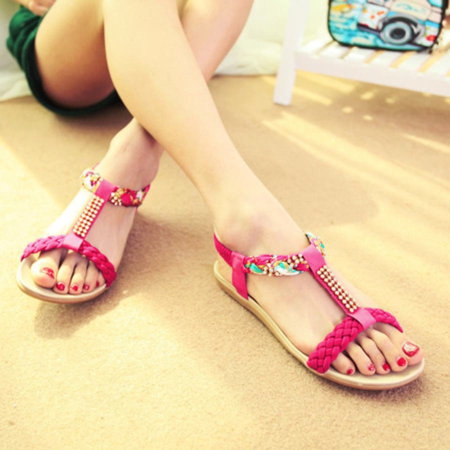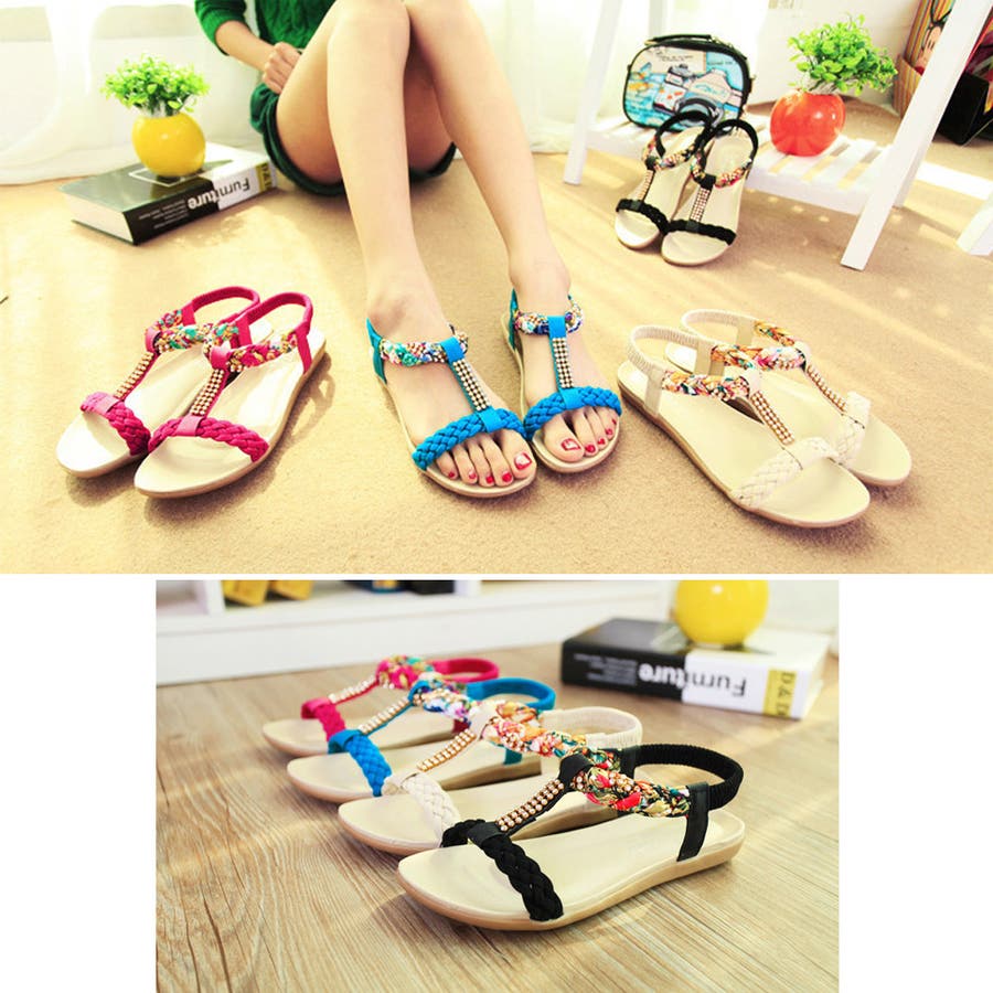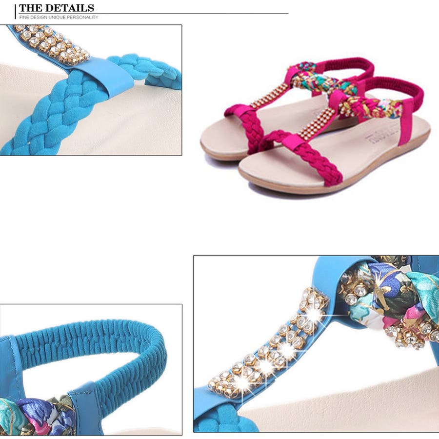 異素材編み込みストラップにラインストーン、華奢に魅せて女性らしいボヘミアン風サンダル