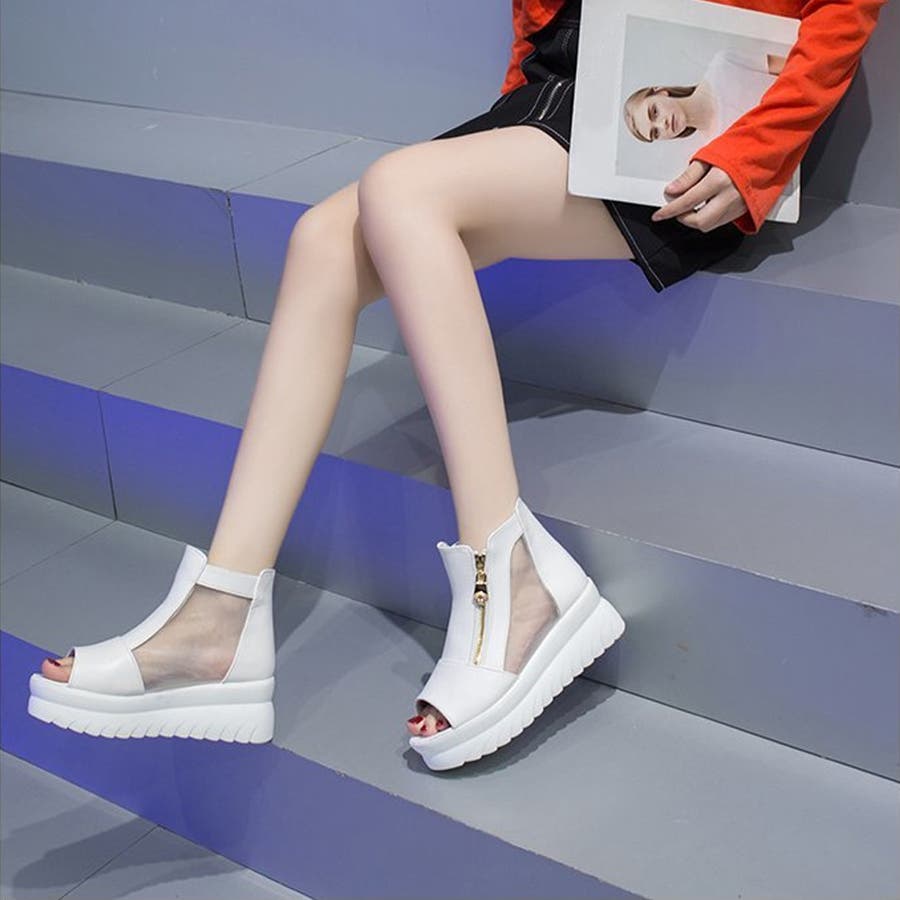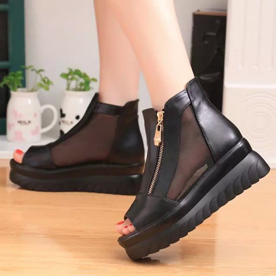 厚底だからさり気なく脚長効果を狙えるオープントゥブーツサンダル