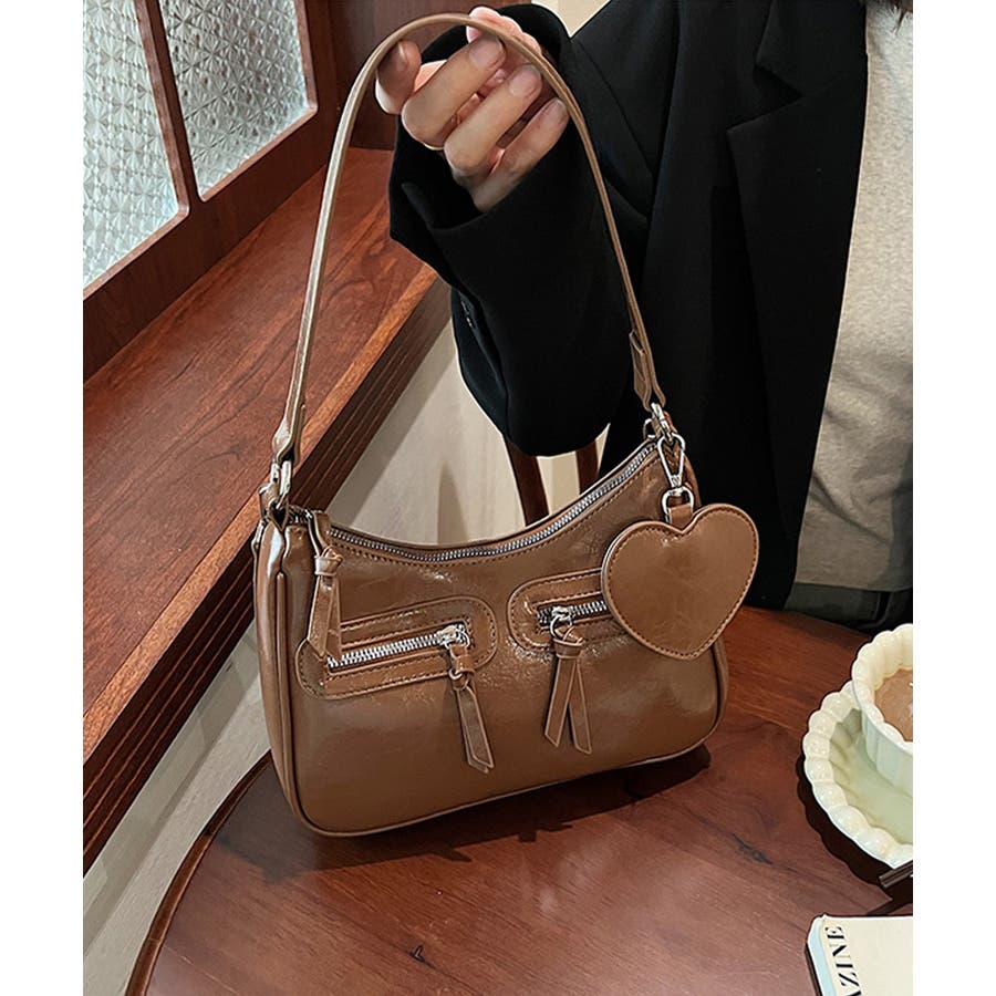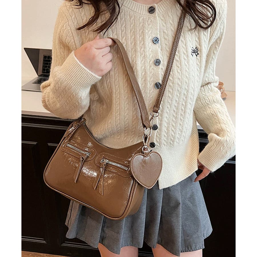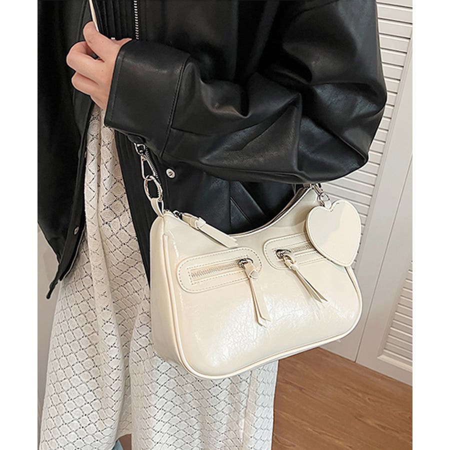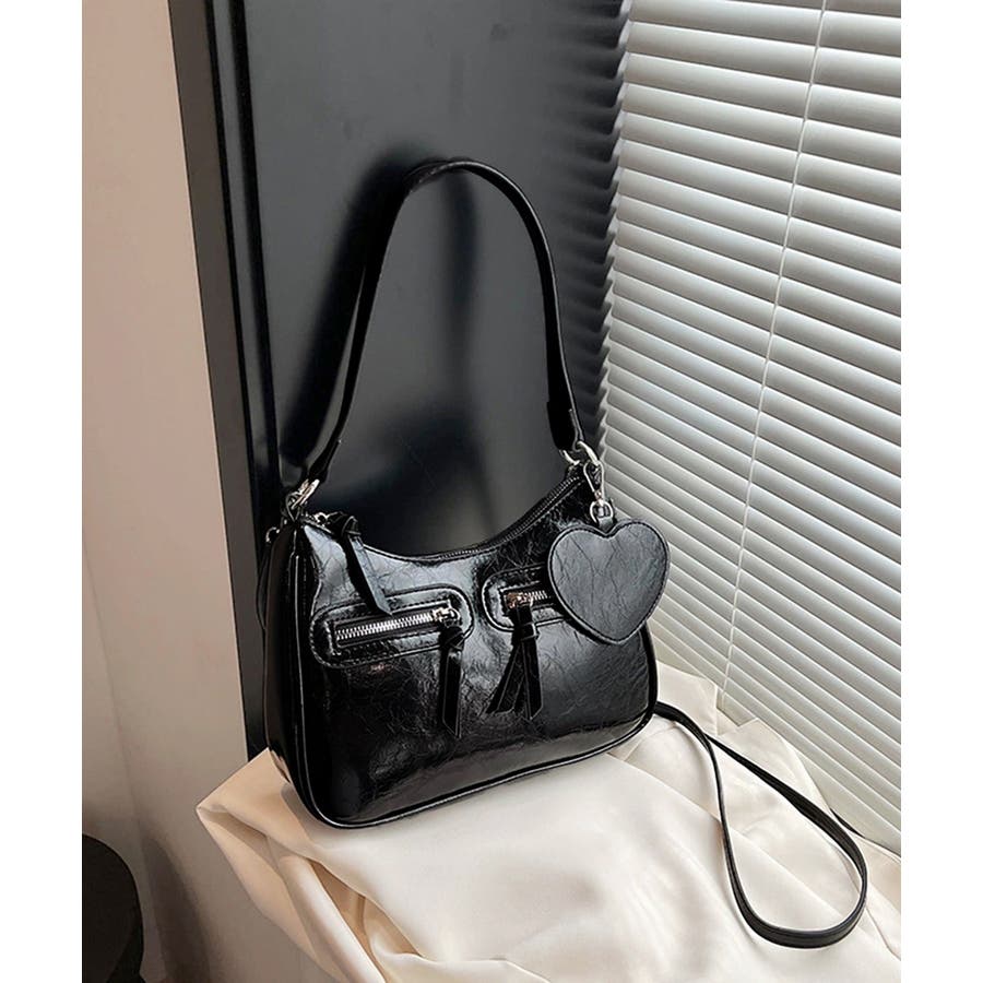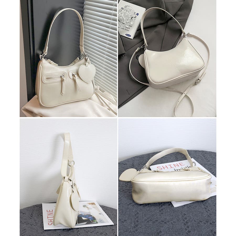 ハートチャームがポイントのフェイクレザーショルダーバッグ。
