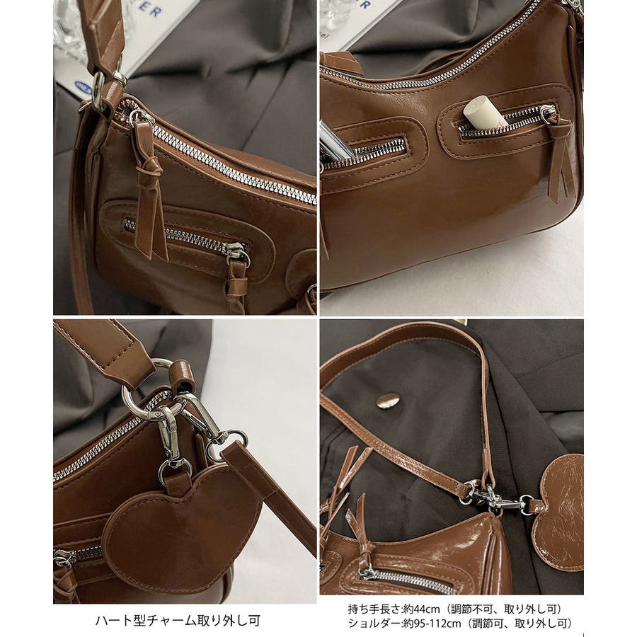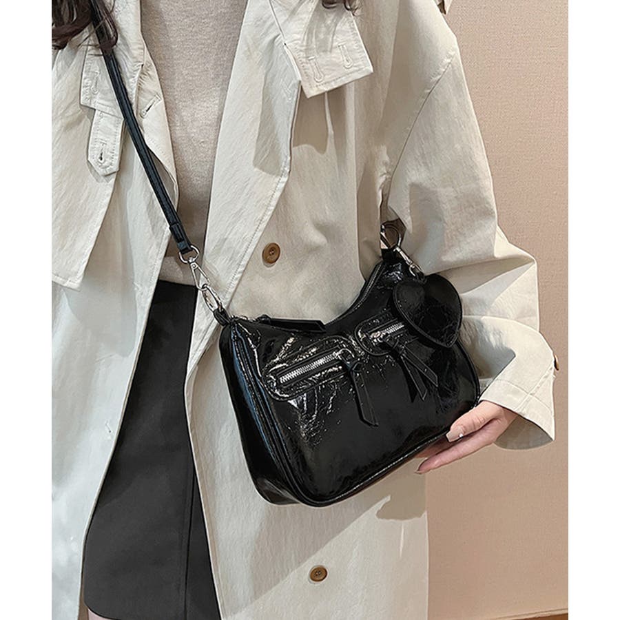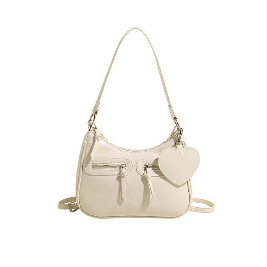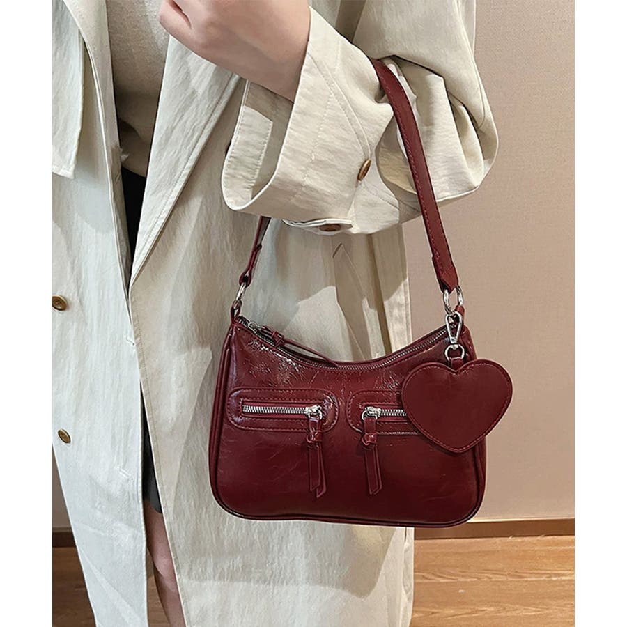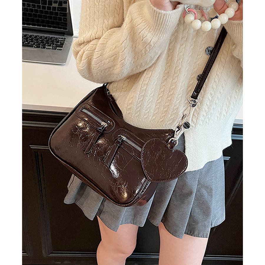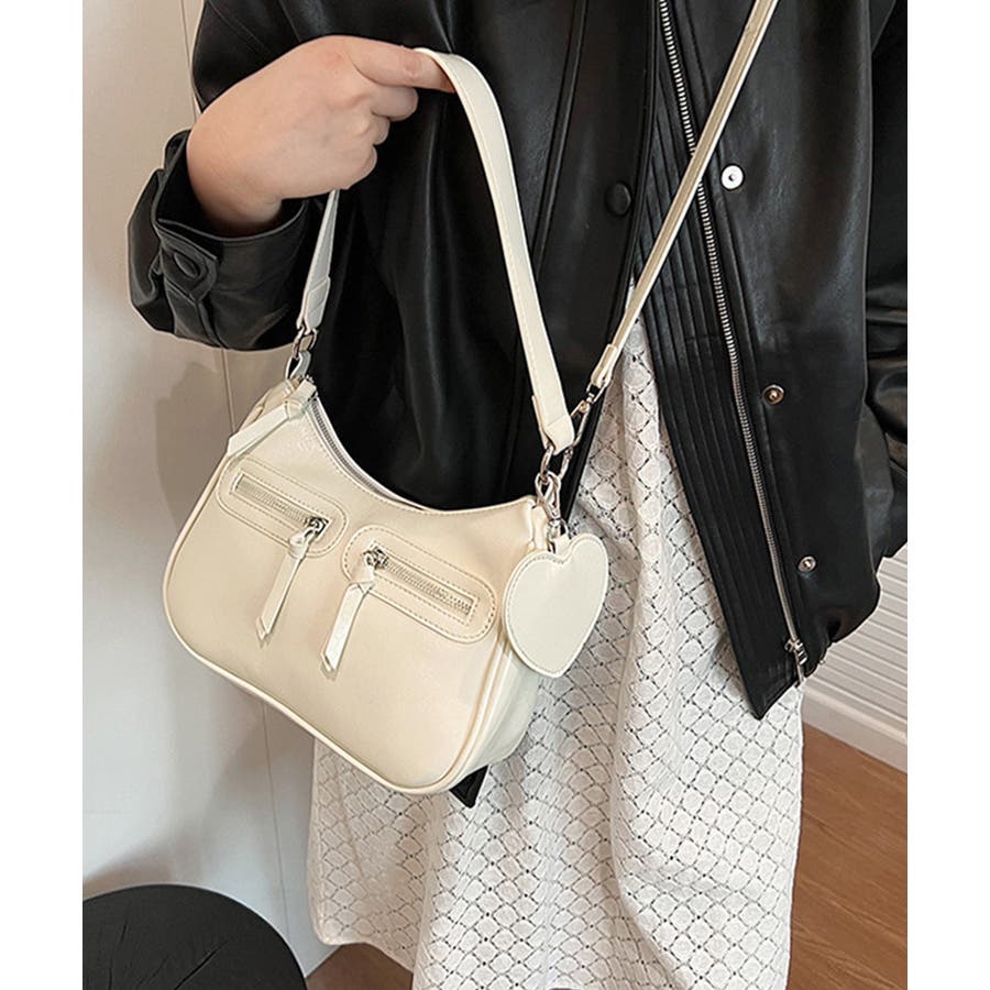ハートチャームがポイントのフェイクレザーショルダーバッグ。