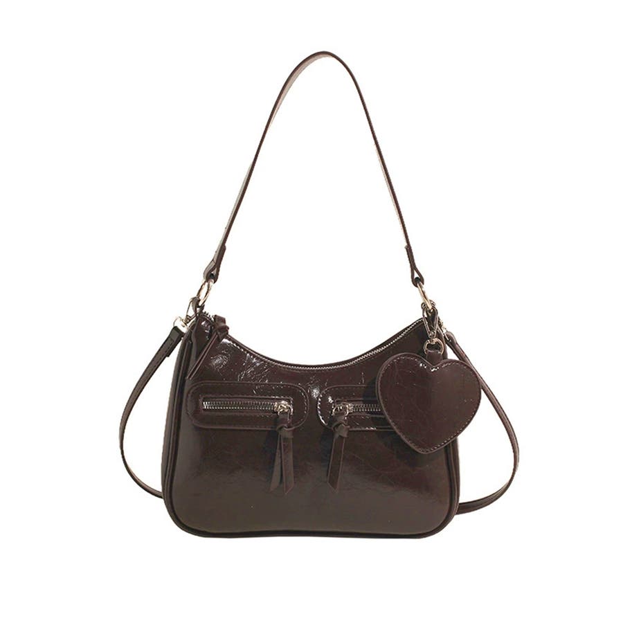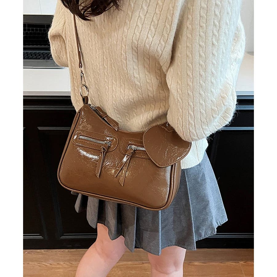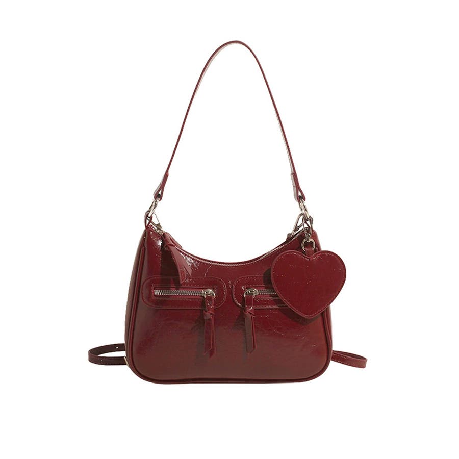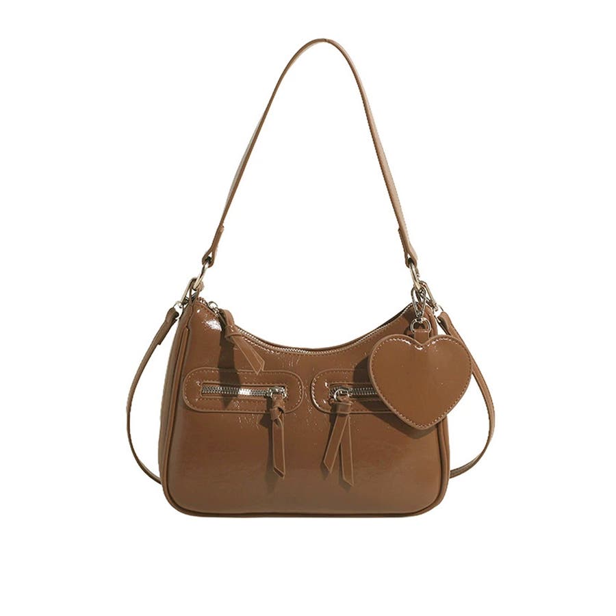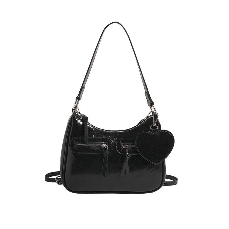 ハートチャームがポイントのフェイクレザーショルダーバッグ。