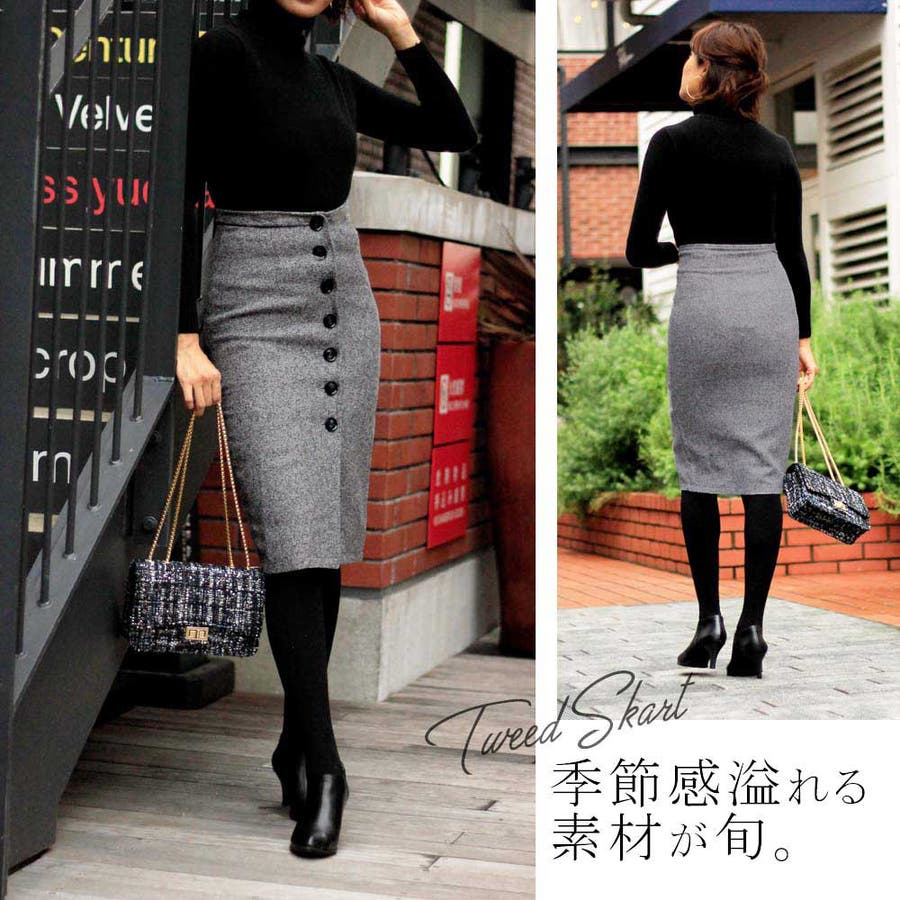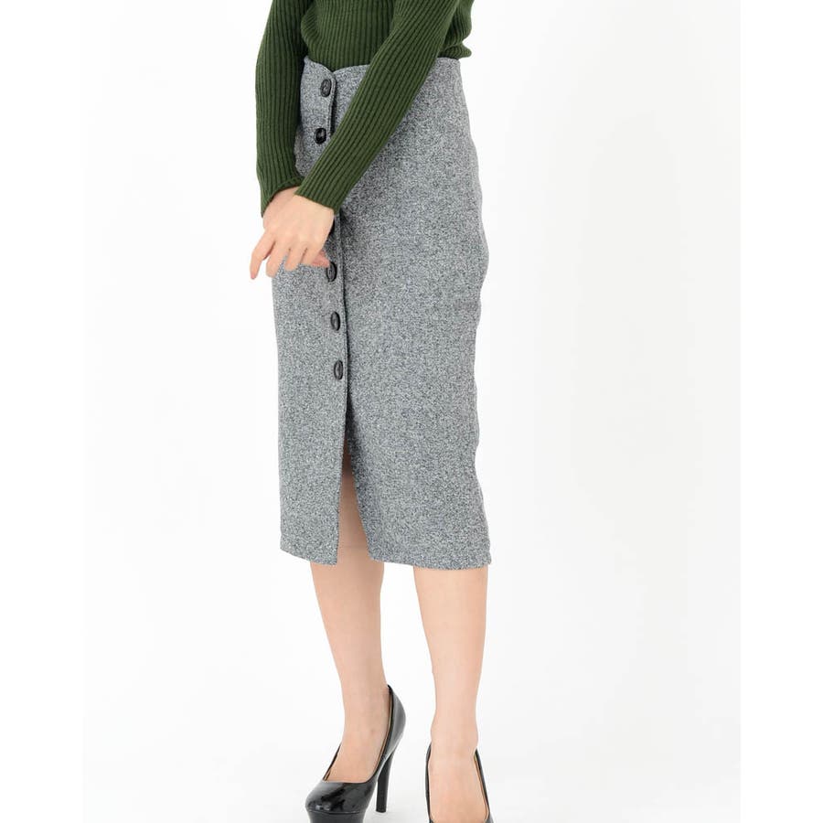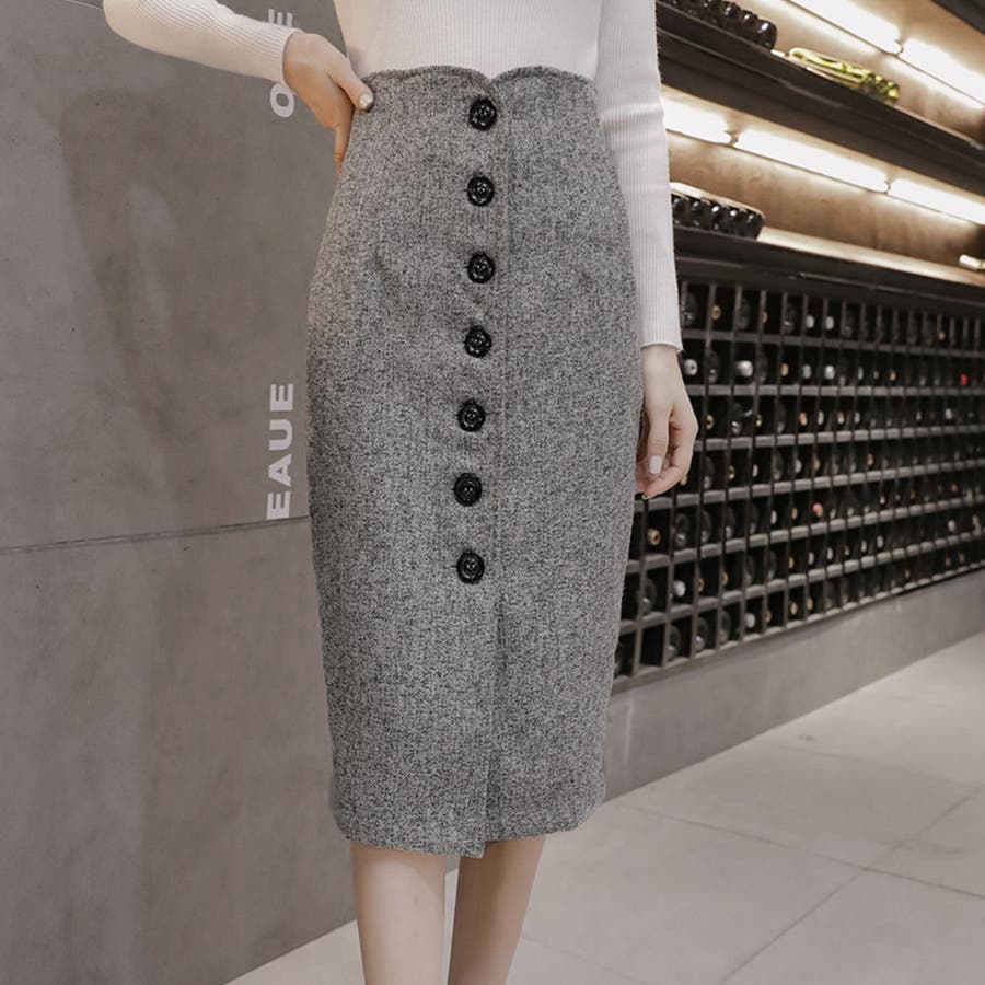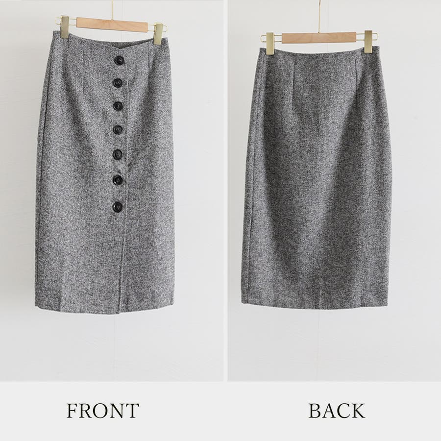フロントボタン全開式のハイウエストミモレ丈ツイードスカート