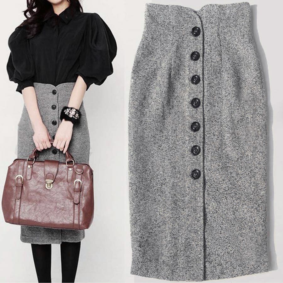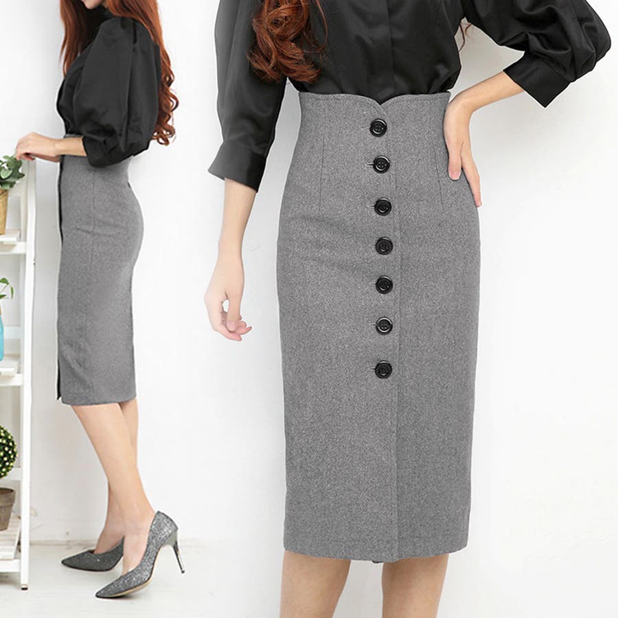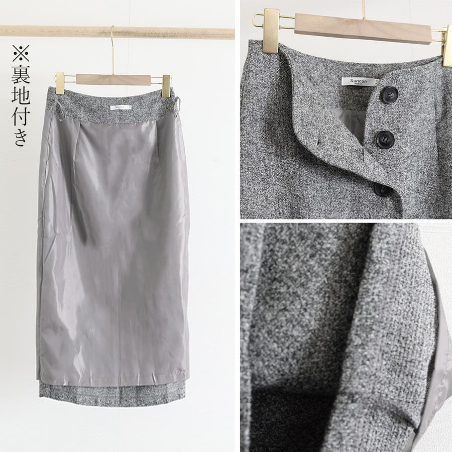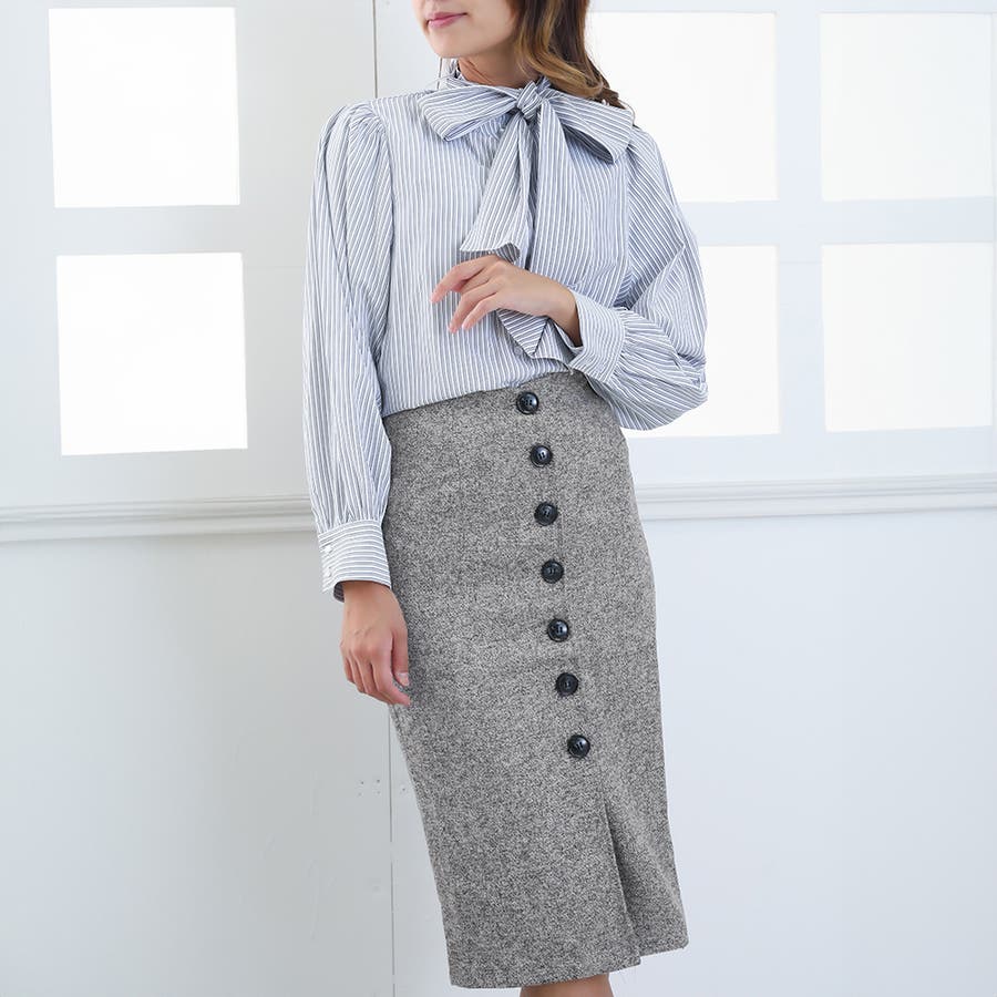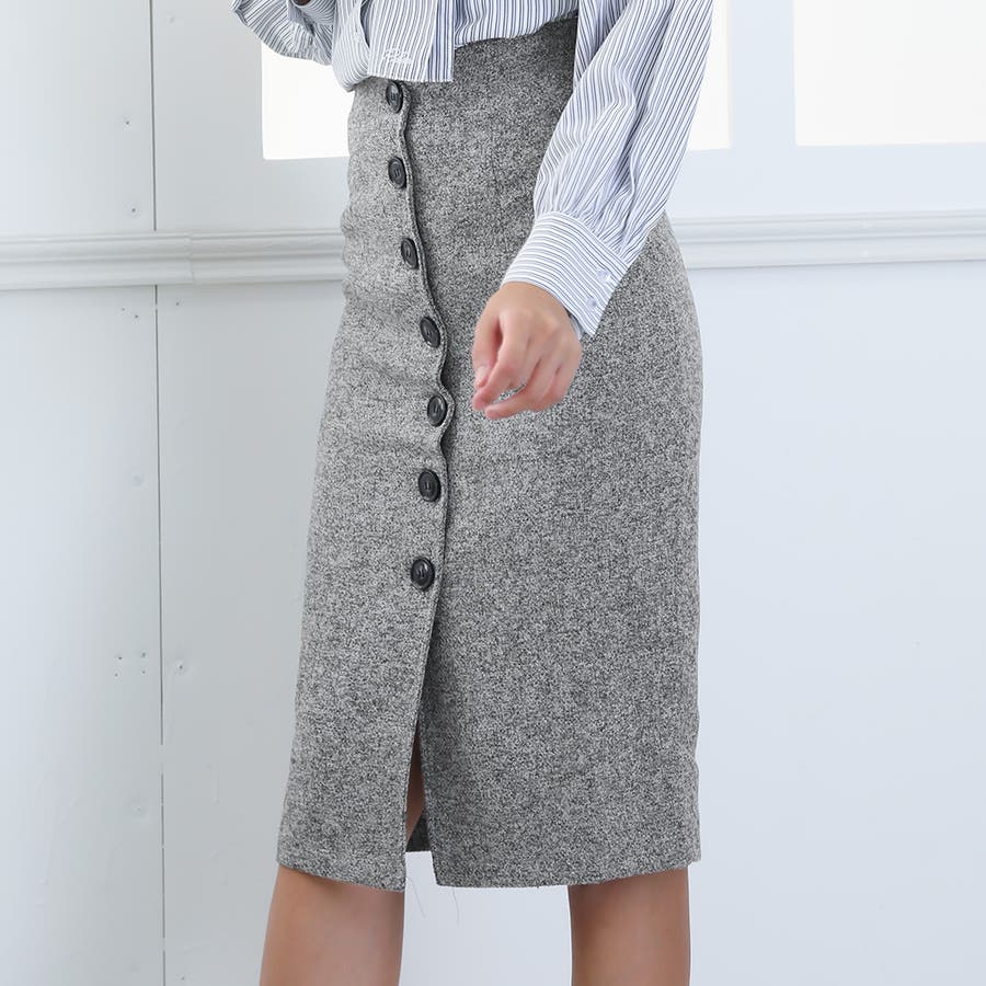 フロントボタン全開式のハイウエストミモレ丈ツイードスカート