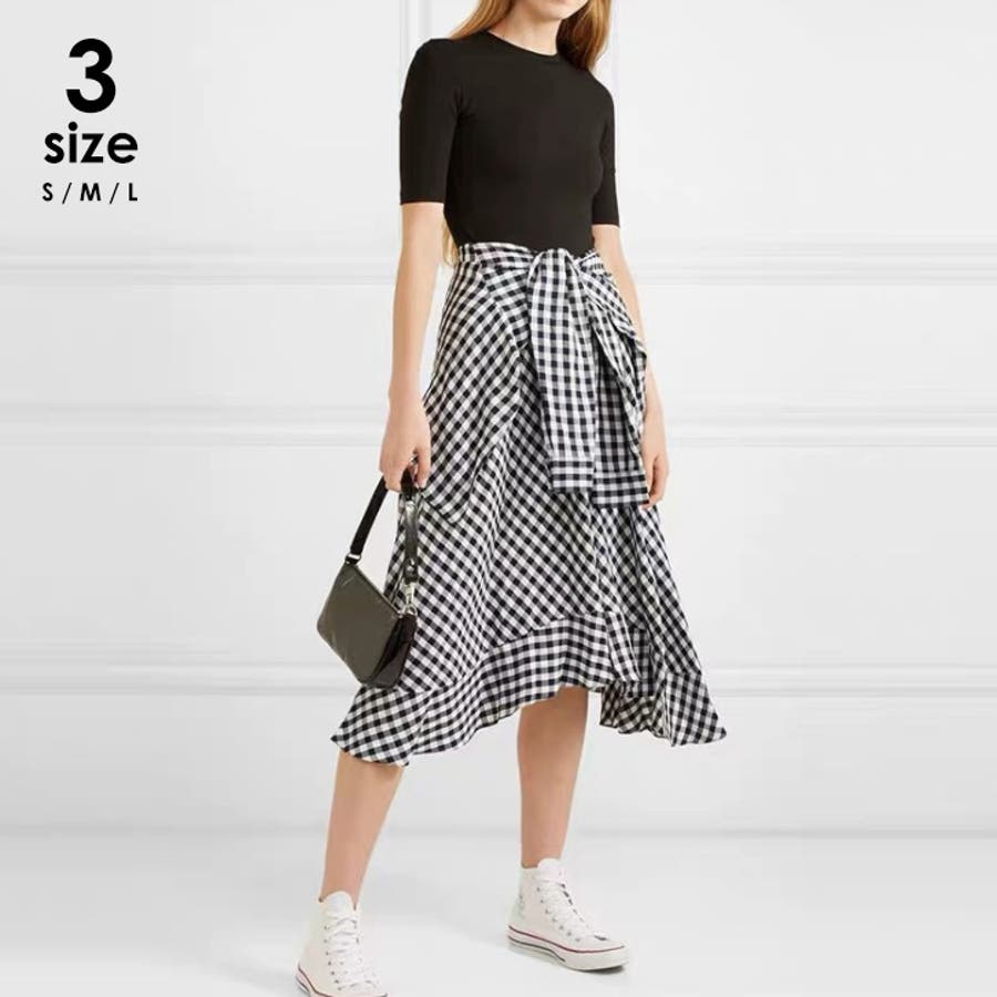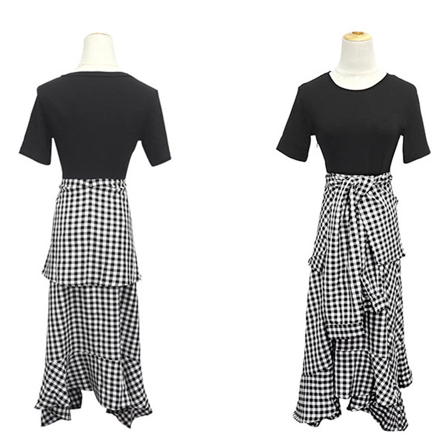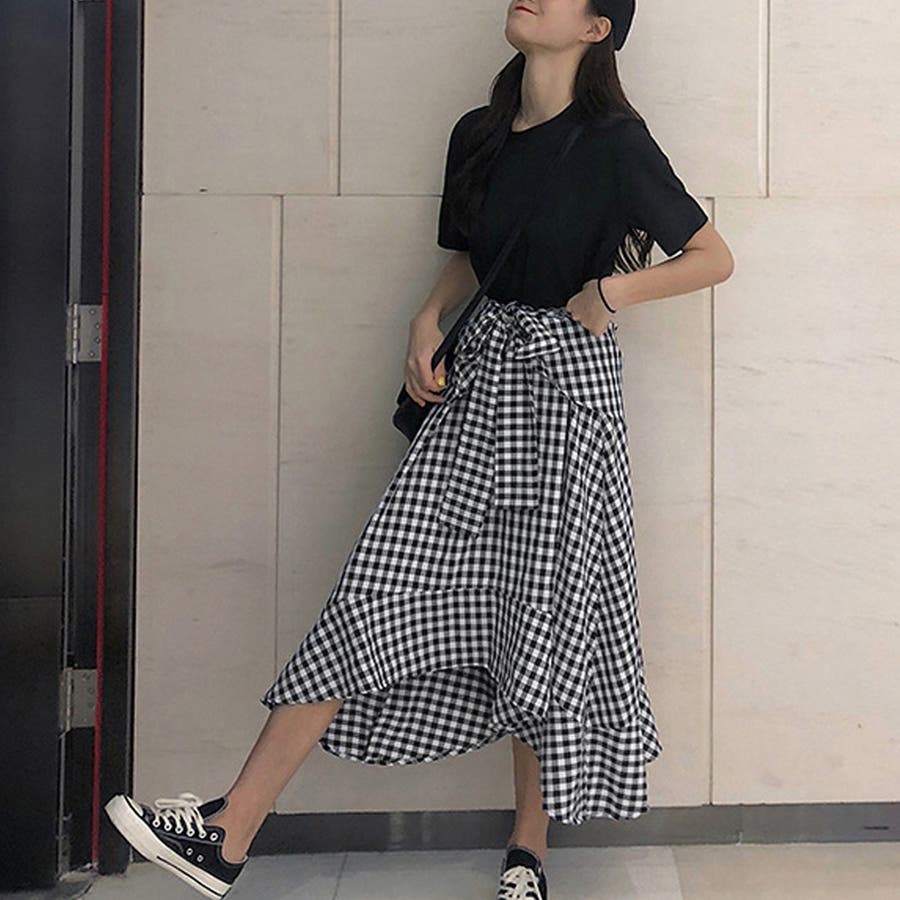 半袖カットソーとイレギュラーヘムラインチェック柄がガーリーで上品さを備えた印象を与えます