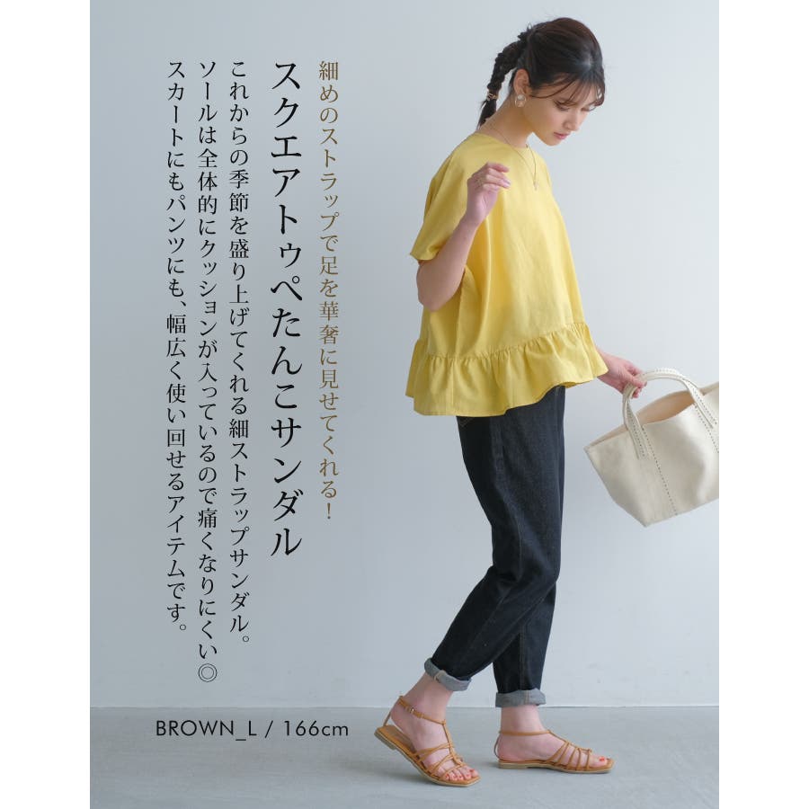 細めのストラップで足を華奢に見せてくれる! スクエアトゥぺたんこサンダル