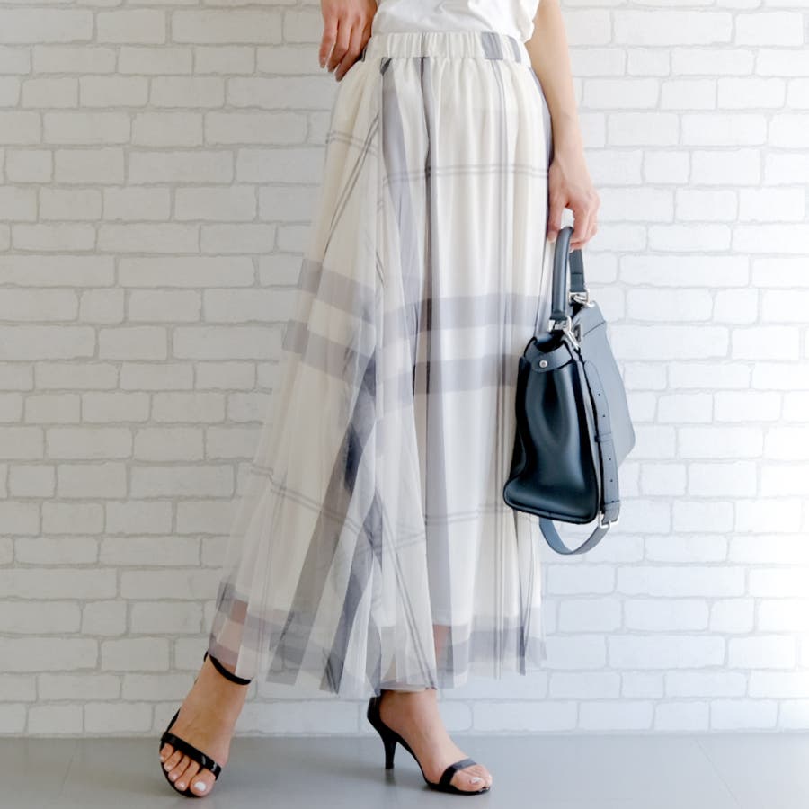 チェックプリントチュールギャザースカート チュールスカート チェック柄ウエストタックフレアスカート スカート レディース 春 夏 秋 M L ロング丈 ギャザースカート チェック柄 フレア ロングスカート ロンスカ ウエストゴム 美ライン きれいめ フェミニン 大人 上品 清楚 体型カバー ストレスフリー Aライン