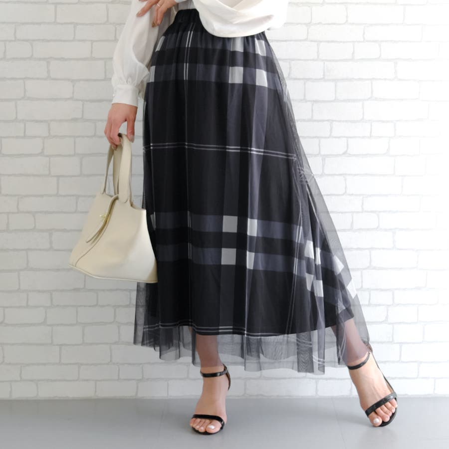 大人可愛いチェック柄のチュールギャザースカート