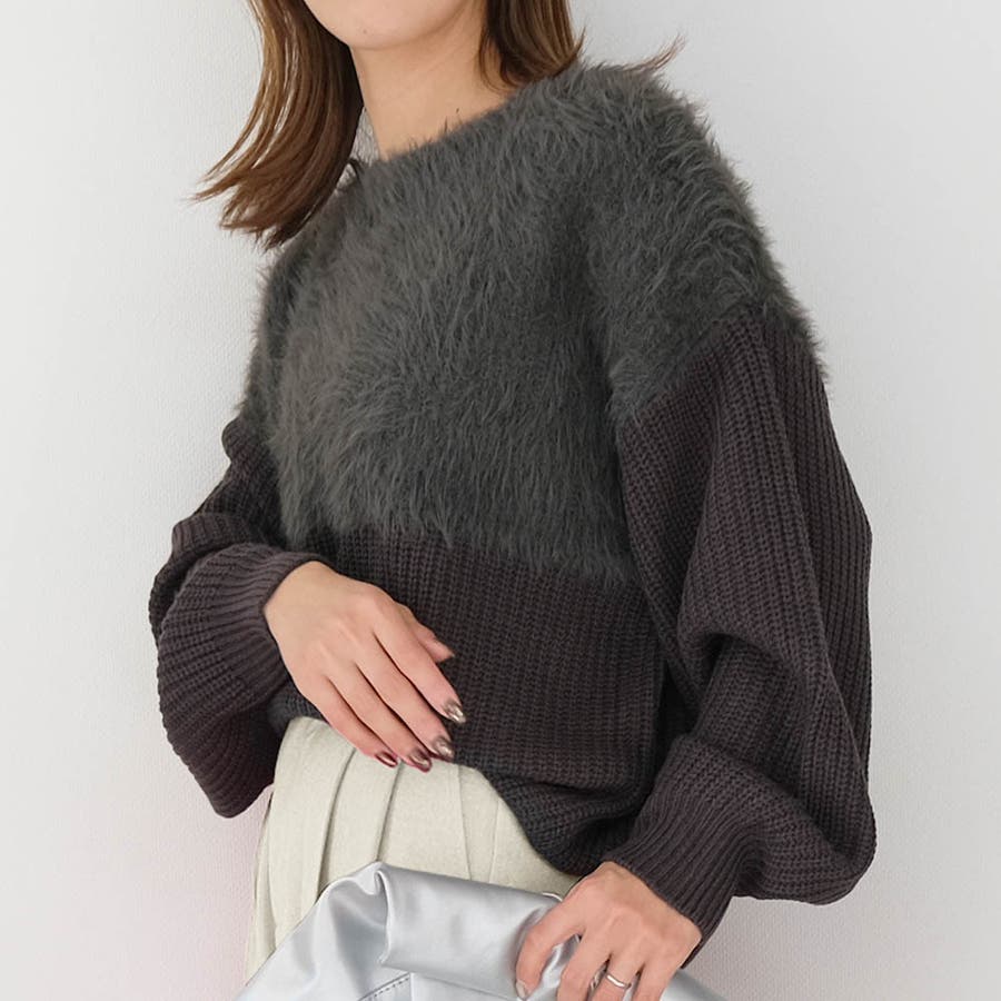 厚手で暖かいこのシャギーニットは、異素材の切り替えが魅力。