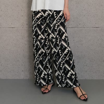 総柄でインパクトのあるボトムなので、トップスはシンプルでも着映え◎
