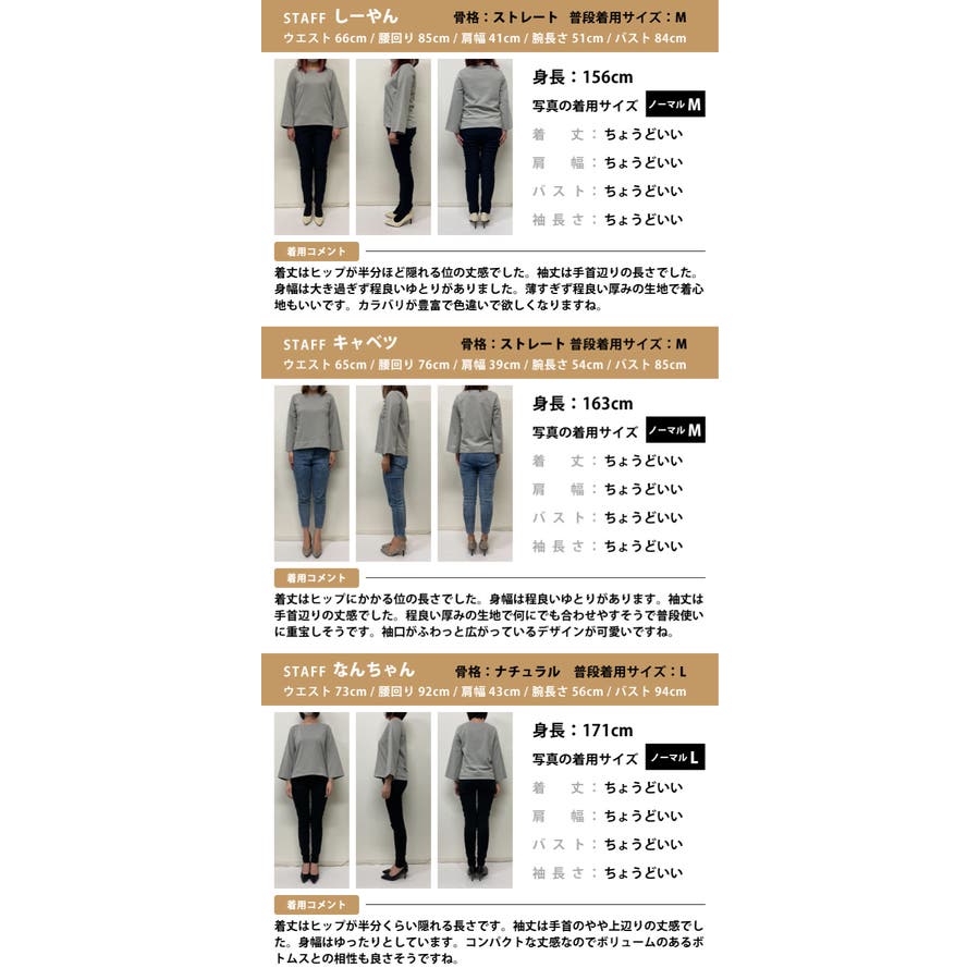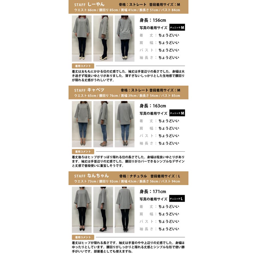 着丈:ノーマル丈57cm/チュニック丈73cm 肩幅:40cm バスト:100cm