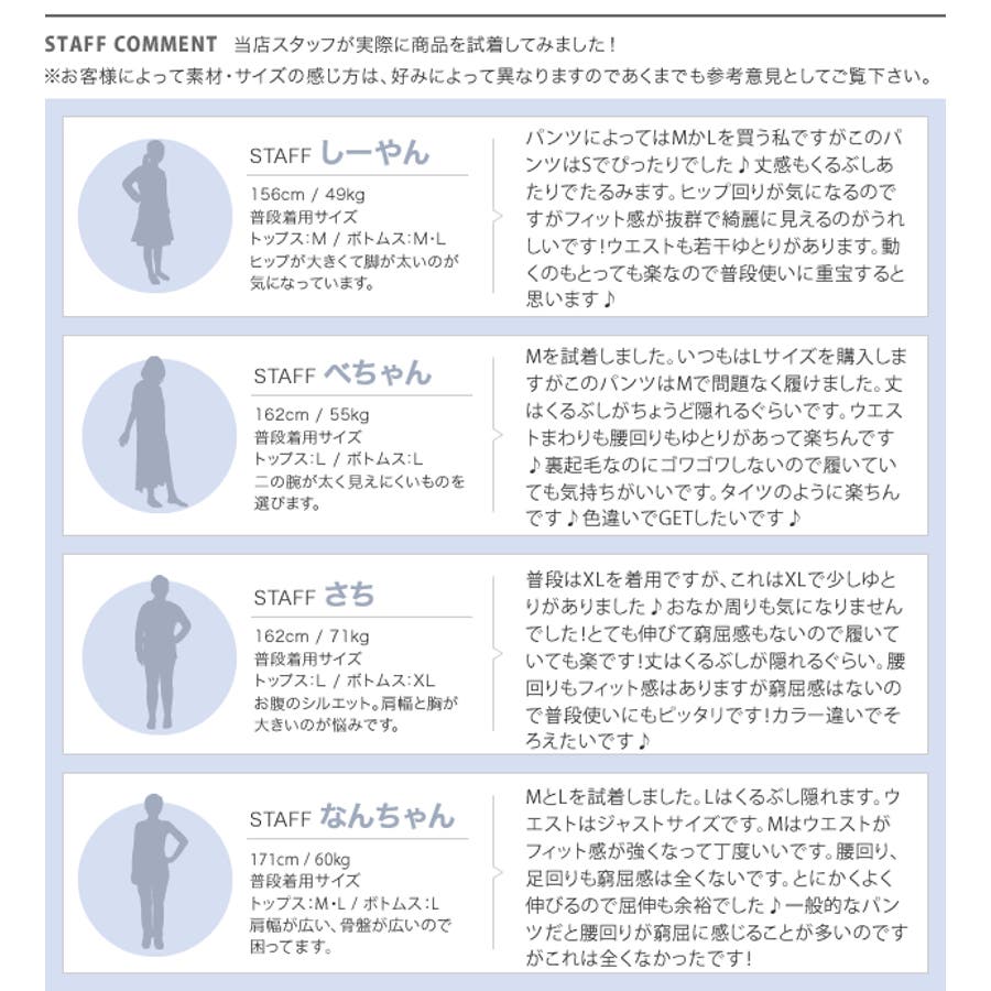 さん (40代 / 女性 / 身長155~160cm )購入アイテム:サイズ Lカラー ブラックいつものボトムスサイズ:Lサイズ感:ぴったり - 生地が薄い