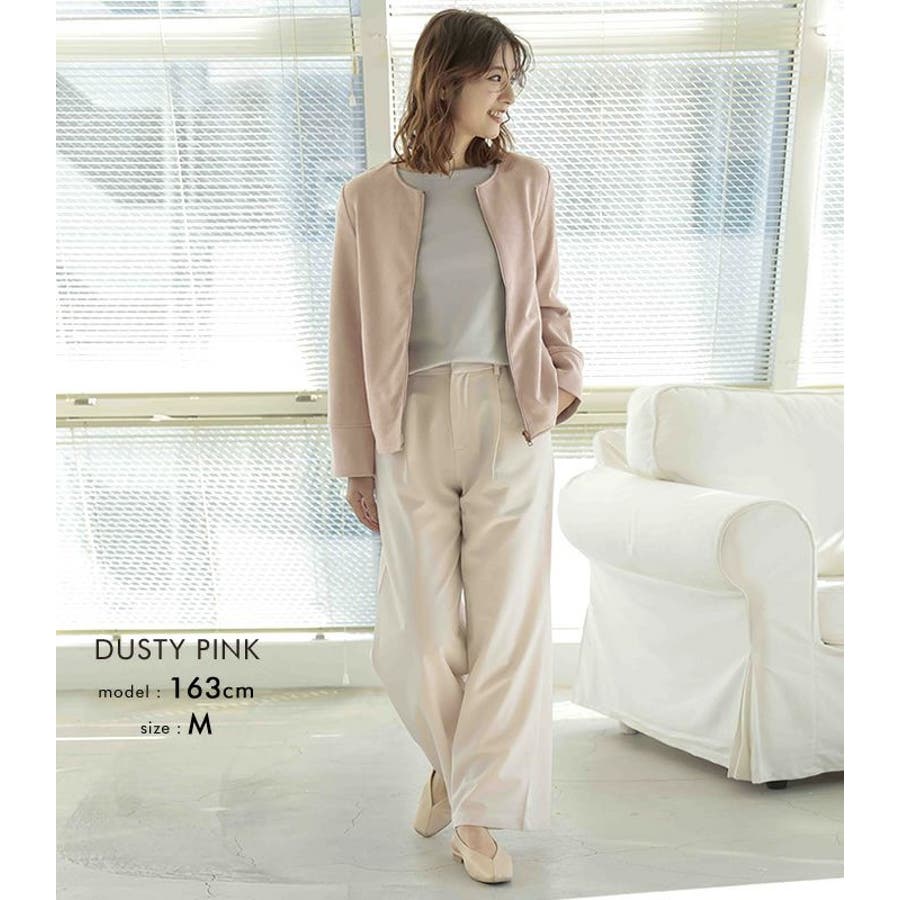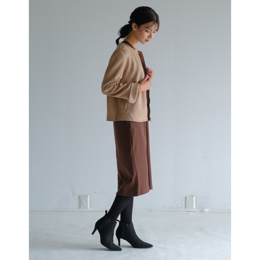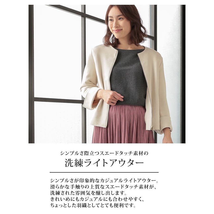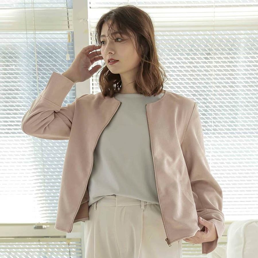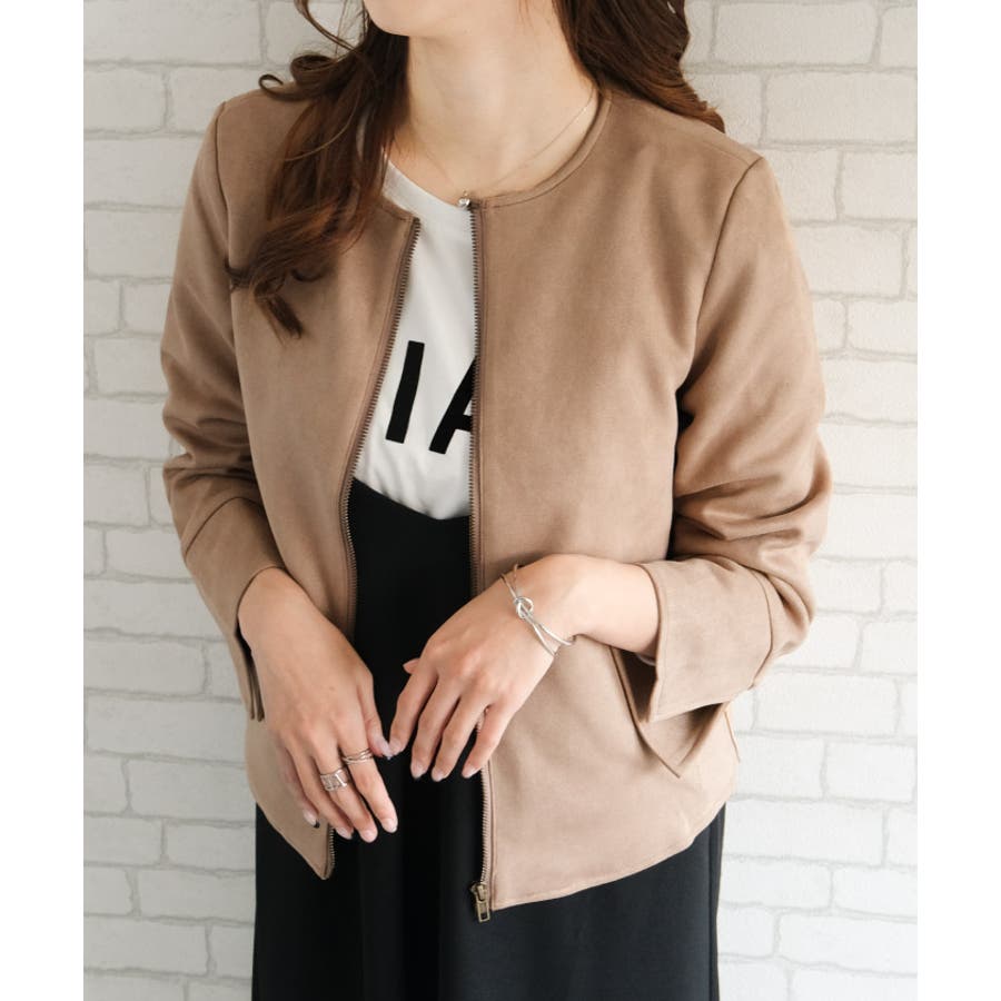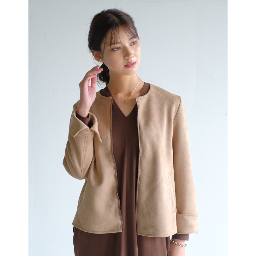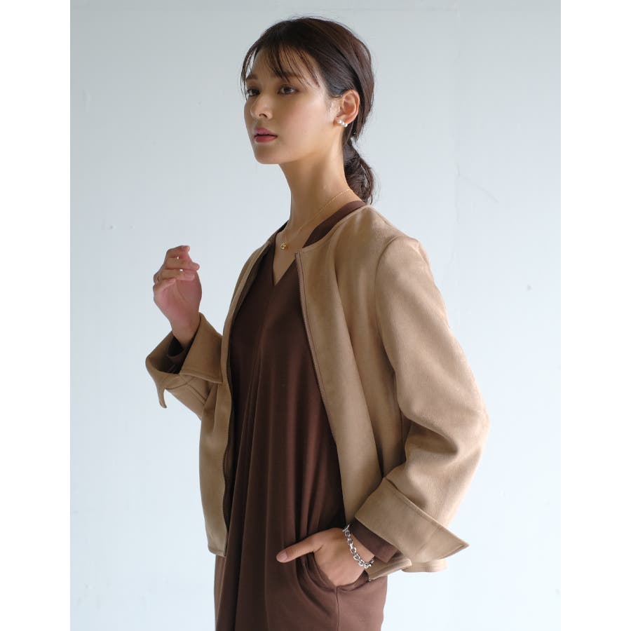 シンプルさが印象的!スエードタッチノーカラージャケット