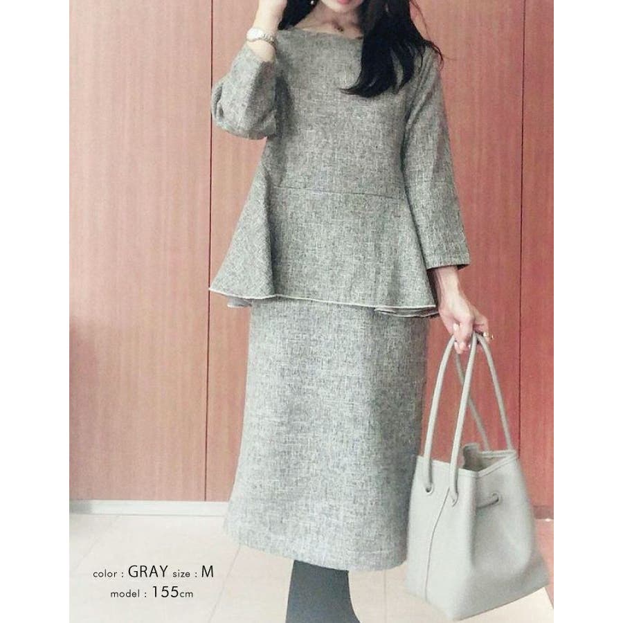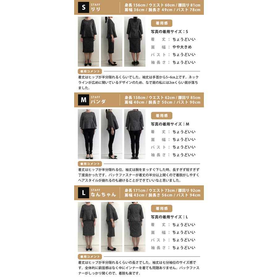 トップスは大きめなので、ワンサイズ下でもいいかも?と思いました。でも、普段に薄手のハイネック合わせて来ても可愛いかなと思って返品せずにそのまま着ることにしました。さん (40代 / 女性 / 身長165~170cm / 体重50~54kg)購入アイテム:サイズ Lカラー グレーいつものトップスサイズ:Lサイズ感:少し大きい - 冠婚葬祭にぴったりです!