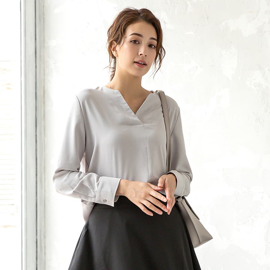 トップス シャツ ブラウス レディース 春 秋 長袖 Vネック ノーカラー スキッパー スキッパーシャツ とろみ ビジネス オフィスウェア オフィスカジュアル 通勤 上品 シンプル