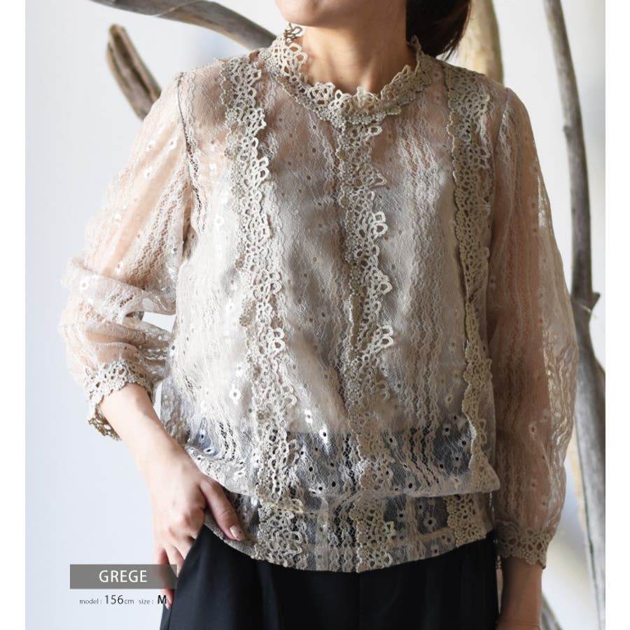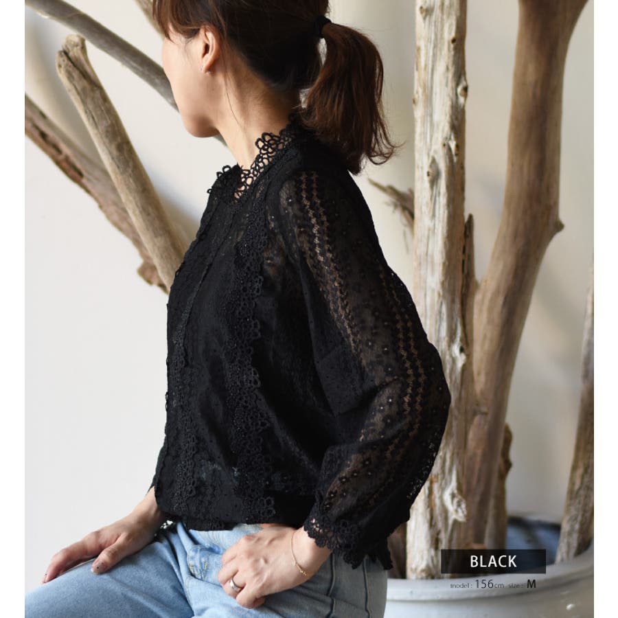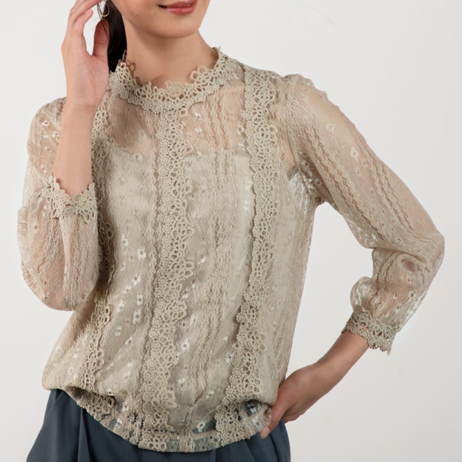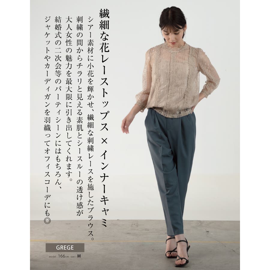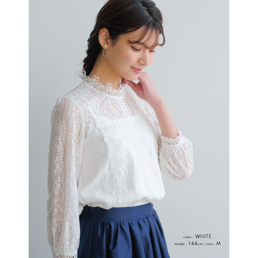 シアー素材に小花を輝かせ、繊細な刺繍レースを施したブラウス。