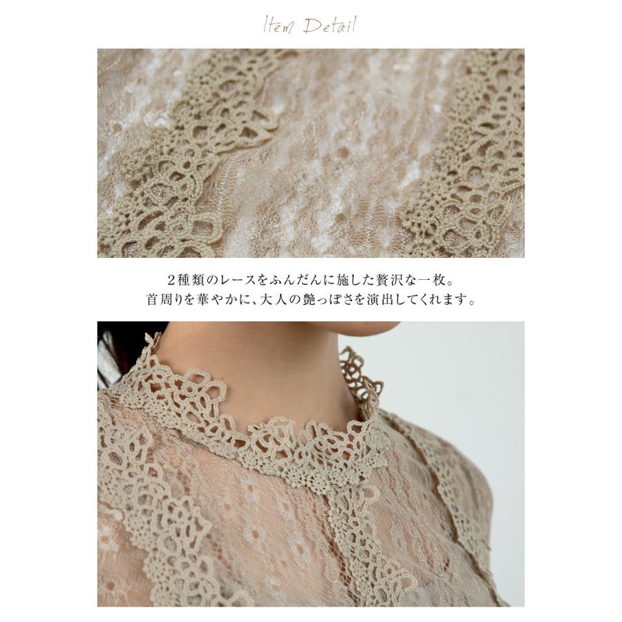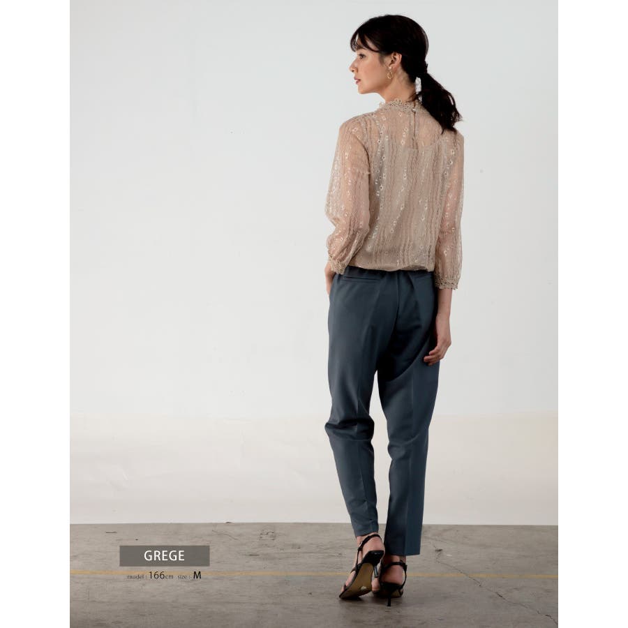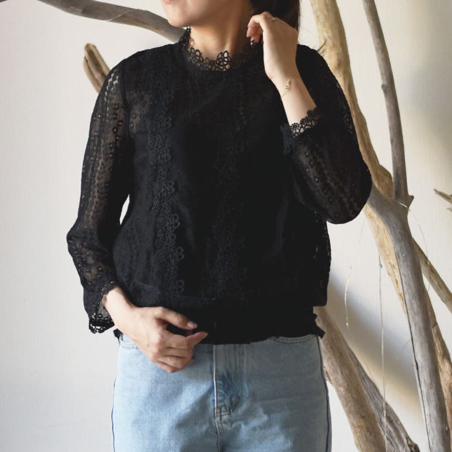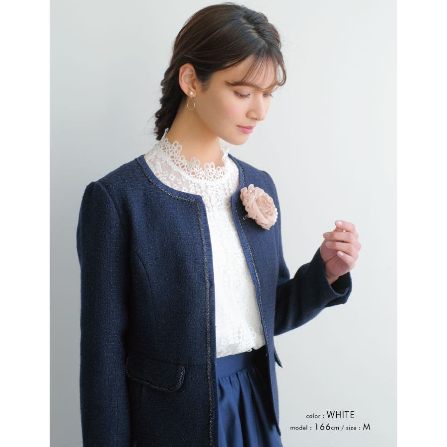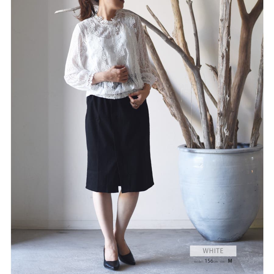 シアー素材に小花を輝かせ、繊細な刺繍レースを施したブラウス。