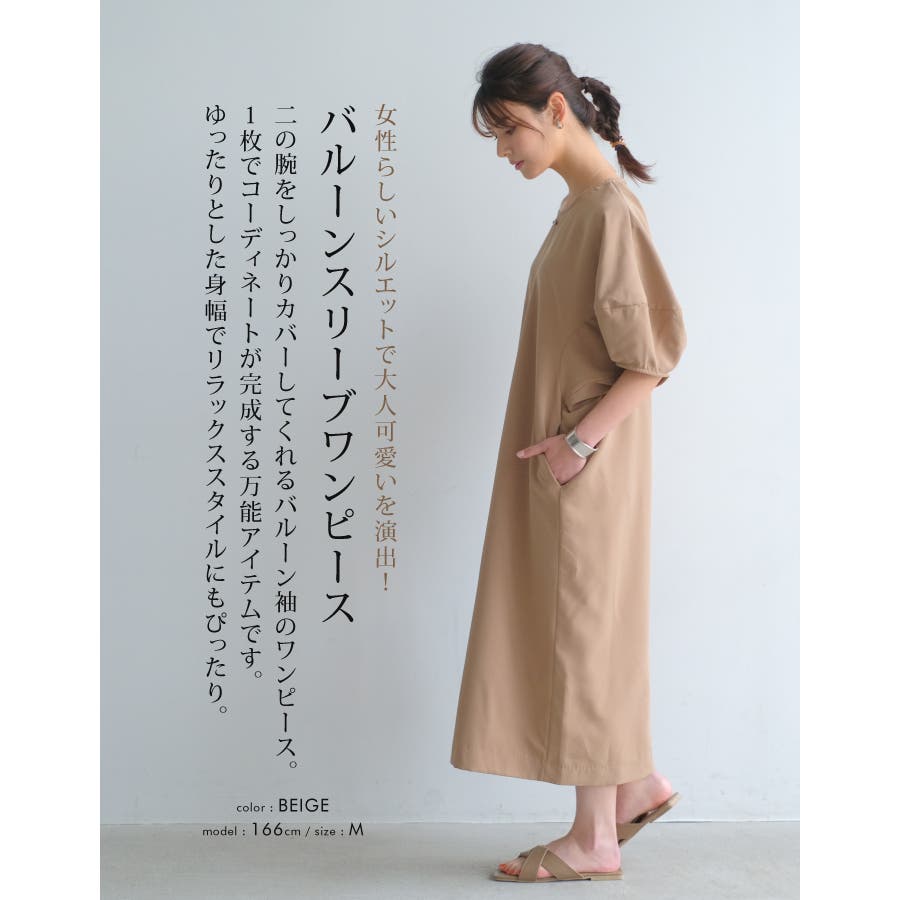 二の腕をしっかりカバーしてくれるバルーンスリーブのワンピース。