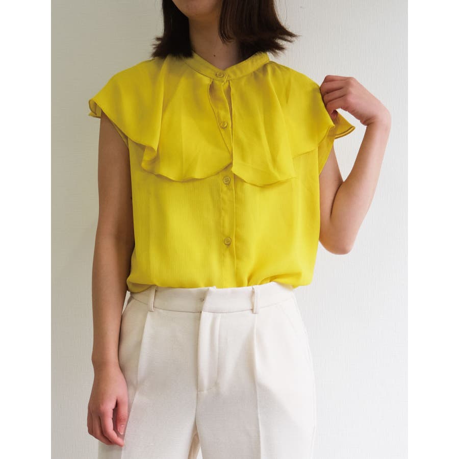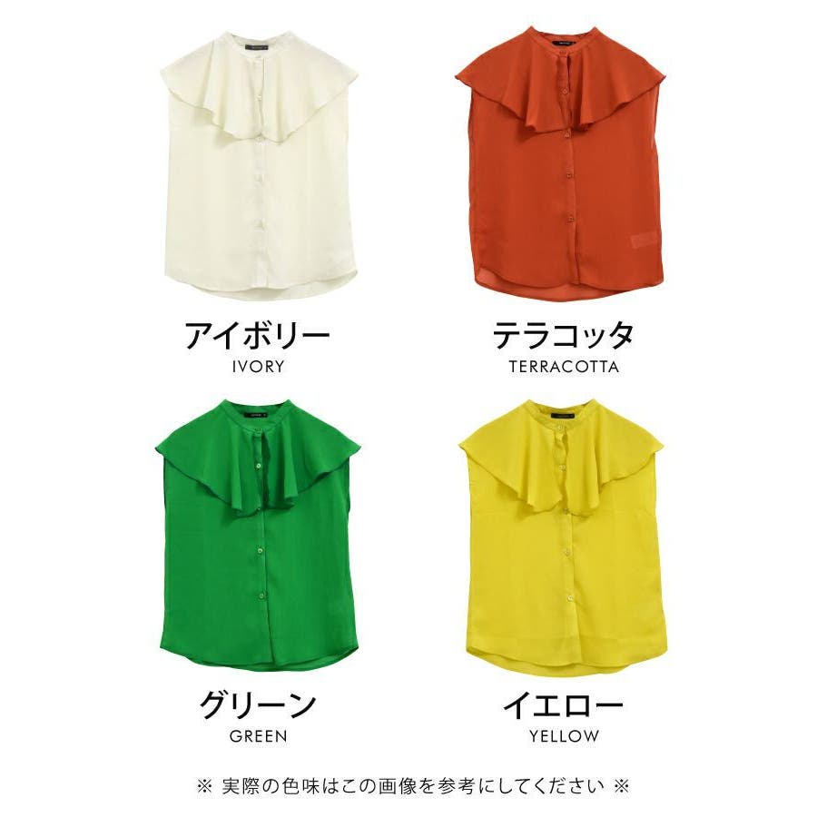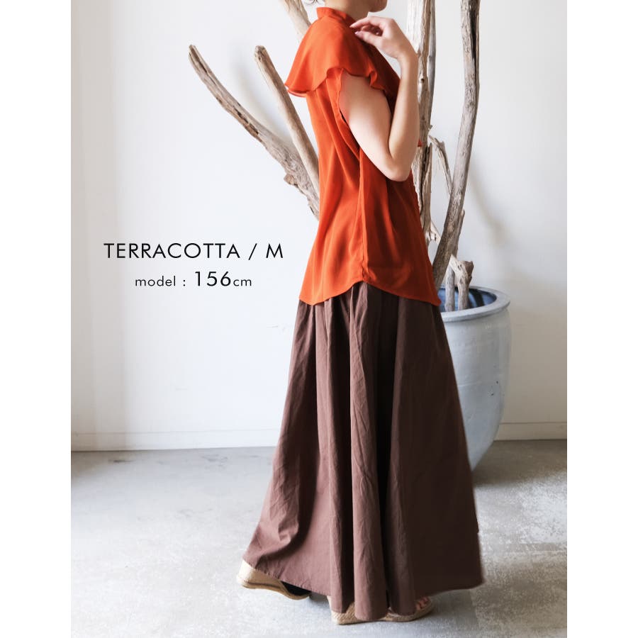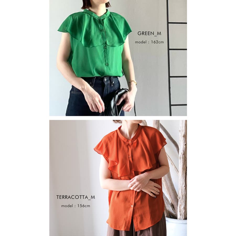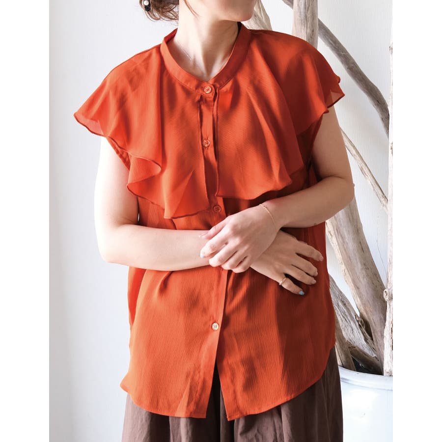 【テラコッタ】大きめなフリルで顔周り華やか。フリル襟ノースリーブブラウス