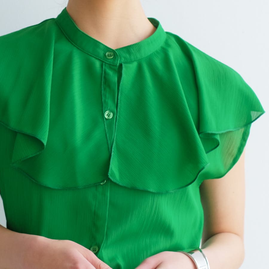大きいフリル襟は、肩先が隠れ気になる二の腕もカバーしてくれます。